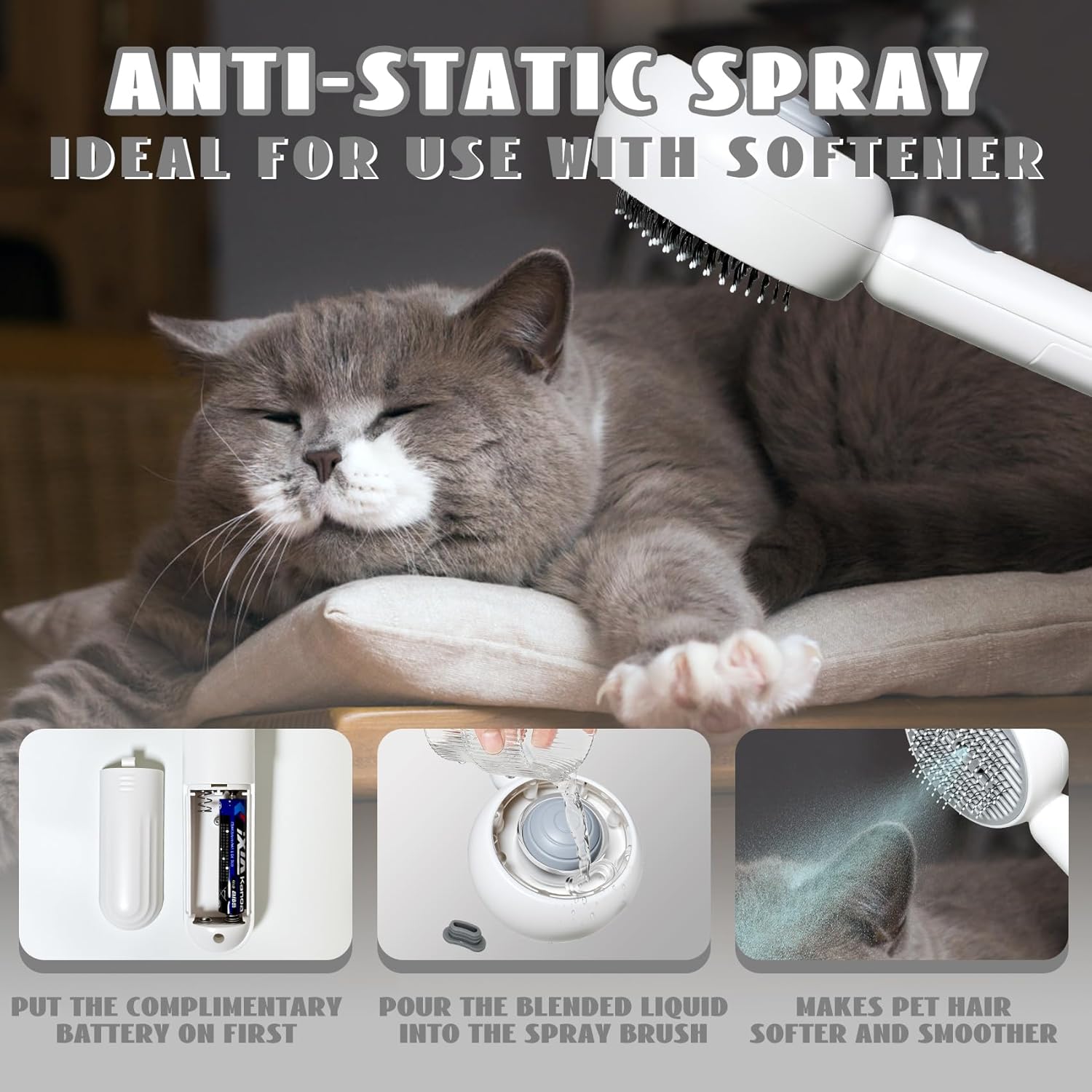 Product Description: Introducing our 2-in-1 Spray Cat Brush for Shedding and Grooming - the ultimate solution to keep your cat's fur in top shape while minimizing shedding and static electricity. With its unique spray function and water tank, this cat grooming comb offers unmatched convenience and effectiveness. Say goodbye to annoying static electricity and flying hair! Our spray cat brush effectively avoids the generation of static electricity, ensuring that your cat's hair stays where it belongs - on the brush and not on your clothes or furniture. The built-in water tank adds an extra level of convenience, allowing you to add water, deodorant, or hair softener while grooming. Keep your cat's fur fresh, soft, and pleasant-smelling with ease. Shedding control is made effortless with our pet hair removal comb. The steam brush helps to effectively remove loose hair and reduce shedding, leaving your home clean and your cat comfortable. The gentle and soothing grooming experience provided by our pet steam brush is loved by cats and dogs alike. It helps to massage their skin, promote blood circulation, and relax them during grooming sessions. Versatility and ease of use are key features of our cat brush with water. It is suitable for both cats and dogs, making it a versatile grooming tool for all pet owners. The release button allows for easy and convenient operation, ensuring a hassle-free grooming experience for both you and your furry friend. Invest in our 2-in-1 Spray Cat Brush for Shedding and Grooming today and discover the difference it can make in your cat's grooming routine. Say goodbye to excessive shedding, static electricity, and messy fur. Keep your cat looking and feeling their best with our innovative cat grooming comb. Order now and enjoy the convenience and effectiveness of this must-have pet grooming tool!