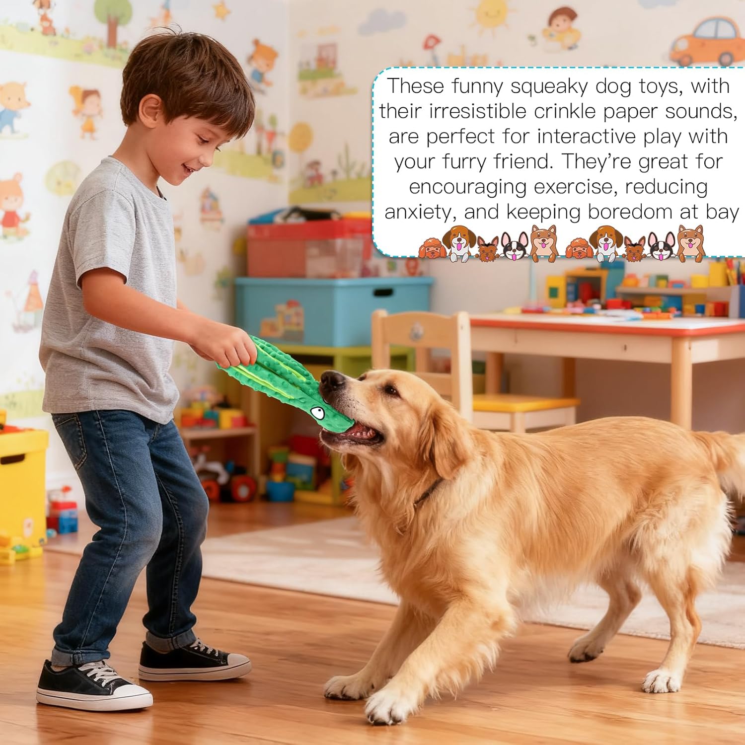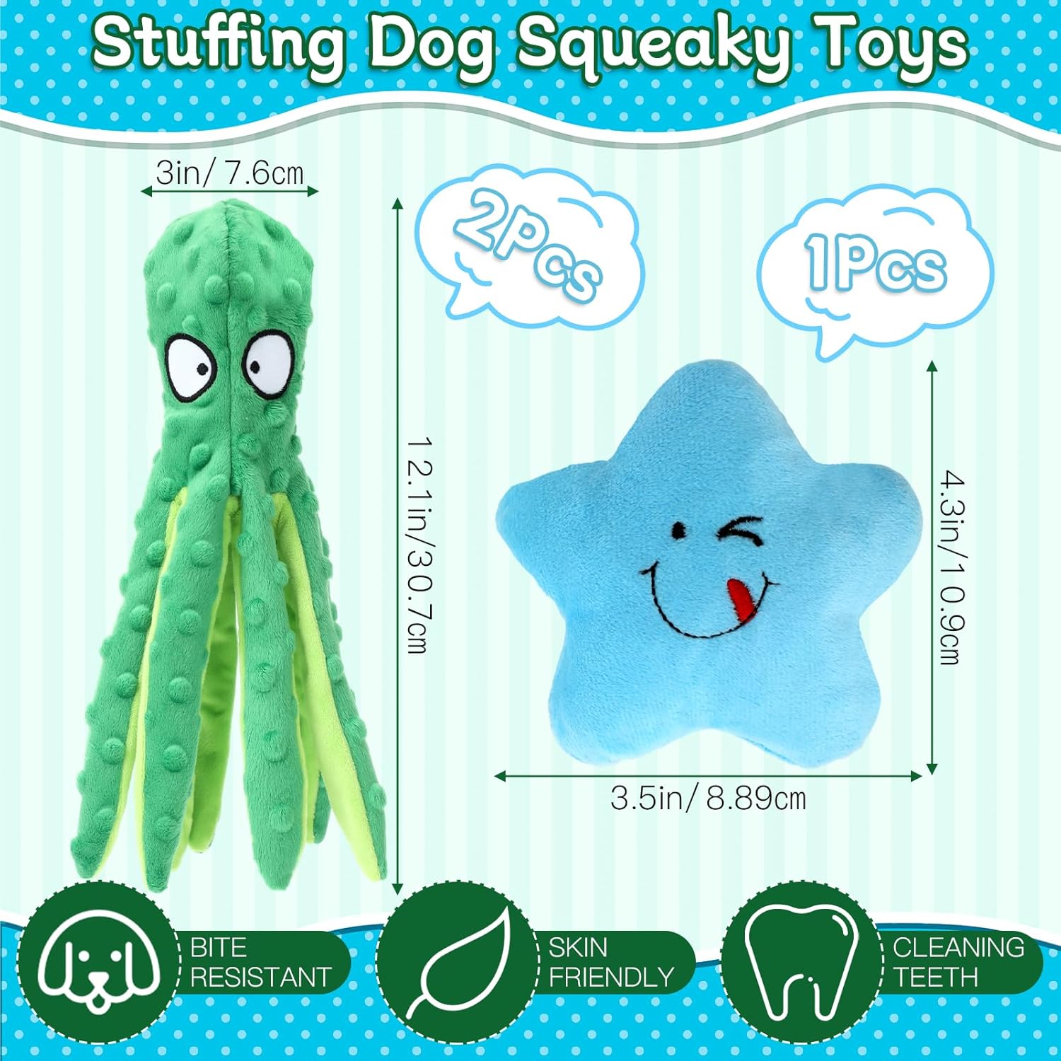 【Octopus Dog Toy】Our octopus toy is brightly colored and adorably designed; Dogs absolutely cannot resist it! Eight legs design makes it perfect for games of tug-of-war and fetch. The design ensures the toy is easy for your pet to carry, throw, and roll around, bringing joy and excitement to playtime. 【Squeaky & Crinkle Dog Toy】This dog toy has a squeaker in the head and crinkle paper sound in the tails. This will attract your dog’s attention immediately. As practical interactive puppy toys, it can help ease your dog's loneliness and reduces biting and barking by giving them a fun way to release pent-up energy. 【No-Stuffing Dog Toy】These plush dog chew toys are without stuffing, which means no dangerous stuffing hidden in our puppy teething toys, it is very safe for your puppy to chew and play with, without worrying about choking on or cleaning problems. You will not need to worry about the stuffing falling all over the room anymore 【No-Stuffing Dog Toy】These plush dog chew toys are without stuffing, which means no dangerous stuffing hidden in our puppy teething toys, it is very safe for your puppy to chew and play with, without worrying about choking on or cleaning problems. You will not need to worry about the stuffing falling all over the room anymore 【3 Pack Octopus Dog Toys】You’ll receive 1 green octopus plush dog toy, 1 blue octopus plush dog toy, and 1 blue starfish plush dog toy (total 3 pack). Designed specifically for teething puppies, small and medium dogs. Warm Tip: This product is not suitable for large dogs or aggressive chewers—please choose according to your pet’s breed and chewing habits › See more product details