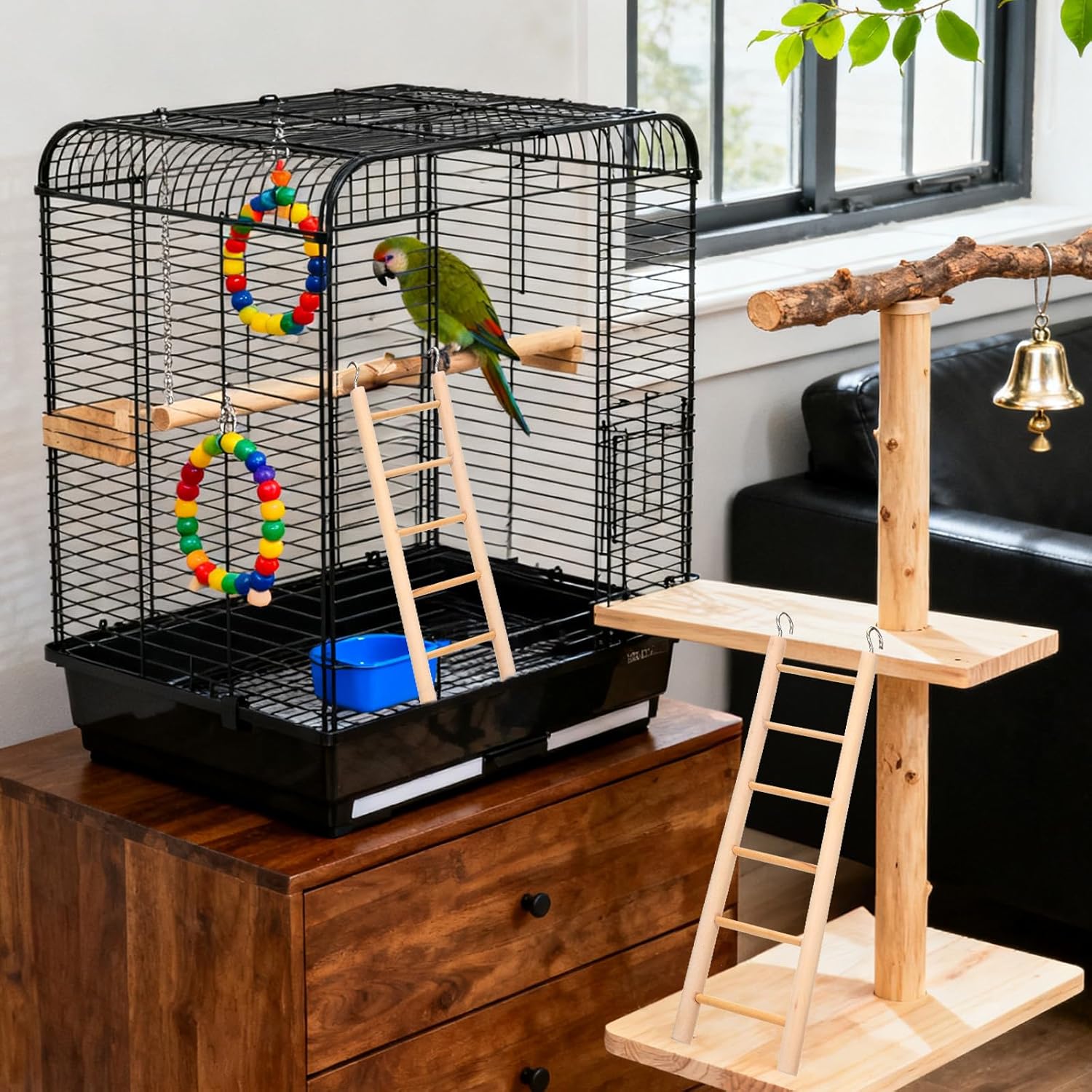 Product Name: Bird Cage LadderMaterial: Pine + IronColor: Wood ColorDimensions: From Large to Small: 28x7cm, 24.5x7cm, 21x7cm; Middle Ladder Width: 5.4cm, Interval: 4cm Packing List: 3 pcs Bird Ladders