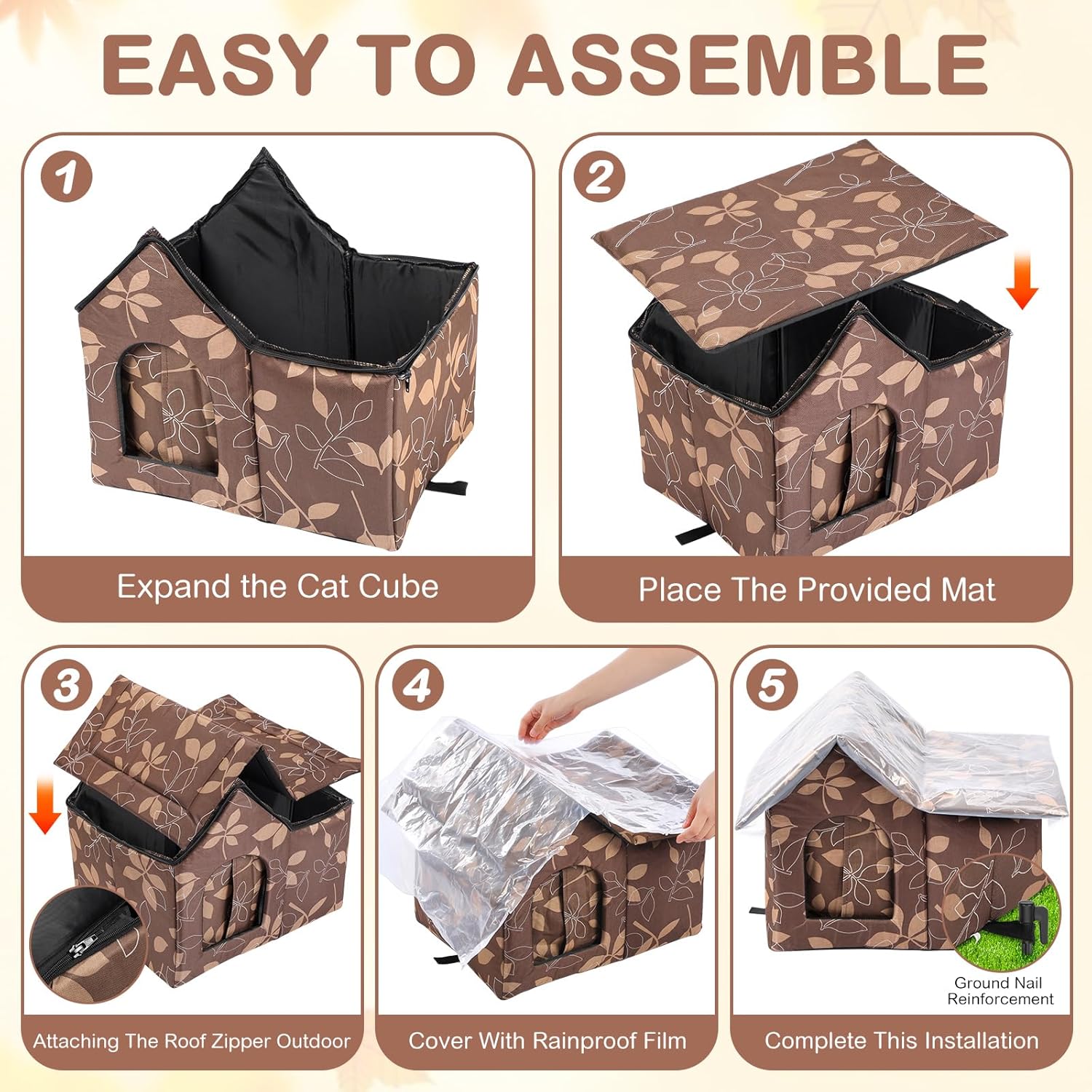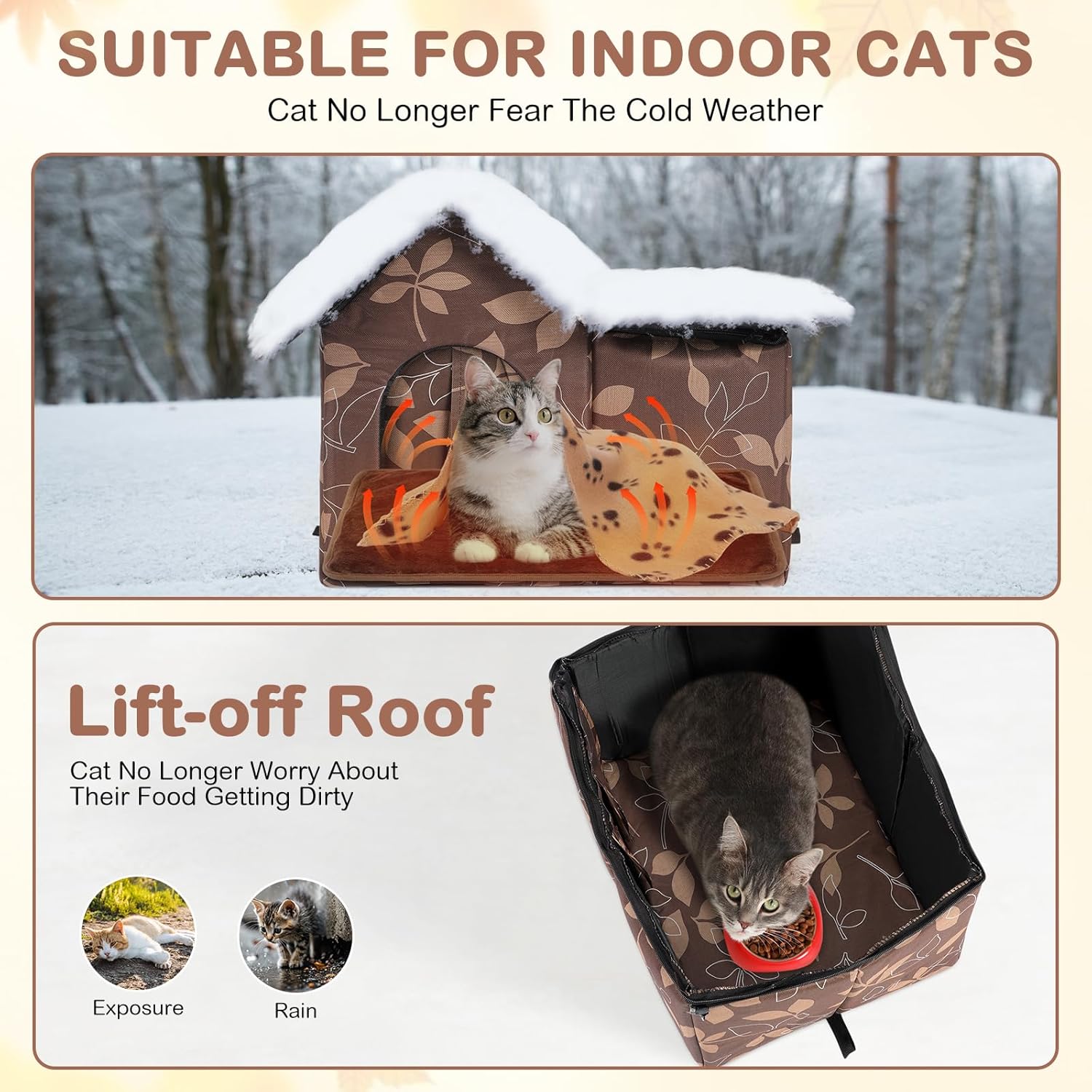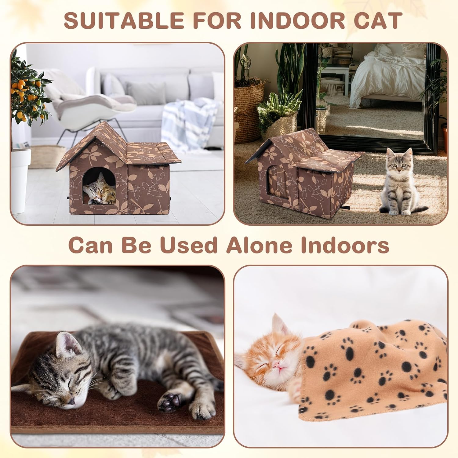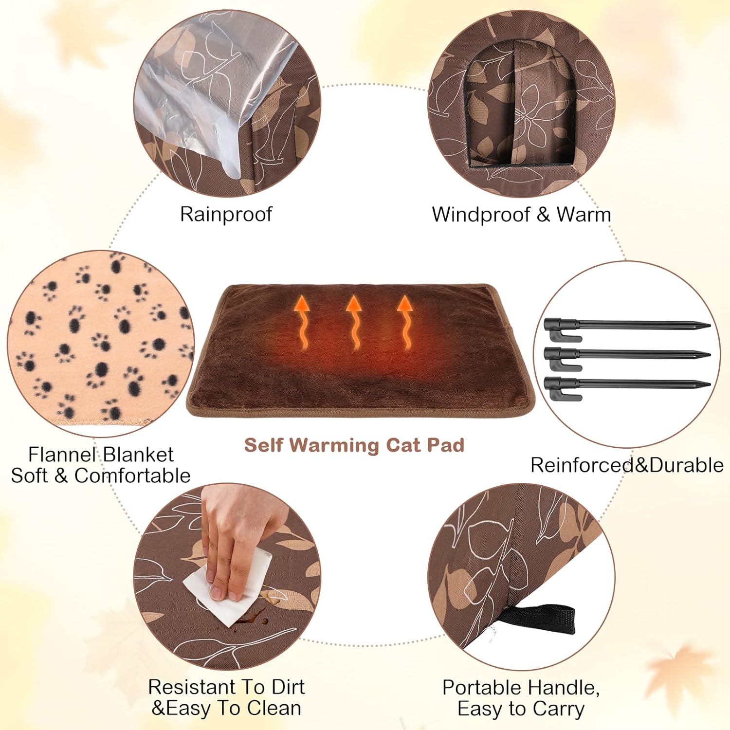 Features: Within this outdoor cat shelter package, you'll find everything your furry companion needs for Winter comfort: a PVC coated, scratch resistant exterior, and a plush, self-heating cat and small dog bed. The inside is lined with thick sponge and enhanced by generously thick plush fibers to lock in heat, making this outdoor cat bed perfect for Winter months. A charming paw print, ultra soft flannel blanket adds an extra layer of indulgence, ensuring your cat beds for outdoor cats are every bit as snug as they are stylish. Embrace the beautiful leaf patterning that blends seamlessly into garden or outdoor settings, while its distinctive design maintains outdoor cat house weatherproof integrity. Perfect for any climate, our outdoor cat beds for Winter offer ultimate warmth and protection. Don't miss out on this adaptable outdoor cat weatherproof shelter that fulfills all your pet's needs. Specifications: Material: PVC Color: coffee Size: about 21.26 x 17.72 x 14.96 inches/ 54 x 45 x 38 cm Package includes: 1 x Weatherproof Outdoor Cat House set Notes: Manual measurement, please allow slight errors on size. The color may exist a slight difference due to different screen displays