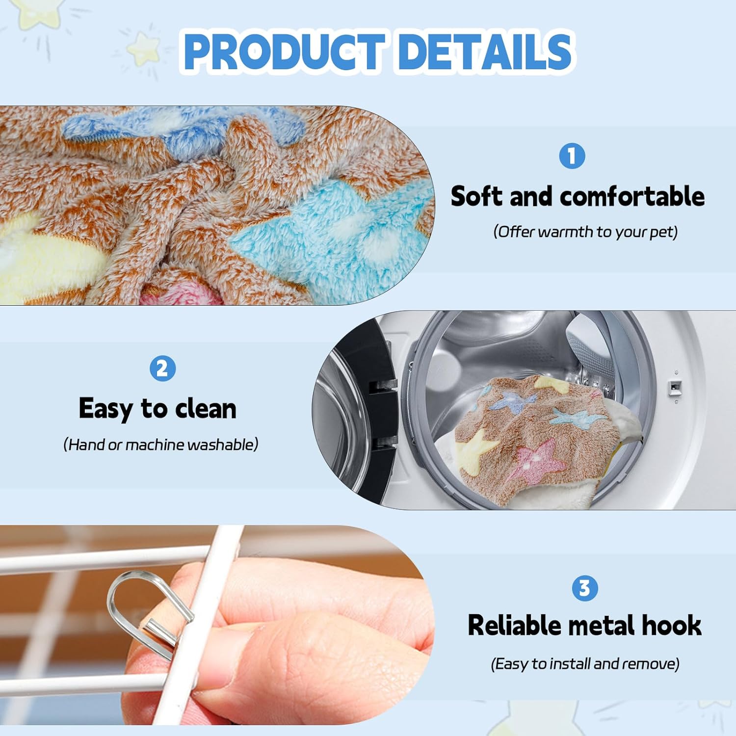 About this item SOFT & COZY: The material of the ferret hammock is made of coral velvet and arctic fleece, providing an comfortable spot for your small pets to rest and play, promoting a sense of security and relaxation EASY TO OPERATE:the 4 corners of the guinea pig hammock are equipped with metal hooks linked with straps,which is designed to attach to the small pet cage. The hammock can be washed by hand or machine, please remove the 4 m3etal hooks before washing HIGHLY PRACTICAL: The double hanging hammock design can make full use of the large space of the cage. It can not only be used as a bed for small animal to rest, but also simulate the wild life environment for climbing in and out of the hammock, adding fun. This is a practical pet hammock DURABLE METAL HOOK- Equipped with high-quality hooks, rust-resistant, wear-resistant and firm. Hooks easily attach the chinchilla hammock to any cage with bars or grills, ensuring a safe and secure pet hammock PRODUCT INCLUDES : The package contains 3 pcs of small animal hammocks in different patterns, yellow carrot,caramel starfish,grey bear. The rat hammock for cage measures 11×11 inches and is suitable for hamsters, ferrets, gliders, guinea pigs, squirrels, chinchillas, guinea pigs, etc., it is a good choice for picking up a gift for your beloved pets › See more product details