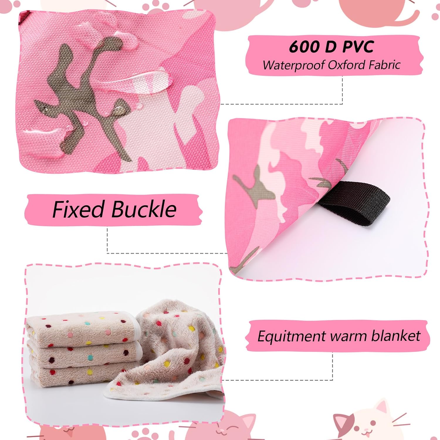 Features: Designed for Indoor and Outdoor Use: While this is an excellent outdoor cat shelter, it's also suitable for indoor use. Whether you want to provide an enclosure for your indoor cat or want to keep your outdoor cat safe from harsh weather changes, these feral cat shelters work perfectly in every setting. Features Designed: Our outdoor cat shelter makes pets comfortable in any season. Thick pads can add warmth during the colder months and can be removed during the hot season. With this outdoor cat shelter, your cat will stay comfortable in any weather. Specifications: Material: waterproof Oxford Color: pink Size: 40 x 35 x 40 cm Package includes: 3 x Outdoor Cat House 3 x Thick Cushion Notes: Small items are included, please keep them away from pets in case of choking risk. Before purchase, confirm whether the product size is suitable for your pet, and observe the pet's reaction when using. Please remove the product in time if there is any discomfort
