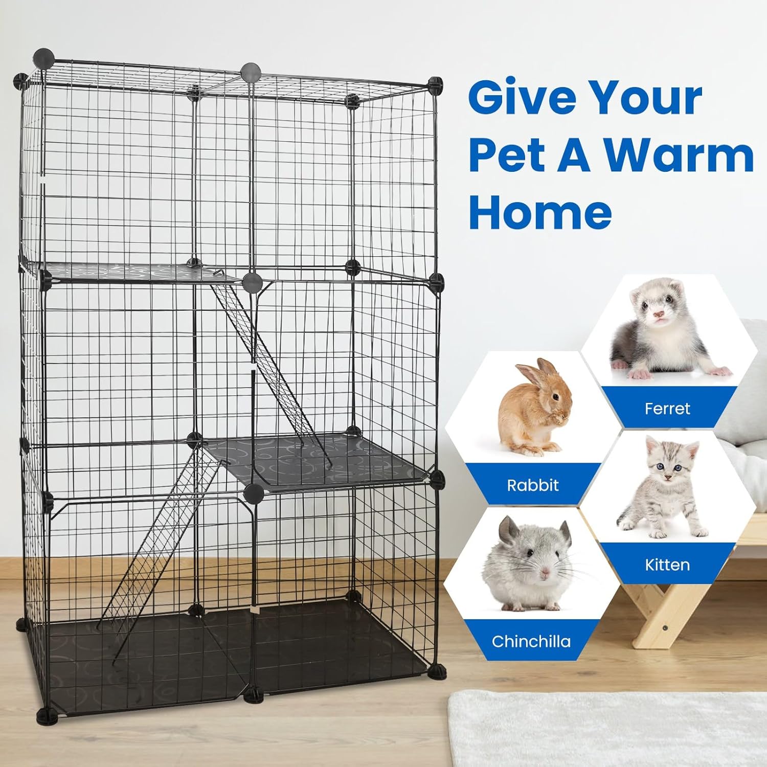About this item 3-Tier Cat House: All-in-One Space for Your Furry Companion This 3-tier cat house is a versatile haven designed to meet all your cat’s daily needs—offering dedicated areas for playing, napping, eating, and drinking. Beyond catering to your pet, it also features ample storage space for cat supplies, eliminating the clutter of scattered toys, food bags, or grooming tools. Keep your living space tidy and organized, free from the hassle of messy cat essentials. Sturdy Construction for Safe & Free Movement Ideal for 1-2 small to medium-sized cats, this 3-tier cat villa boasts 3 convenient entry/exit doors, allowing your feline friends to move in and out with ease. Equipped with 2 gentle-slope ladders, it enables flexible climbing without straining your cat’s joints. The robust structure ensures each tier can safely support up to 14 lbs, resisting cracking, bending, or falling apart even with daily use. Durable Iron Material: Built to Last Through the Years Crafted from thickened iron pipes, our cat cage delivers exceptional durability and stability. The rounded plastic fasteners add an extra layer of safety—protecting your hands from scratches during assembly and preventing any harm to your curious cats. Designed for longevity, this cage will be a reliable companion for your pet, from their playful kitten days to their senior years. Complete Accessories for Customizable Setup We provide a full set of accessories required to assemble the 3-tier cat house. What’s more, you can rearrange these components to create different sizes and configurations according to your preferences. Let your creativity shine and build a one-of-a-kind, customized home tailored specifically for your beloved cat. Easy Cleaning & Multi-Pet Compatibility Featuring rust-resistant materials, this cat house is a breeze to clean—simply wipe it down with a soft cloth to keep it fresh and hygienic. While perfect for small and medium cats, it also suits other small pets such as ferrets, rats, rabbits, kittens, and chinchillas, making it a versatile choice for multi-pet households. Notice: Our cages are suitable for weights between 9-14 pounds. › See more product details