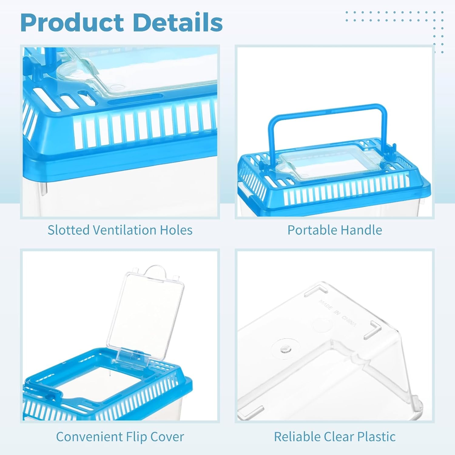 About this item Multi-Color Sorting: Includes 30 clear boxes with 5 colored lids—green, blue, yellow, pink, red—for instant visual sorting; great for classifying different pets or marking individual tanks in a busy environment Versatile Application: Suitable for tarantulas, lizards, snakes, turtles, fish, frogs, or little reptiles; also functions as a temporary aquarium or hatching box; helpful for science class, home breeding, or pet travel Secure Flip Lid: Each enclosure features a tight slide-to-lock lid with flip hatch for easy feeding and cleaning; ventilated slotted design promotes airflow while preventing escapes; portable handle enables effortless carrying High-Transparency Material: Made from thick, transparent plastic for 360° observation; lets you watch animals, eggs, or plants clearly from any angle; great for monitoring behaviors, growth, or health without opening the lid Reusable & Stackable: Reinforced structure supports repeated use—easy to clean, stack, and transport; smooth, sturdy edges resist cracking; lids fit firmly so tanks stay stable when storing multiple units at home, or in the outdoors › See more product details