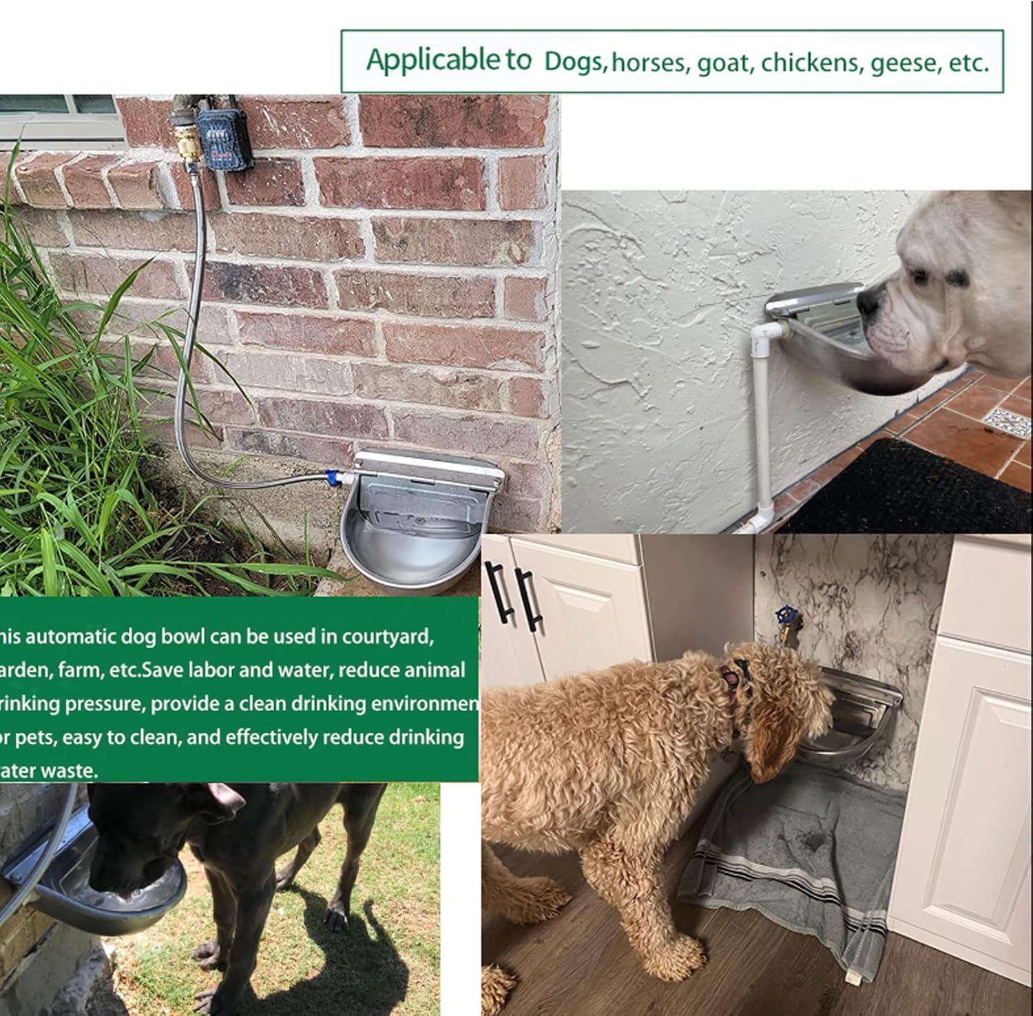 About this item -Working Principle: Use the float ball water level floating principle, the floating ball rod is connected to the valve, and when it rises to a constant level, the rubber piston will close the valve. When the water level drops, the float also drops, and the rod drives the piston to open. It keeps the water bowl full of clean water at all times. -Material: This automatic livestock water bowl is Made of the high quality 304 stainless steel ,not easy to deformation, no rust, ,and easy to clean -Wide application: The fully auto animal drinking waterer can be used in courtyard, garden, farm, etc. It is very suitable for small and medium livestock animals such as horses, goat, dogs, chickens, geese, calves, alpacas, etc. -Save labor and water, reduce animal drinking pressure, provide a clean drinking environment for pets, easy to clean, and effectively reduce drinking water waste. It can holds about 2.5 liters water (0.66 gallons) Large capacity for your pet's water needs. -Regarding the specifications of the 39" long water hose: As soon as we received feedback on the water hose, we replaced it with a new batch of 3/4" female GHT water hose. NOTE: Please check whether the waterproof gasket of the water hose is damaged. Sometimes over-tightening can cause the gasket to break and leak water. If the water hose you received still leaks, please contact us directly and we can give you a free Replacement or refund ! › See more product details