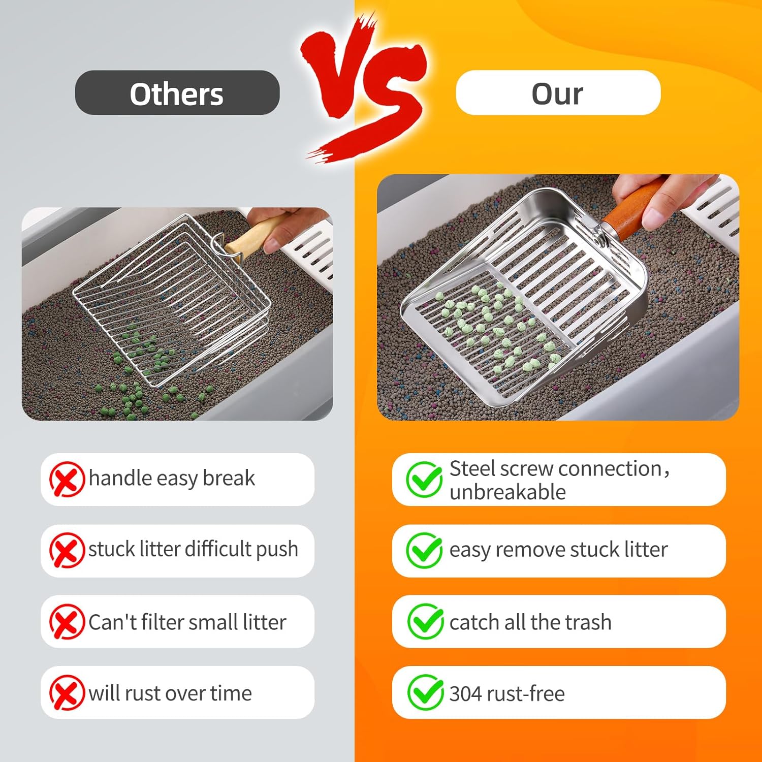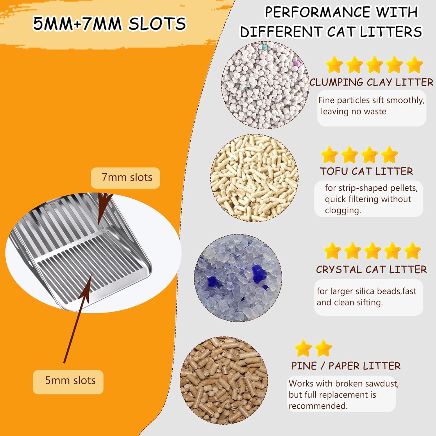Made from 0.7mm thick 304 stainless steel, this cat litter scoop is rust-resistant, sturdy, and long-lasting. Unlike aluminum scoops that often break or welded scoops that may crack and rust at the joints, our one-piece stamped metal design has no weld spots, delivering superior strength, toughness, and reliability. Designed for clumping litter, the flat-edge cat litter scoop easily slides under stuck-on waste. Strong enough to handle heavy, wet clumps without bending, it keeps your litter box scoop in top shape—perfect as a litter scoop or poop scooper for everyday cleaning. Front mesh spacing is 5mm to sift fine debris, while the rear spacing is 7mm for larger clumps. Traditional scoops often miss small clumping particles, but this upgraded design removes both tiny clumps and large pieces in one motion, reducing litter box contamination and keeping your cat’s box cleaner. The screw-fixed handle prevents breakage, making this cat litter scoop more durable than typical aluminum or welded scoops. Most loosened handles happen simply because they weren’t fully tightened—once secured, the handle stays firm for long-term use. The ergonomic grip ensures comfortable handling, and the built-in hook lets you hang the scoop neatly or place it upright in the included holder for convenient storage. The smooth, seamless stainless steel scoop prevents litter from sticking, making cleaning quick and effortless. Rust-free even after long-term use, this cat litter scoop stays hygienic and ready for daily litter box maintenance. › See more product details