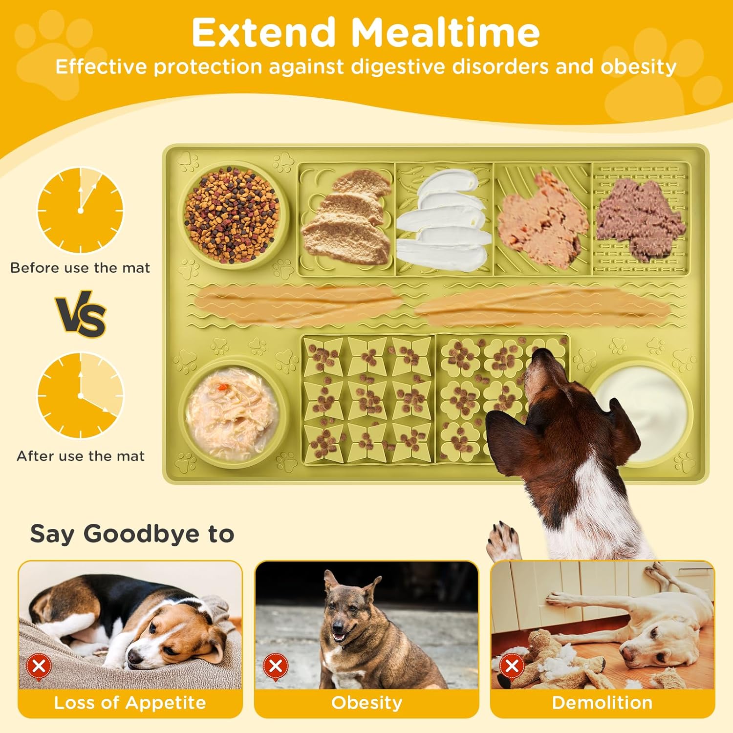 About this item This oversized licking pad measures 31.5 inches by 20 inches and is suitable for small, medium and large dogs. Our snuffle mat for dogs features multiple functional zones, including the water bowl area, dry food area, wet food area and slow food area, meeting all the dietary needs of pets. It is also applicable to families with multiple dogs. Safe and durable, the lick mats for dogs made of high-strength silicone (thicker than standard pads), thick and soft, and tough enough to withstand enthusiastic licking and slight chewing. The sturdy thickness ensures no tearing or warping - it can be reused The 44 medium-sized suction cups at the bottom of this treat dispensing dog toys can firmly grasp various ground surfaces, such as glass, ceramic, metal, wood, etc. (they won't slide when the dog licks them!) At the same time, It's easy to clean: rinse it with warm water, wipe it clean, or put it in the dishwasher. Turn eating or dealing with time into a slow and stimulating activity! The slow food area of the dog enrichment toys has diverse texture zones (such as clover, waves, fish bones, floral patterns, etc.) will make your dog eat every bite, preventing it from swallowing in big gulps and quickly (which is helpful for digestion). It is very suitable for relieving anxiety when bathing, grooming or licking alone, keeping the puppy relaxed. As your pet licks the diverse patterns, the textures gently massage gums and clean teeth—boosting dental health. Plus, the unique designs of our snuffle mat for puppies keep your dog mentally engaged, fighting boredom and encouraging natural foraging behavior. › See more product details