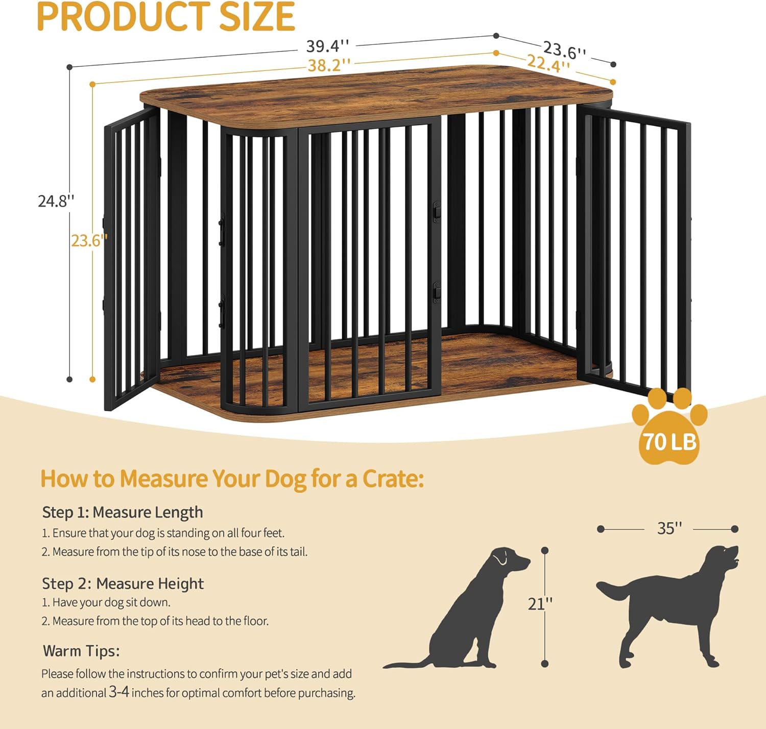 About this item This dog crate furniture has internal dimensions of 39.4"L x 23.6"W x 24.8"H, suitable for Border Collies, Golden Retrievers, and Huskies, etc We use 10mm wide iron pipes, double welded joints, and thickened engineered wood for anti-chewing. Two latches are installed at the doorway to protect from escape Our dog crate doors can be opened from the front and the side, making it suitable for placement in various corners. It also features double locks for easy entry and exit for your dog Our modern-style dog cage furniture is not only an indoor dog kennel, but can also be used as a coffee table, end side table, or bedside table Dog cage for high anxiety dog that four-sided railing design makes the room more open,while the rounded corners protect from bumps and injuries Assembly instructions are included in the package, and each component is labeled with a serial number. This dog crate is made of FSC-certified wood › See more product details