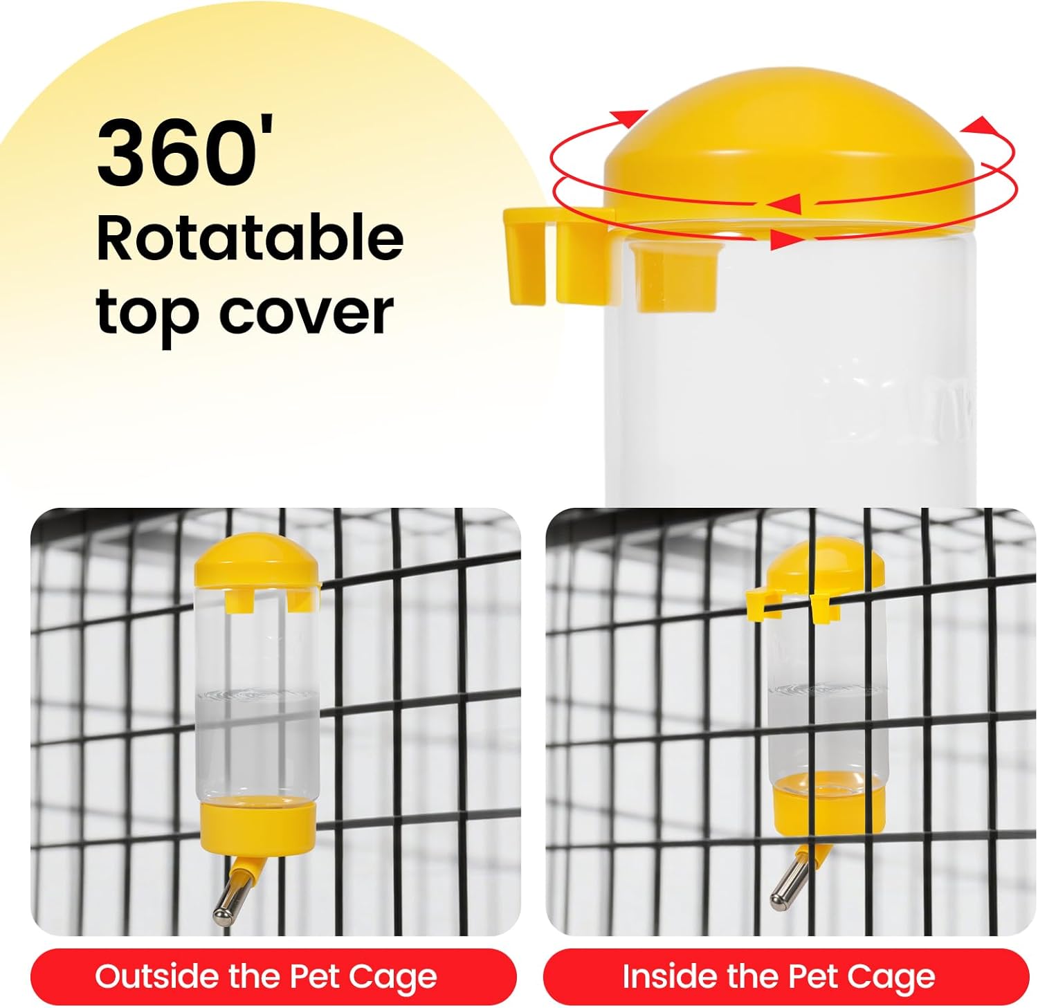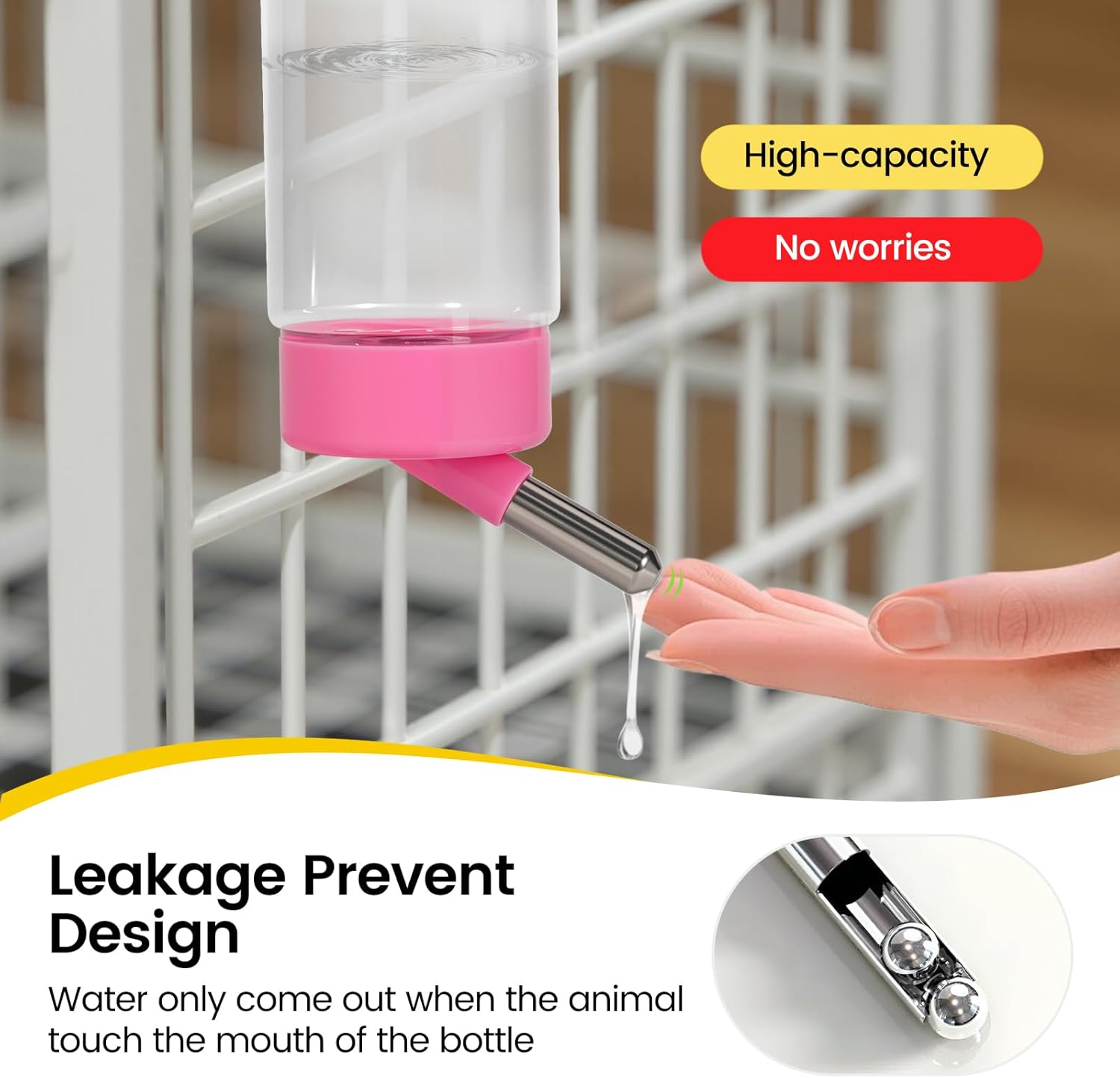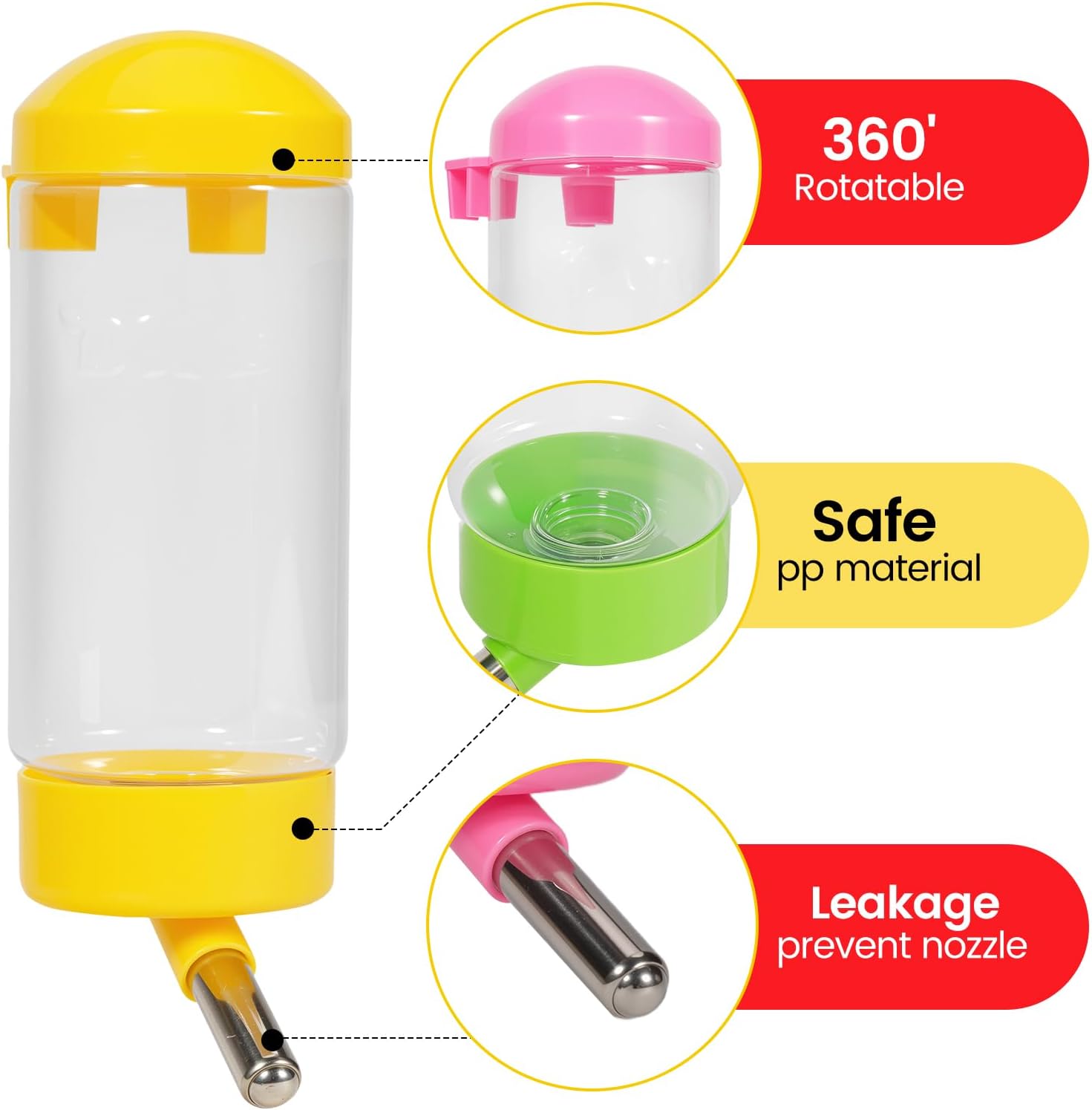 About this item Safe Materials: The hamster water bottle is made of plastic and a stainless steel water bottle cage mount, can withstand chewing from rabbits, squirrels. Random Color( yellow, pink, blue, green) 360° Rotatable Spout: The adjustable nozzle of the squirrel water bottle allows easy drinking from any angle. The tight-sealing ensures no leaks, even when hanging upside down No Drip Design: The guinea pig water bottle features a stainless steel ball bearing nozzle and seal to prevent leaks, Keeps your pet’s fur and cage dry while providing fresh water on demand Perfect for Multi-Pets: The bunny water bottle is Ideal for rabbits, guinea pigs, hamsters, chinchillas, ferrets, squirrels, and even small dogs or cats. A must-have for any pet owner! 3 Pack Bonus : Get 3 aniamal water bottles for the price of one! Great for backup or multi-cage setups › See more product details