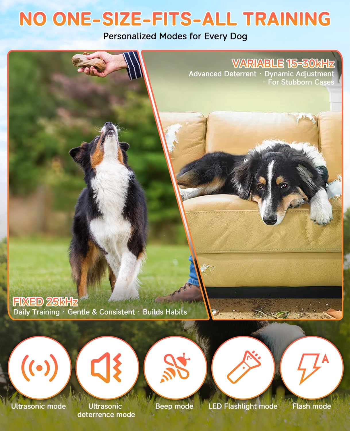 Triple-Speed Ultrasonic & 5-in-1 Smart Training-----Powered by triple ultrasonic emitters for 300% faster response and wider coverage than single-emitter devices. Switch among 5 humane modes (Fixed/Variable Ultrasonic, Beep, Strobe, Combo) to customize training for your dog's personality and various scenarios. Fast Charge & 90-Day Long Battery Life-----Equipped with a 2500-m-A-h rechargeable battery supporting up to 90 days of daily use per charge. The Type-C port enables quick and convenient charging, making bark deterrent device a reliable companion for home, travel, and outdoor adventures. 50ft Long Range & Neighbor's Dog Solution-----With a 50-foot operating range, anti barking device for dogs effectively deters barking, chewing, and jumping from a distance. Also serves as a conflict-free solution to manage persistent barking from neighborhood dogs, restoring your peace. Safe, Humane & Highly Effective-----Uses ultrasonic waves (inaudible to humans) and safe strobe lights—100% pain-free, non-shock, and contact-free. Proven effective for over 97% of dogs aged 6 months to 8 years, ensuring peace of mind for you and your pet. Compact with LED Flashlight & Safety Lock-----Ultra-portable design fits easily in your pocket. Built-in bright LED flashlight and strobe enhance safety during night walks. Safety lock prevents accidental activation, and auto-off after 10 seconds avoids overstimulation. › See more product details