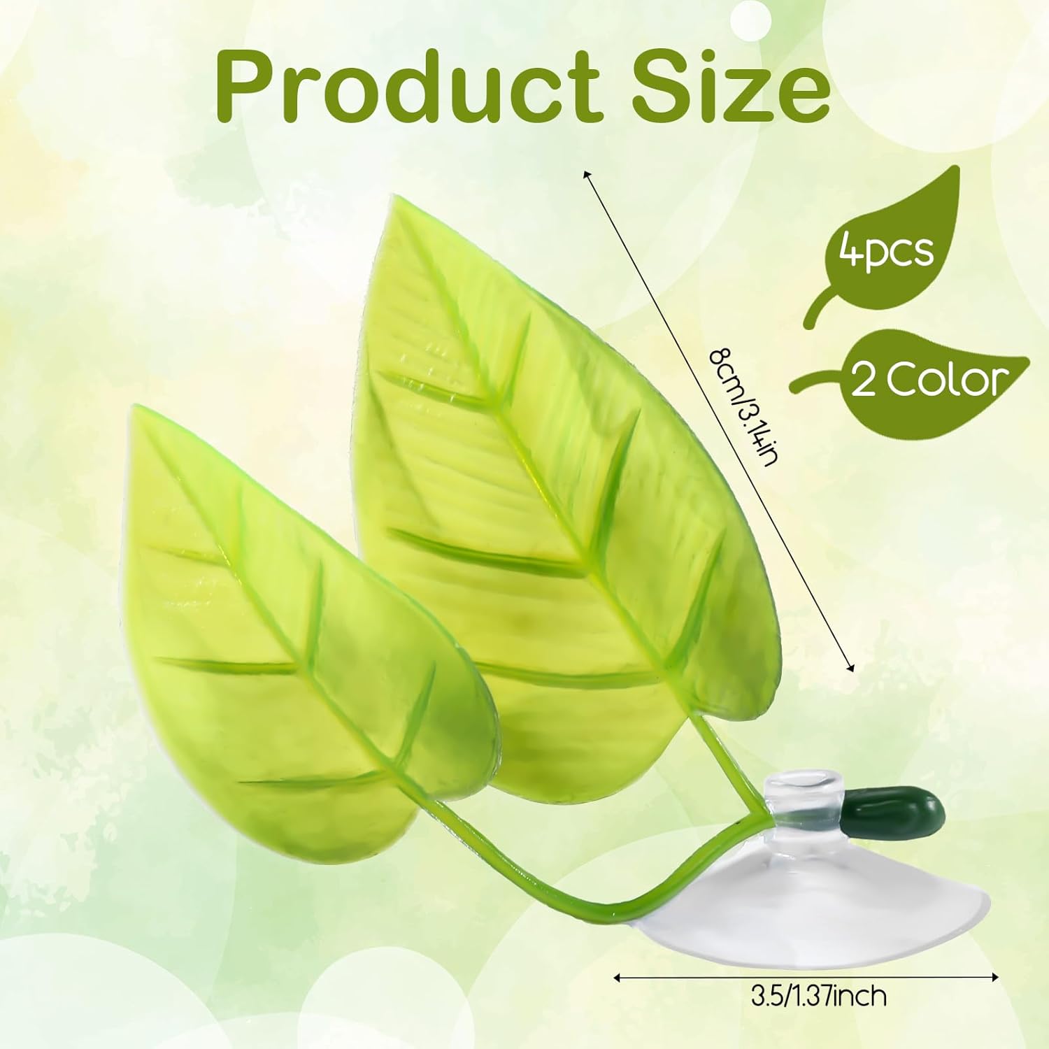 Features:Provide your betta fish with a comfortable and natural resting environment with our 2-pack leaf hammocks. These aquarium decorations are specially designed to offer betta fish a secure place to rest, sleep, and play while adding natural beauty to your tank setup. The double-leaf design creates an ideal habitat that mimics their natural environment, encouraging natural behaviors and providing essential cover.Our betta leaf hammocks feature a practical suction cup design that allows easy placement anywhere in your aquarium. The soft silicone construction ensures safety for your fish while the natural leaf shape provides both functional resting spots and decorative appeal. These hammocks are particularly beneficial for bettas as they need to surface frequently to breathe air through their labyrinth organ, making surface-level resting areas essential for their health and comfort.Specifications:Material: Polyester ResinColor: Pink, Blue, GreenDimensions:Large Leaf: 6.3x4.5cm/2.48x1.77inSmall Leaf: 5x3.7cm/1.97x1.46inSuction Cup Diameter: 3.5cm/1.38inPackage Includes:2 Pink-Blue Plastic Leaves2 Green Plastic LeavesNote:1. Leaves may arrive flattened after shipping; gently rotate in opposite direction to restore three-dimensional shape.2. For first-time use, your betta may take time to adjust to the hammock; try different positions in the tank if initially ignored.3. Recommended placement: Position leaves 0.5-1cm above water surface for optimal betta accessibility.4. Clean with cool water before first use and during regular tank maintenance.