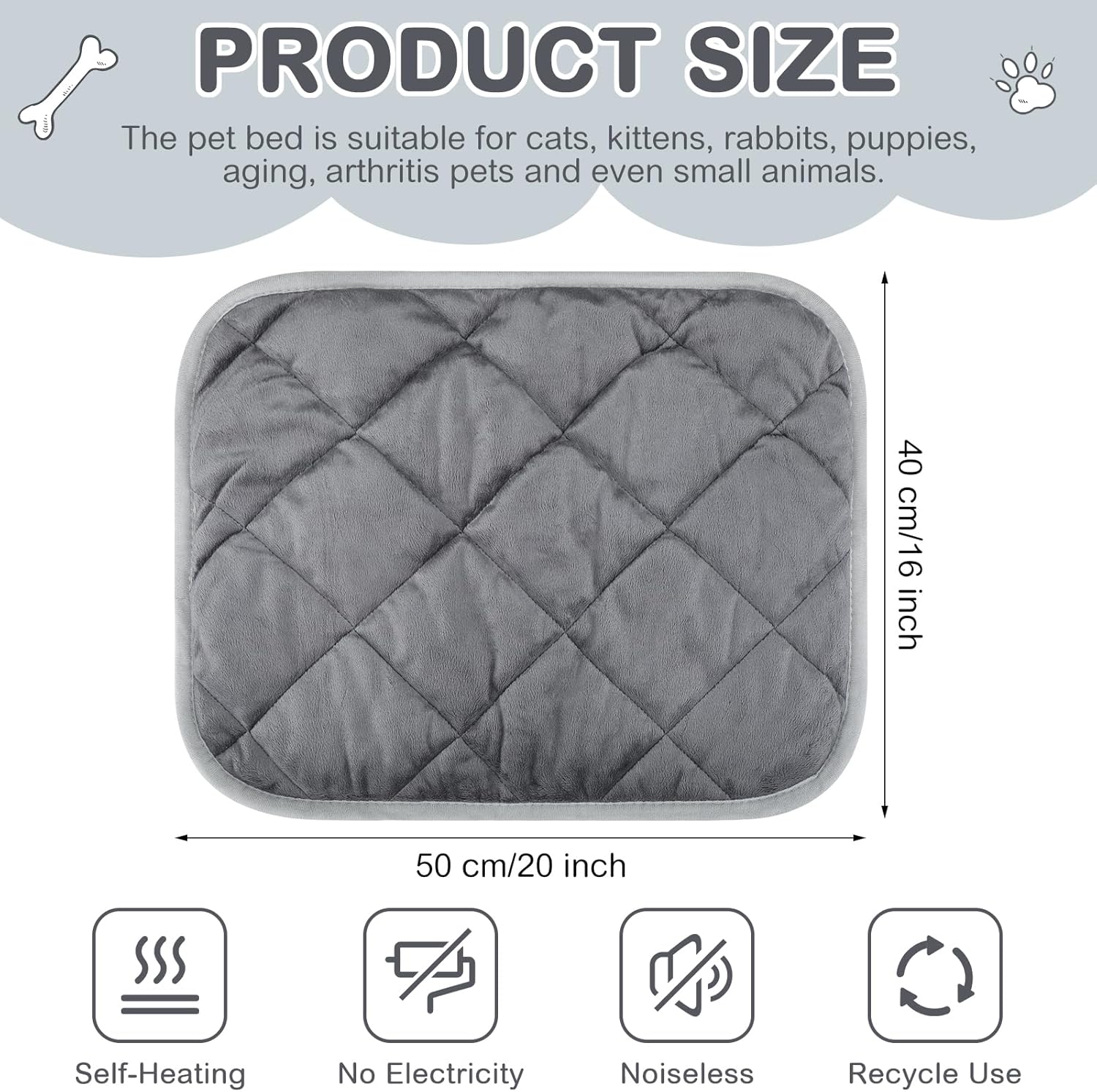 About this item Product Information: you will receive 4 self heating pet mats, which size is measured about 40 x 50 cm/ 16 x 20 inch; The pet bed is suitable for cats, feral cats, kittens, rabbits, puppies, aging, arthritis pets and even small animals, good to use on sofa, floor, pet beds, cat perches in pet cage, carriers, crate, kennel, playpen, and outdoor house, condos, shelter, enclosures, colony and more to rescue animals Designed for Pets: the self warming dog mat has no plug or electricity needed, you don't need to worry about any kind of safety hazard or toxic smell caused by using an electric pad; This self heating mat reflects and retains your pet's heat to create a warm surface for pets to curl up in comfort, keeps your pets toasty warm on cold days Noiseless for Ultimate Comfort: the self warming mat surface is made from soft fluffy fabric, is gentle on noses and paws for enhanced snuggling comfort, provides a snuggly surface for napping, suitable for both indoor and outdoor pets to nap the day away Easy to Clean and Care: the cat bed mat is completely machine washable and dryer friendly for easy cleaning for your convenience; The thermal pet bed is lightweight and portable, so you can give your pets a boost of warmth almost anywhere 5 Layer Heat Preservation Design: our self heating pad for pet is filled with a 5 layer structure, includes 3 layers of heat generating and warm keeping materials, the first layer is soft wool, the second layer is soft thermal insulation cotton, the third layer is warm and patient fleece cloth, the fourth layer is heat storage and thermal insulation material, and the fifth layer is wear resistant and anti skid Oxford cloth › See more product details
