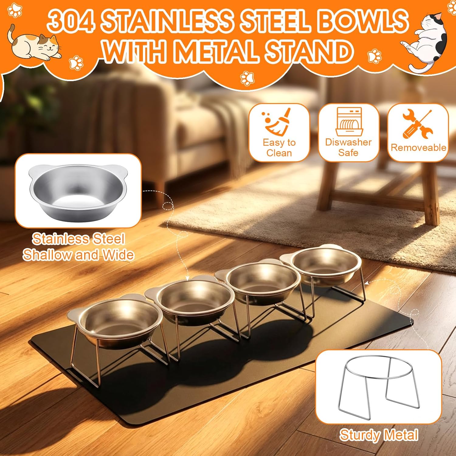 Features: Stable non-slip base: The broad base combined with the silicone mat provides secure footing, preventing bowl movement during eating. These elevated cat bowls ensure peaceful mealtimes. Promotes digestive health: The scientific elevation and whiskers friendly design work together to support better digestion. These raised cat food bowls help reduce post-meal vomiting. Specifications: Material: 304 stainless, silicon Color: sliver Size: cat bowl wide about: 5.6 inches/ 14 cm, deep about: 1.57 inches/ 4 cm, capacity about 250 milliliters/ 8 ounces Silicon mat about: 23.62 x 15.75 inches/ 60 x 40 cm Package includes: 4 x Cat bowls 1 x Silicone mat Notes: Manual measurement, please allow slight errors on size. The color may exist a slight difference due to different screen displays. Small items are included, please keep them away from pets in case of choking risk. Before purchase, confirm whether the product size is suitable for your pet, and observe the pet's reaction when using. Please remove the product in time if there is any discomfort