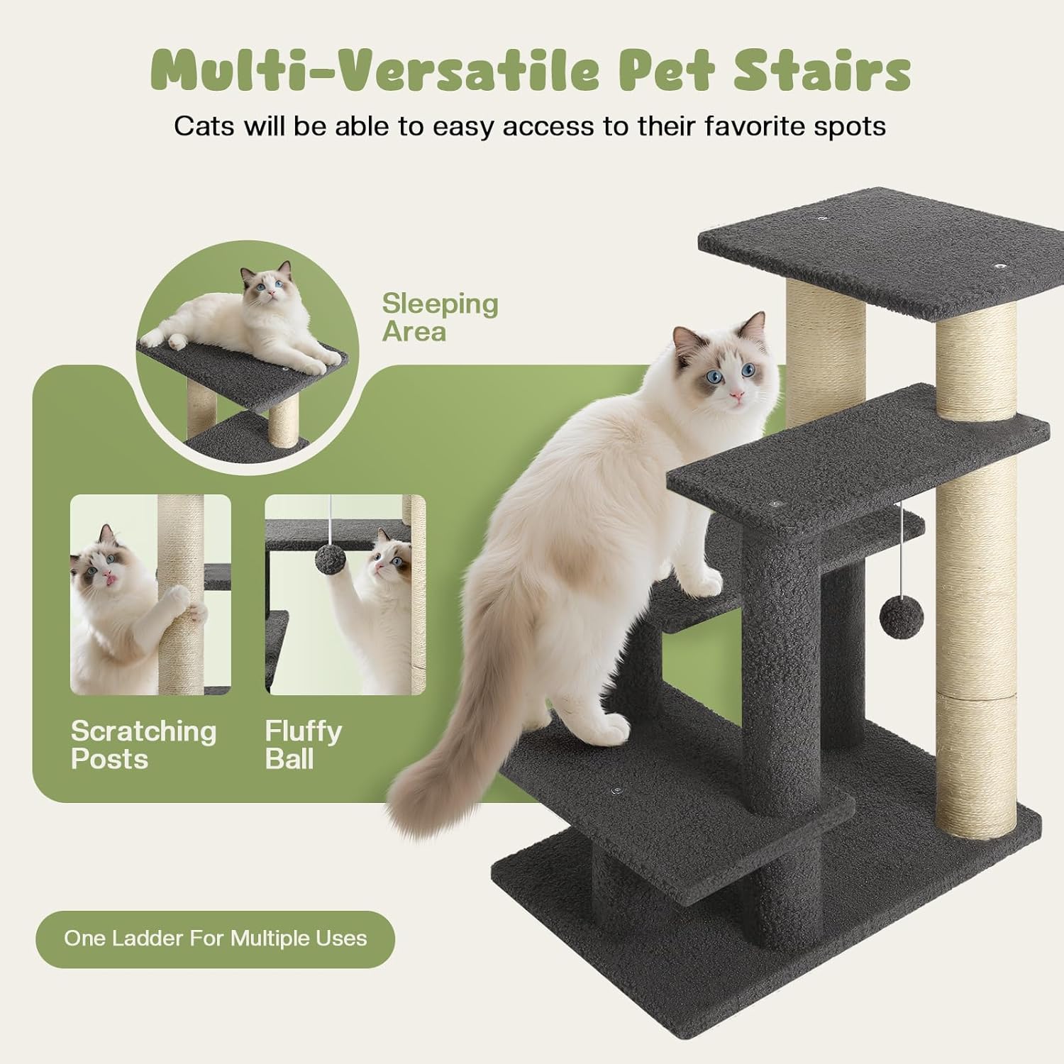 About this item 【Versatile】This pet steps for cats offers a range of functions for your cats to enjoy, including a top sleeping area (15.8 * 11.8 inches), two sisal cat scratching posts and a fluffy ball. With this pet ramp for cats, they will be able to easy access to their favorite spots for a cuddle, sharpen claw, sleep and have fun 【Ideal for Senior Pets】Whether you have an older cat, a small dog, or a pet with limited mobility, these sturdy pet steps help your dog or cat easily get on and off couches or beds. Moreover, this cat stairs for old cats provides a platform for curious pets to appreciate the beautiful scenery and weather outside 【Stable & Durable Structure】Crafted from high-quality 0.6-inch thick particle board with non-skid feet help prevent slipping. The pet stairs for cats ensures stable support and can accommodate pets weighing up to 150 pounds 【Suitable For High Beds Up to 36 Inches】The cat ramp for old cats for high bed is 29 inches high, and accommodate a variety of bed sizes from 18 to 36 inches by removing or adding steps. Covered in soft velvet fabric that provides traction, reducing the risk of slip and falls 【Easy to Assemble & Maintain】Simple assembly instructions make the pet stairs for bed easy to set up. And when it comes time for cleaning: just use a lint roller, small brush or vacuum cleaner gently on the plush material to remove any pesky pet hair or dust › See more product details