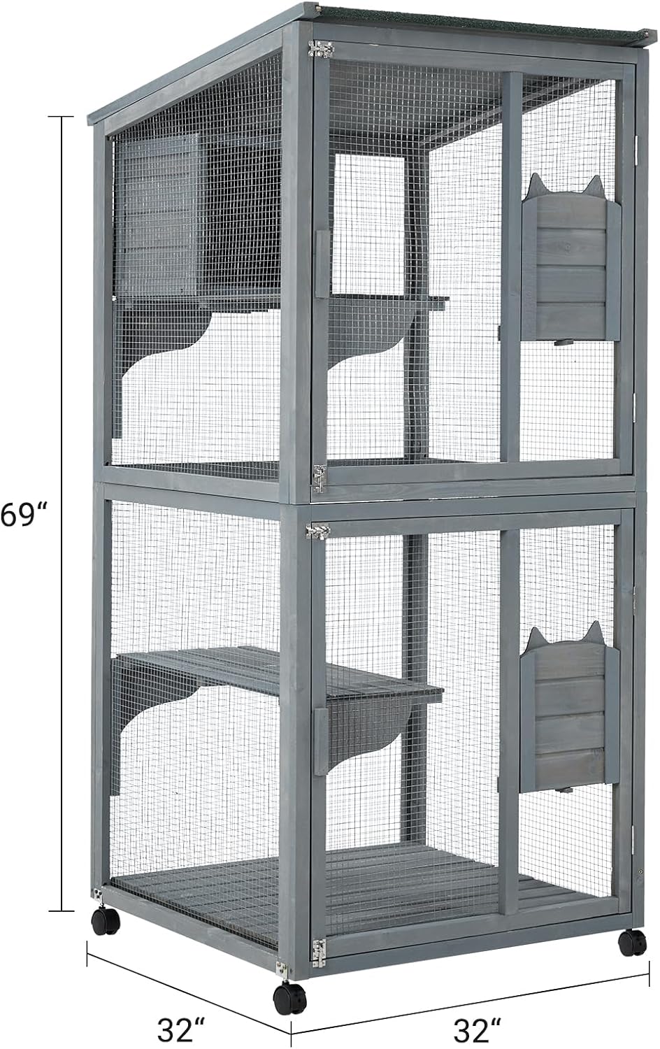 About this item ๐ฐ Multiple Levels-- 4-tier wooden catio outdoor cat enclosure, with the dimensions of 32x32x69 inches, offers a spacious and comfortable home and provides a cozy, warm, and quiet environment for multiple cats. The cat enclosure includes 3 jumping platforms, 1 resting box, 1 removable floor, 2 lockable doors, and 2 small doors. ๐ชSolid Construction: The catio is constructed of premium water-based fir wood and bite-friendly galvanized wire mesh. The frame is completely safe for your pets, and the metal wire material ensures its strength. ๐ Combined and Embedded: The cuboid and right-angle design allows you to assemble 2 or 3 cat enclosures as one unit. It is also available for embedding it in the wall to make a fixed space for your furry friends to have a regular outing habit. The extra accessories for combination and embedding need to be purchased separately. ๐ Movable and Lockable: The bottom wheels on the cat enclosure make it super easy to move around your backyard Yard and they are load-bearing, so it is smooth when you move it. They can also be fixed by locking the wheels to keep them secure and stable. ๐Friendly and Secure Door Design: There are 2 lockable cat doors to make it simple to let your cat in or out. Each level has double lock methods to make it secure and flexible for cats of different sizes. It is also easy to operate without struggling. โAll-Season Ready:The top of the cat enclosure is waterproof, providing protection from rain, and the grid- grid-construction design keeps your furry friend dry during unexpected weather. ๐พEasy to Clean-- Cleaning is hassle-free with the removable PVC layer at the bottom of the catio, which can be easily taken out and cleaned. ใWaterproof Roof ใ-- The top of the cat enclosure is waterproof, providing protection from rain and the grid- construction- design keeping your furry friend dry during unexpected showers. โบ See more product details