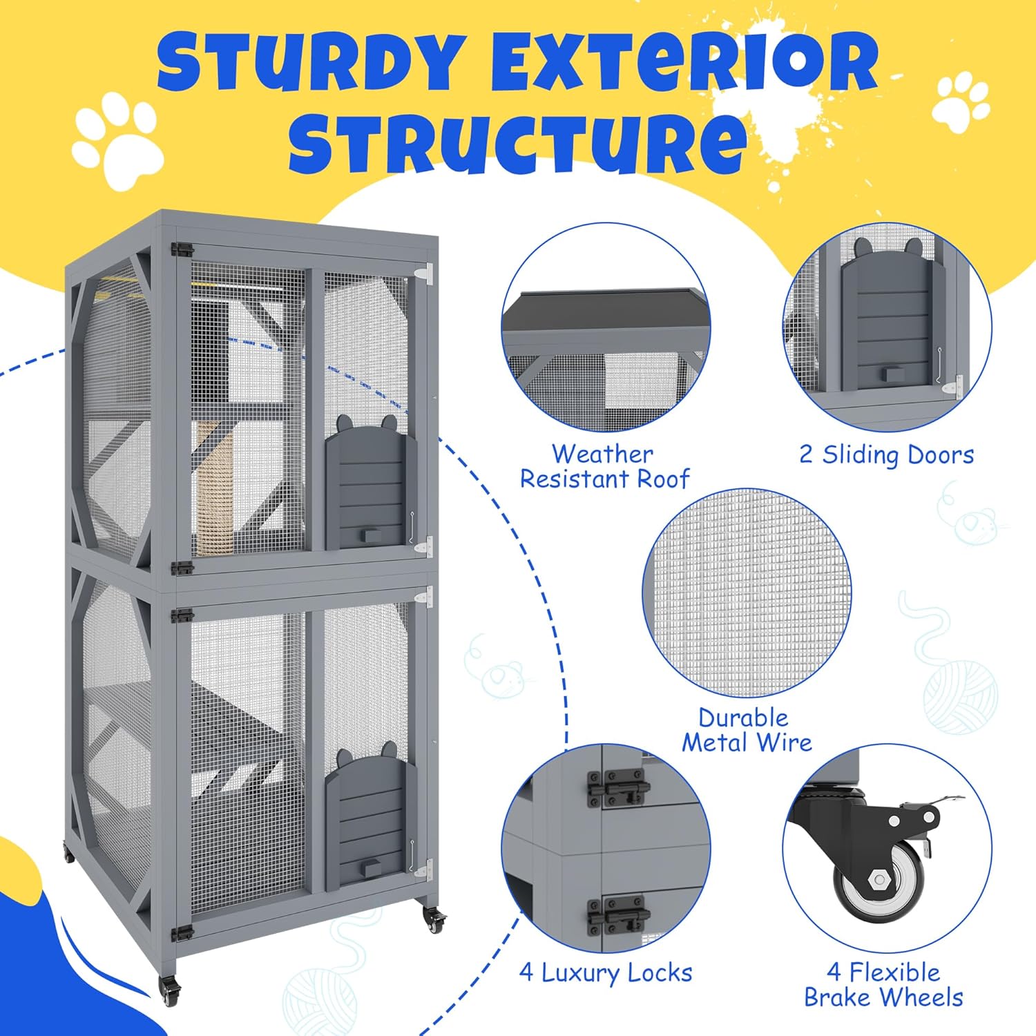 About this item Portable Cat Enclosure for Indoor and Outdoor: The catio is equipped with 4 casters that can rotate 360°, and the lockable wheels with brakes enhance stability, making it convenient for you to move it around the space and fix it in place, and reposition it as needed. Spacious Interior Design: This cat house is designed according to the nature of cats, with 3 jumping platforms, a sisal scratching post, a nap house, removable floors and double lockable doors, so that your cat can play and enjoy the natural scenery. Sturdy Solid Wood Structure: The outside patio cat playpen is made of solid fir wood and bite-proof galvanized wire mesh, and supported by a sturdy triangular bracket. The sloped asphalt waterproof roof helps keep your furry friend dry. Cat Enclosure with Window Access: The small sliding door of this cat enclosure can face the indoor window or cat hole (the front and back panels of the lower half of the cat cage can be reversed), allowing your cat to enter and exit freely, which is more convenient. Connectable Cat Tunnel: The small sliding door at the bottom can be connected to the cat tunnel, providing more fun for pets. You can play with your cats in the living room or yard. We provide numbered product installation instructions to help you assemble quickly. › See more product details