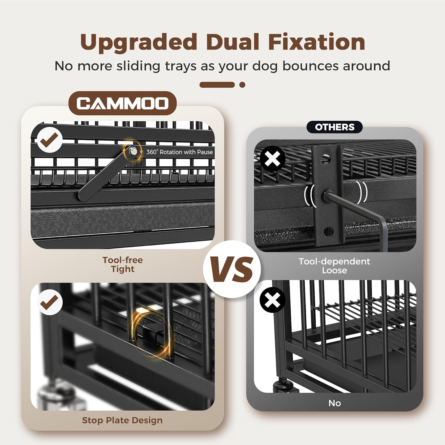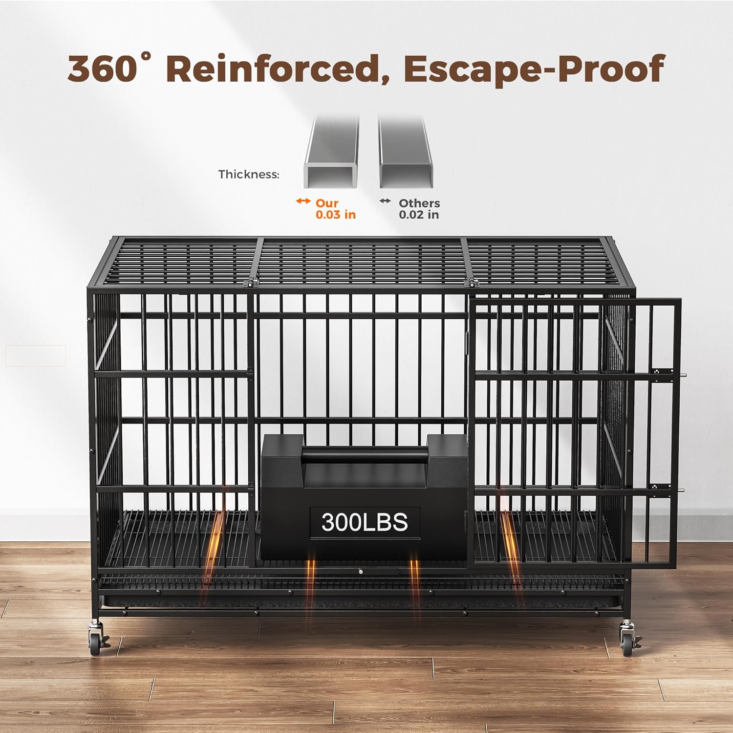 About this item Our design is perfect for large and medium dogs. Made of sturdy 0.03-inch thick, heavy-duty steel. Protective green coating is included to improve durability and safety Equipped with locks on ALL FOUR wheels for enhanced stability. Wheels can be raised by up to 0.3 inches to maintain balance on uneven surfaces, making it easier to move around inside and outside and clean the floor With INNER dimensions of 47.2"L x 28.6"W x 27.2"H, this crate fits dogs weighing 50-70 lbs. The OUTER dimensions are 47.6"L x 30.7"W x 36"H, helping you find a suitable location for the crate at home The unique detent design and upgraded 360° rotating tray lock ensure all trays stability, protecting the crate from damage by your dog. This cage is specifically designed for big breeds like German Shepherds, Golden Retrievers, and Labradors The top door opens over 90° for easy interaction. The front door provides convenient access and can be detached for use as a cozy dog house. With four sturdy locks, it prevents even mischievous dogs from escaping The plastic tray is made of waterproof PVC, and the wire tray provides strong support while allowing food and waste to fall through. Both trays are removable for quick cleanup, saving you time and keeping your dog's living environment clean › See more product details