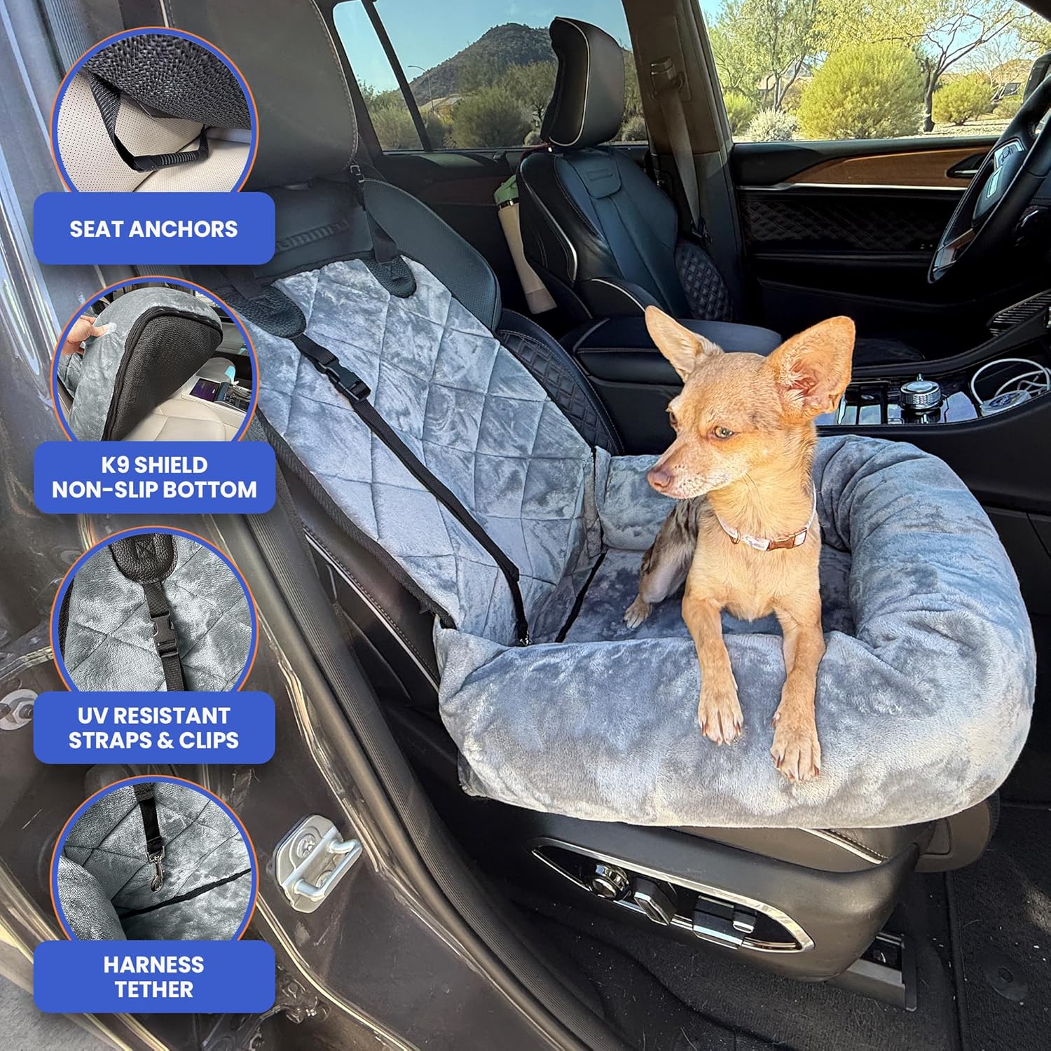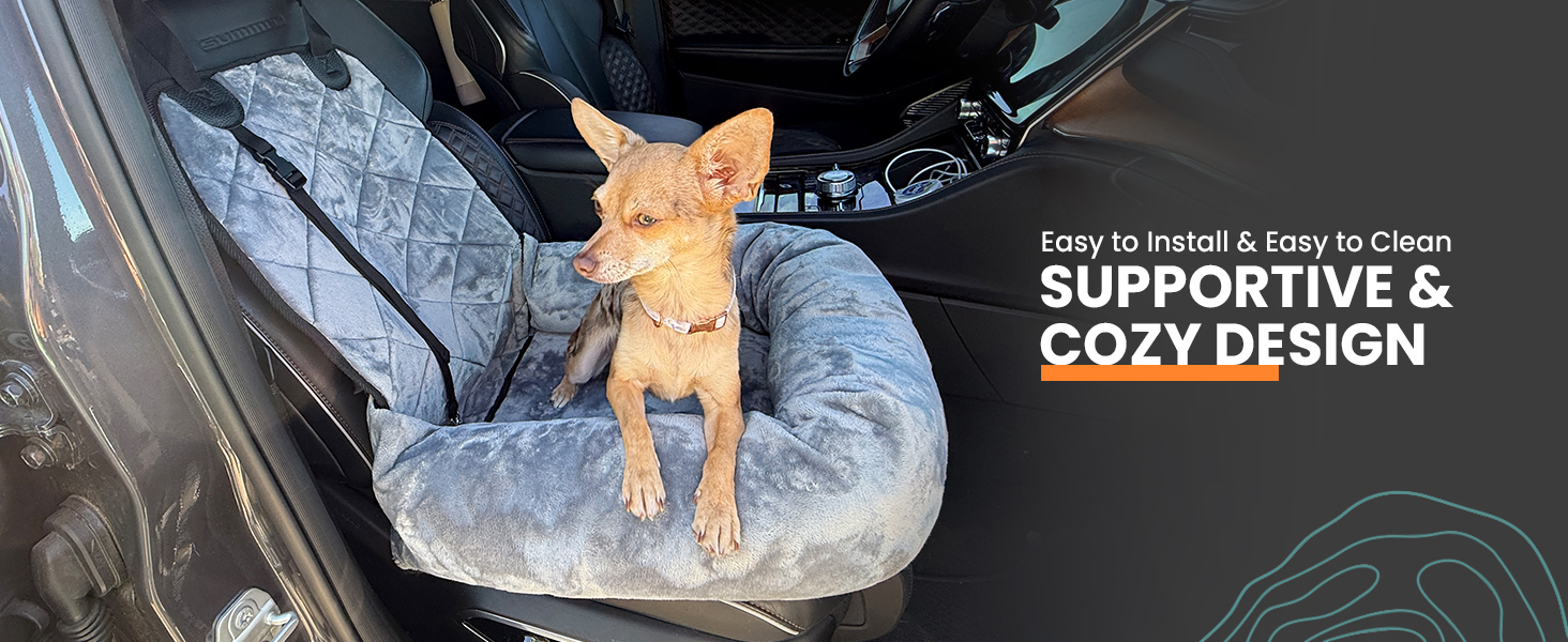 COMFORTABLE TRAVEL COMPANION: Pamper your small to medium dog with the 4Knines Plush Dog Car Seat, designed to offer a soft, cushioned space that provides comfort without elevating your pet. Perfect for smooth and peaceful rides in cars, SUVs, or trucks. PLUSH BOLSTER FOR HEAD SUPPORT: This dog booster features a plush bolster that wraps around the base, giving your dog a cozy spot to rest their head or snuggle in. This thoughtful design reduces stress and makes every journey more soothing for your furry friend. SAFETY-FOCUSED DETACHABLE TETHER: This dog travel car seat includes a removable tether that attaches securely to your dog’s harness (never the collar), helping keep your pet safely seated. It prevents them from climbing into your lap while driving, so you can stay focused on the road. NON-SLIP BASE WITH SECURE STRAPS: Designed with a non-slip bottom and car seat anchor, this dog safety seat stays firmly in place even on winding roads. It also includes an adjustable headrest strap and an optional dog seatbelt clip for added security—note: avoid using the seat strap if your vehicle has side airbags. EASY TO INSTALL & CLEAN: This dog car seat is quick to set up using the adjustable headrest strap. The plush cover removes easily for machine washing, keeping the seat fresh and clean for your pet’s next adventure. Built with durable materials to withstand frequent use on every trip. › See more product details