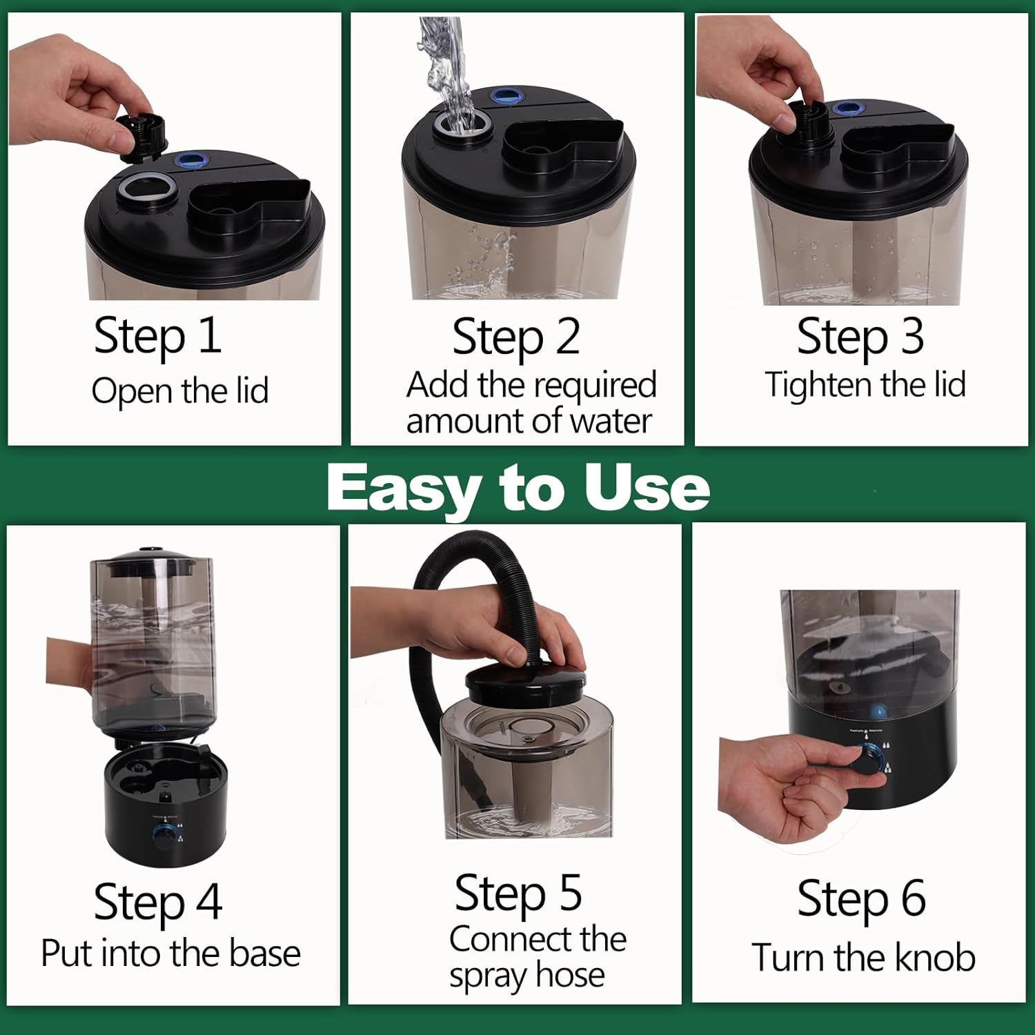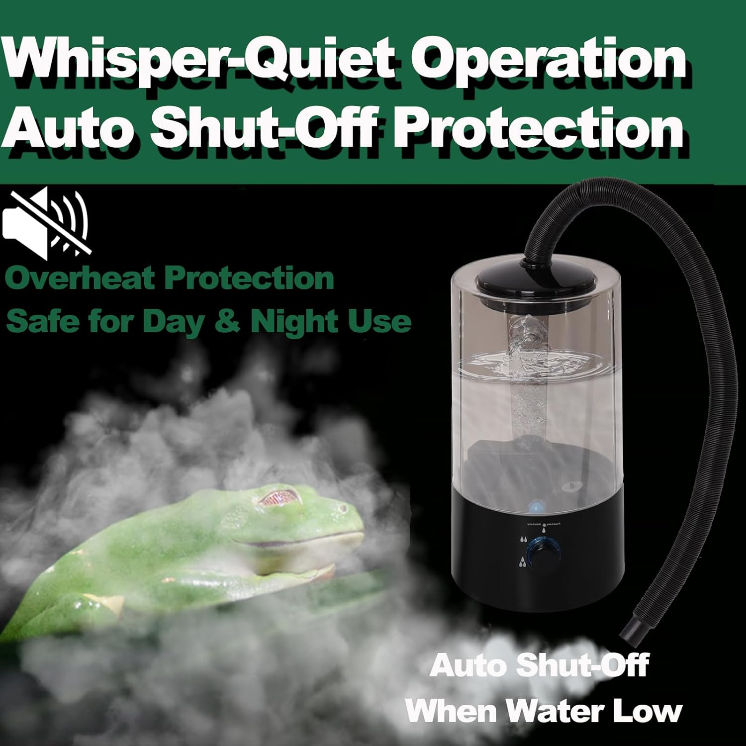 About this item 【4L Transparent Tank – Easy to Monitor & Refill】Built with a 4-liter transparent tank, this humidifier reduces the need for frequent refills and lets you monitor water levels at a glance—no guesswork. Ideal for day and night operation.(Black) 【Ultrasonic Mist for Natural Humidity】Designed with high-frequency ultrasonic technology, this reptile humidifier efficiently simulates natural rainforest conditions by delivering a fine mist, helping maintain ideal humidity levels in your terrarium. 【Adjustable Mist Output】Easily customize the misting level to suit different reptile environments and seasonal needs with the adjustable fog output. 【Quiet Operation & Auto Shut-Off】Quiet operation ensures peaceful rest for your reptiles. Automatically shuts off when water runs low to prevent overheating. 【Fits Reptiles, Amphibians & Plants】Suitable for turtles, tortoises, bearded dragons, geckos, snakes, frogs, chameleons, orchids, and other tropical plants. 【Note】Please add water from the bottom of the terrarium humidifier tank, Do not bend the fog output hose when using it.Wide voltage range: 110-240V › See more product details