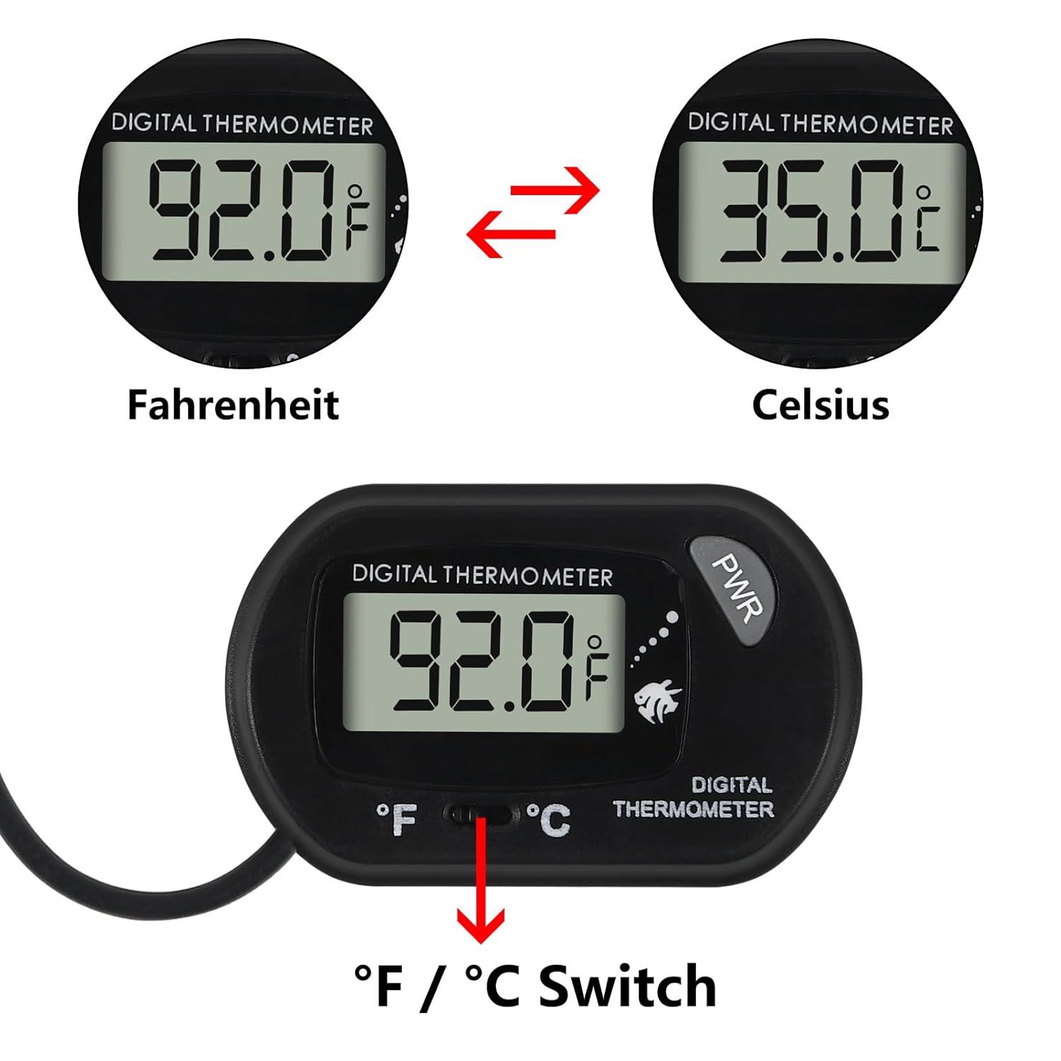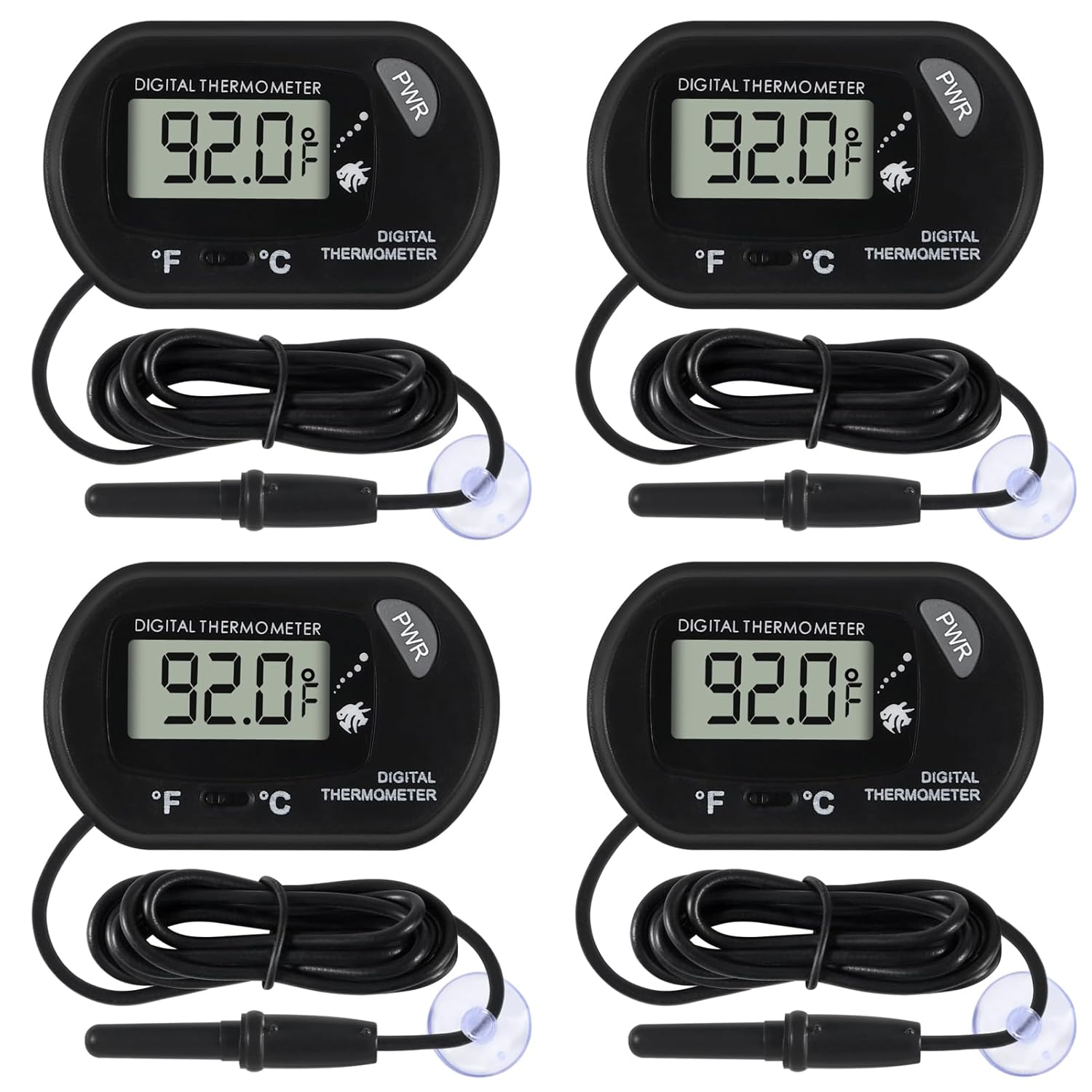 Temperature range: -58°F to +158°F (-50°C to +70°C) Temperature measurement accuracy: ±1℃ Easy to read: comes with LCD display that is easy to read clearly Wide application: Ideal for use in water or high moisture environment like aquarium terrarium, or vivarium; suitable for different water types such as fresh water, tap water, salty water, marine water and etc It can be used in temperature sensing of many types of liquids, making your temperature measurement so simple Multiple uses: Almost any scene that needs to measure temperature can be used Sensor probe: Submerge probe with suction cup can easily be set in water (Submerge probe only, do not submerge thermometer in water) LCD screen display: The LCD display easily reads the temperature in the water. The button can be used to switch between °C and °F 2 suction cups: One is a fixed thermometer and the other is a fixed probe. Clean the surface of the suction cup to achieve the best adsorption effect Press and hold the power (PWR) button to turn on. Hold the power button for 3 seconds to turn off Package include: 4 x Aquarium thermometer Note: The main display unit of the thermometer must be kept away from water because it is not waterproof