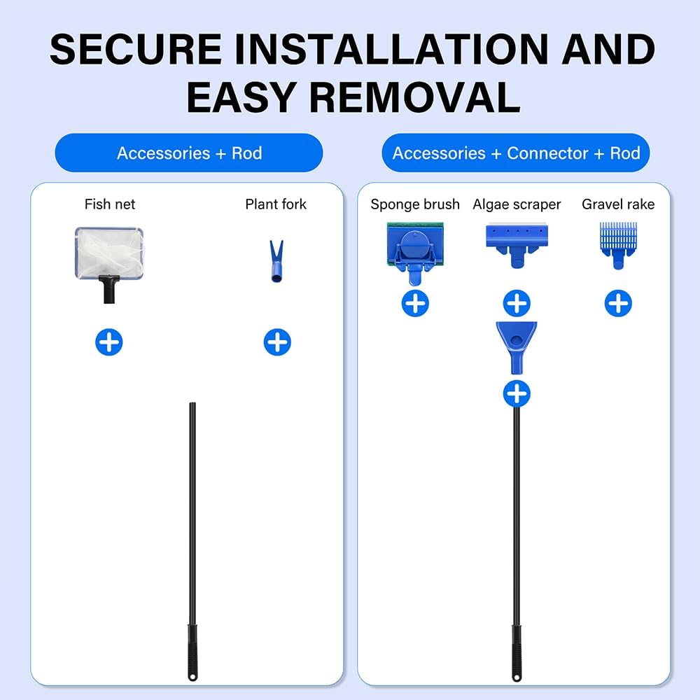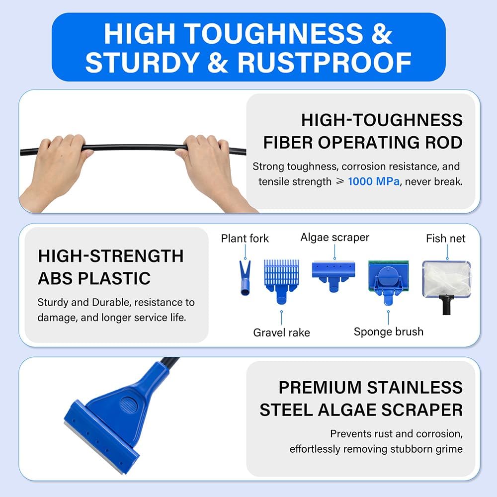 Novique is committed to providing every customer with professional, high-quality pet supplies. Parameters: Handle Length: 19 Inch Algae scraper + Handle Length: 22.8 Inch Fish Net + Handle Length: 23 Inch Plant Fork + Handle Length: 20.5 Inch Sponge Brush + Handle Length: 24 Inch Gravel Rake + Handle Length: 23.4 Inch Materials:High-toughness fiber tube, High-strength ABS plastic, High-quality stainless steel Five-in-One Function: - Algae scraper - Fish Net - Plant Fork - Sponge Brush - Gravel Rake Design Highlights: - Multifunctional Aquarium Cleaning Tool - High toughness & Sturdy & Rustproof - Secure Installation And Easy Removal - Deep Cleaning & Anti-Slip - Worry-free Choice What Made Me Decide On The Novique Aquarium Cleaning Tools Kit? 1. Multifunctional Aquarium Cleaning Tool: Novique fish tank cleaning tools includes five interchangeable accessories: a algae scraper , gravel rake, fish net, plant fork, and sponge brush. These accessories can be flexibly swapped to address different cleaning needs, ensuring thorough aquarium maintenance to keep it looking brand new. 2. High toughness & Sturdy & Rustproof: Novique features a highly tough fiber operating rod with a tensile strength exceeding 1000 MPa, ensuring it will never break during use. All five accessories are crafted from high-strength ABS plastic, sturdy and durable, resistance to damage, and longer service life. The premium stainless steel algae scraper, rust-proof and corrosion-resistant, effortlessly removes stubborn grime. 3. Secure Installation And Easy Removal: Novique aquarium cleaning tools features a special snap-on design that securely attaches accessories to the handle while allowing for easy removal. You won't have to worry about them falling off during tank cleaning. Plus, all accessories share the same handle for convenient storage, saving you space. 4. Deep Cleaning & Anti-Slip: Novique fish tank glass cleaner features a 19-inch anti-slip handle, capable of cleaning aquariums up to 1.77 feet deep. You won't have to worry about slipping while scrubbing stubborn stains off your tank. 5. Worry-free Choice: We offer a 12-month warranty and 24-hour professional support. For any product inquiries, feel free to contact us. Novique, always innovating for a better life. Experience excellence with Novique.