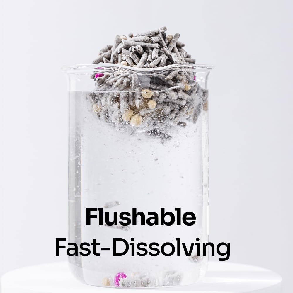 About this item 68% Tofu Cat Litter + Activated Carbon (1.8–2.1mm diameter, 7–16mm length) – Absorbs moisture quickly and locks in odors. 28% Bentonite (1.7–3.0mm length) – Strengthens clumping for effortless scooping. 2% Litter Mate + 2% Deodorant Particles (0.5–1.6mm length) – Eliminates odors and keeps the litter box fresh. Instant and Tight Clumping – Small-particle bentonite fills the gaps between tofu litter, maximizing water absorption and forming firm, mess-free clumps. Dust-Free and Advanced Odor Control – Activated carbon and deodorant particles neutralize odors, while the high-hardness, low-fragmentation formula reduces dust to keep your cat’s respiratory system safe. Flushable and Eco-Friendly – Water-dissolvable and safe to flush in small amounts for hassle-free disposal. (Flush responsibly to prevent clogging.) Vacuum-Sealed for Freshness – Compact 5.5 lbs bag, easy to store and ideal for multi-cat households. › See more product details
