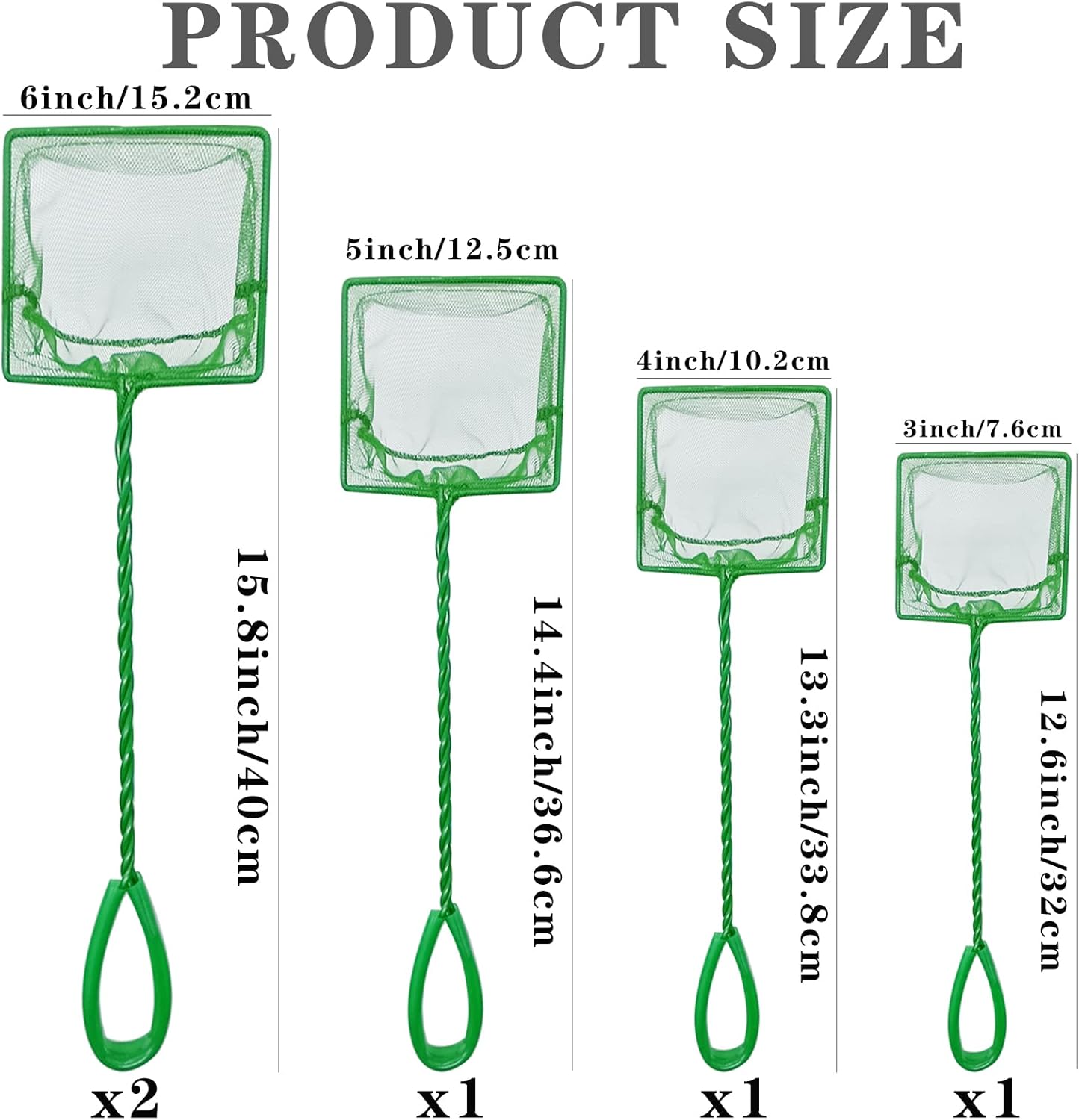 QXBXYHM 5 Pack Aquarium Fish Net, Multi-Size Fine Quick Fish Catch Nets Nylon Fishing Mesh Nets with Long Plastic Handle for Fish Tank - Green (3in, 4inch, 5inch, 6inch, 6inch) Specfications: Color: green Material: quality metal + strong and soft fine nylon mesh Package Content: total 5 pack 3inch aquarium fish net (1pcs) (12.6*3 inch/32*7.6 cm) 4inch aquarium fish net (1pcs) (13.3*4 inch/33.8*10.2 cm) 5inch aquarium fish net (1pcs) (14.4*5 inch/36.6*15.5 cm) 6inch aquarium fish net (2pcs) (15.8*6 inch/40*15.2 cm) Notice: (1) Please allow 1-2 cm error due to manual measurement. Please make sure you do not mind before you bid. (2) Due to the difference between different monitors, the color may be slightly different from the actual color of the item.