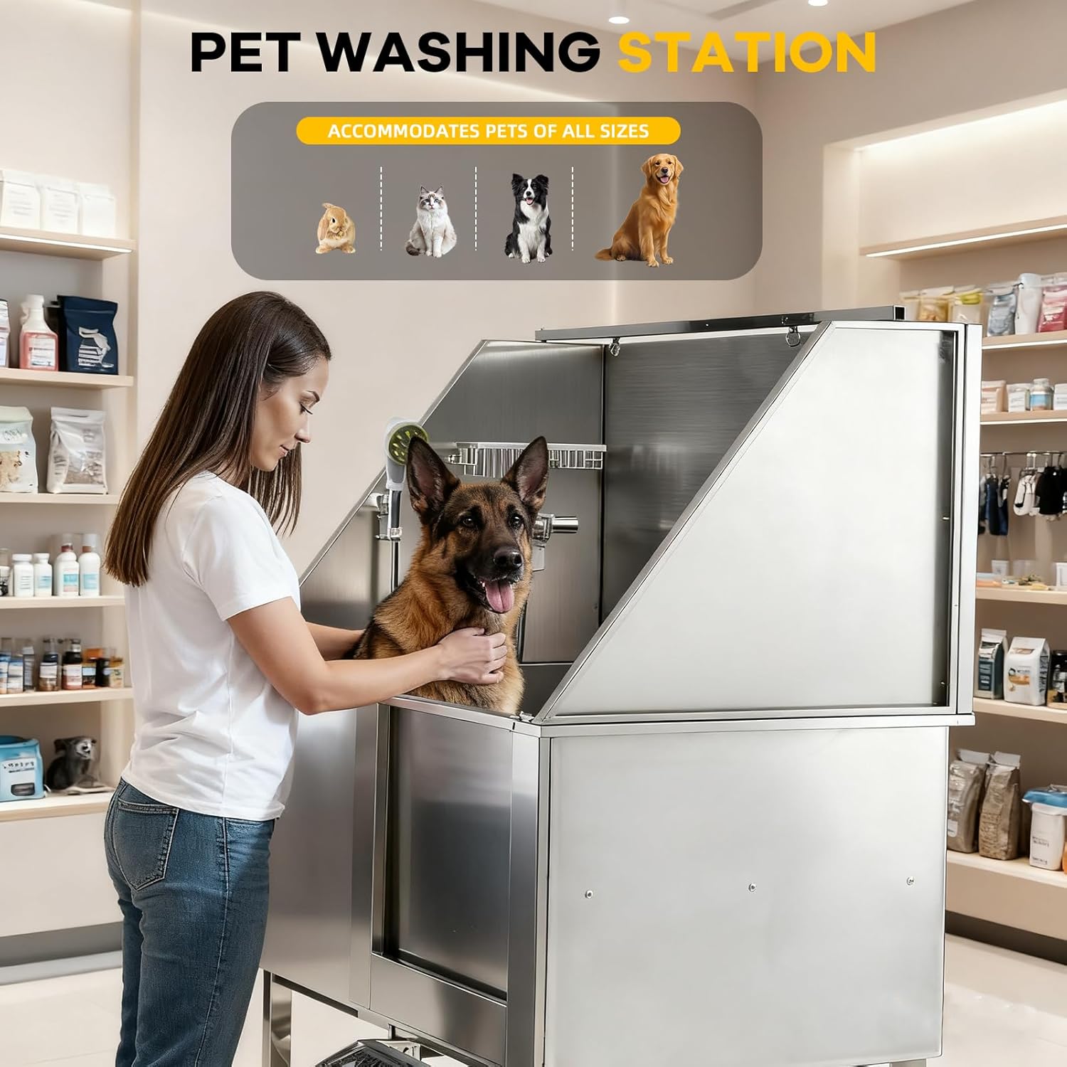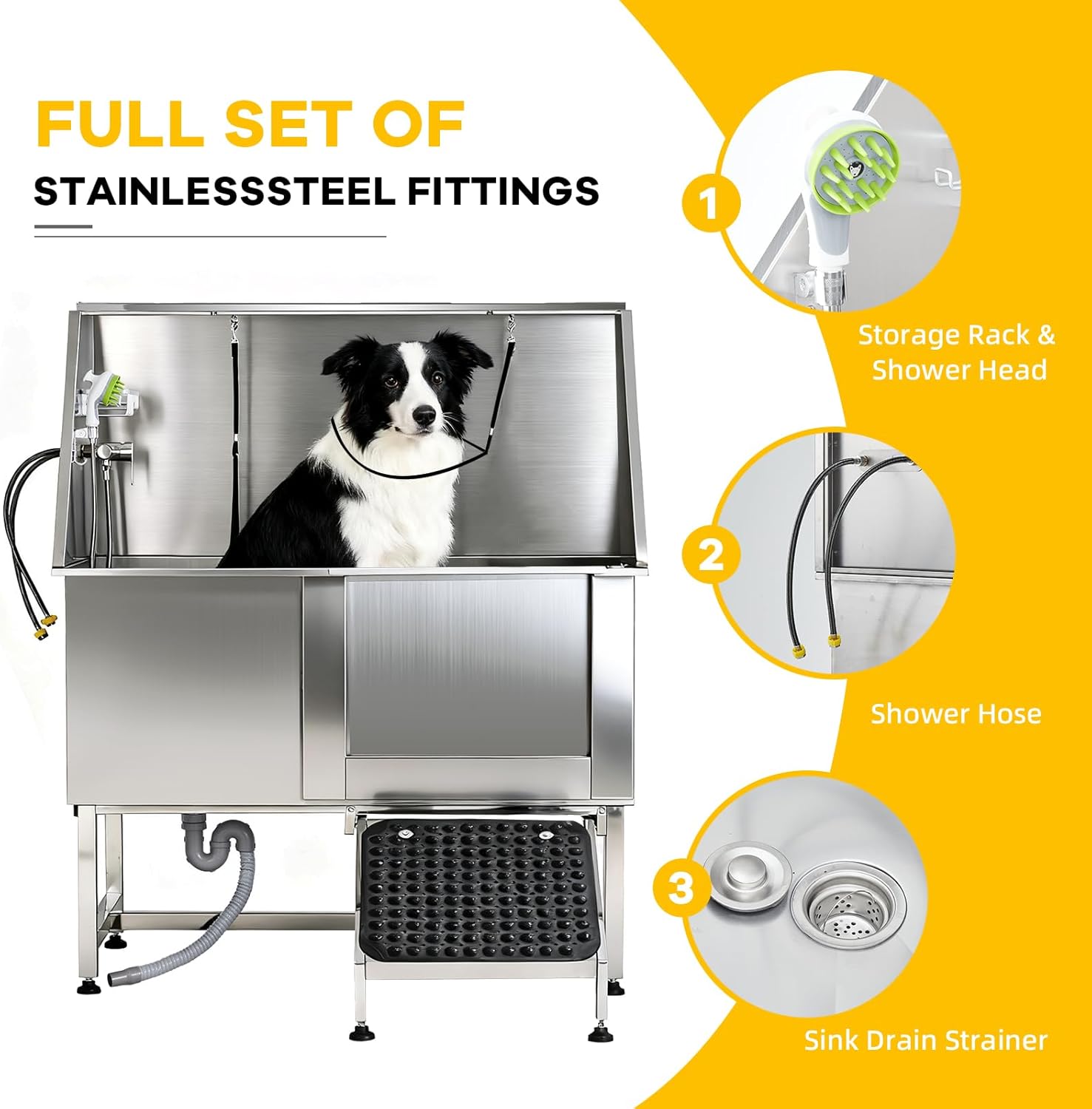 Professional Dog Bathtub: This 50inch professional dog bathtub's body boasts a 304 stainless steel with a load capacity of 287 lbs; It resists deformation and rust, ensuring easy cleaning and lasting durability; The fully welded one-piece design prevents water leakage and allows easy installation. Two-Depth Options For Pets: This dog washing station is designed with detachable standing grilles, making it easy to adapt to dogs of all sizes. It also includes a retractable anti-slip ramp, providing your dog with a safe and convenient way to enter and exit the station, especially helpful for older dogs or those with limited mobility. Convenient and Hassle-Free: This dog bathing station includes two safety belts, sliding doors with safety locks to ensure your dog is safely in place during bathing time, a convenient showerhead for easy cleaning, a product stand for your beauty essentials, and an effective drainage system to ensure a seamless and worry-free bathing experience. Enhanced Drainage System: Enhanced Drainage System: Our pet wash station is designed with a chrome-plated extendable drain, offering durability and an aesthetic appeal. Safe and Convenient Design: This dog bathtub for large dogs includes a reliable sliding door to prevent accidental opening; The hideable stair comes with a new limiting screw for secure stepping when pulled out; An attached leash holder can also be used to hang towels. › See more product details