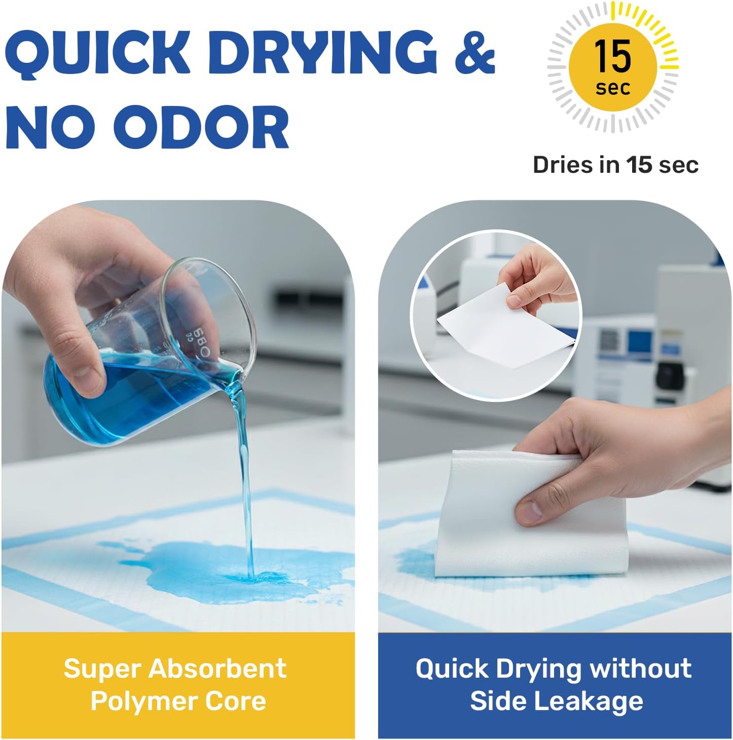 Our training pads are made with 5 layers: non-woven cloth as the first layer to allow urine to flow through; the second and the fourth layers are made from paper tissue to add absorbency; the third layer is also the core layer is made from Super Absorbent polymer, and the back layer is a water-proof plastic protecting layer.