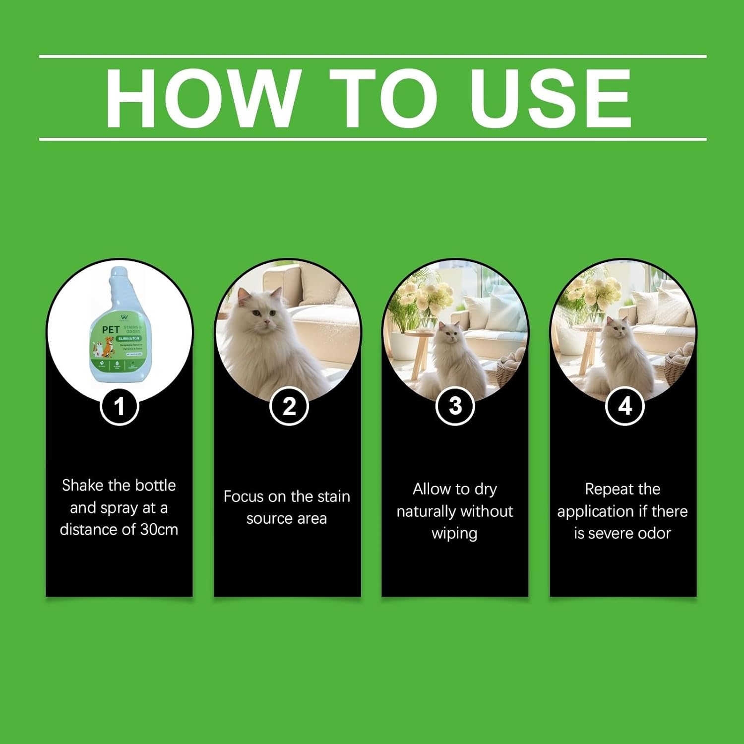 • Easy 3-Step Use Spray, Wait, Done. 1-Shake well & spray from 30cm away,2-Target odor (like litter box edges or accident spots),3-Let it air dry naturally no wiping needed For strong odors, repeat as necessary.