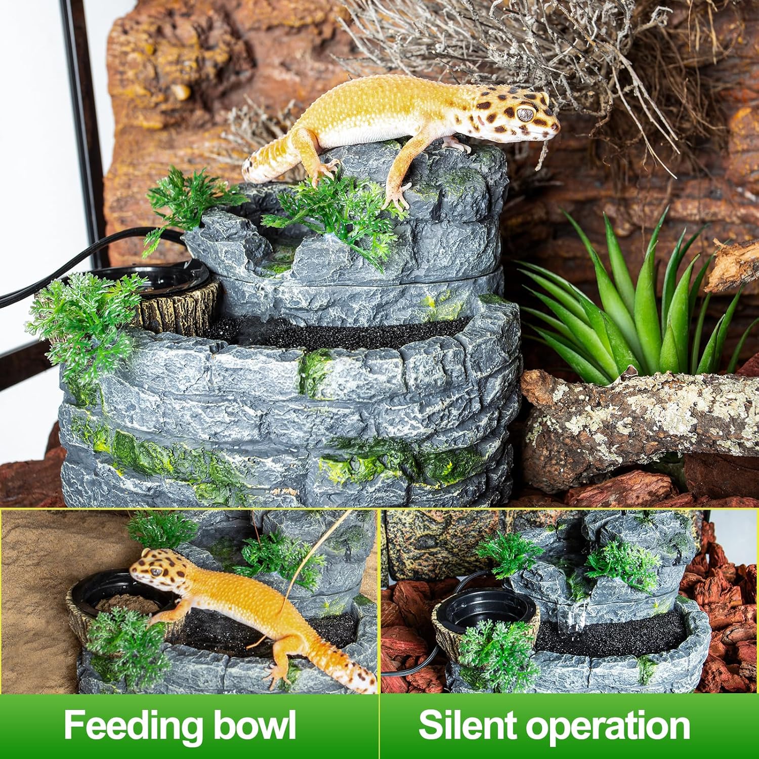 About this item đż Nature-Mimicking Oasis: SUKEOPETâs Reptile Waterfall transforms your terrarium into a vibrant ecosystem! Crafted from pet-safe natural resin with realistic rock textures, this flowing Terrarium Waterfall Drinking Fountain entices bearded dragons, geckos, and lizards to drink instinctivelyâjust like in the wild. Watch them thrive as they explore cascading streams! đ§ Hydration & Humidity Hero: Solve dehydration worries forever! Our Reptile Water Fountainâs gentle flow not only lures pets to sip naturally but also boosts tank humidity by 30%, preventing dry skin and shedding issues. Perfect for arid-species habitatsâhealthy scales start here! đ Silent Guardian Technology: Sleep soundly while it works! Engineered with a whisper-quiet pump (below 25dB), this fountain ensures zero vibration or noise disruptions. Your reptiles stay calm, and you enjoy peaceâday or night. đ„Ł All-in-One Smart Design: No more messy bowls! The 500ML reservoir fits adults/juveniles alike, while dual feeding basins hold snacks or supplements. Built-in filter cotton purifies water continuouslyâjust top it off weekly. *Pro Tip: Clean in 60 seconds with our snap-apart parts!* đĄ Effortless Wild Luxury: More than a fountainâitâs a centerpiece! Reduce water changes by 70% with self-cleaning circulation, and let the jungle-style waterfall elevate your roomâs vibe. Essential for every reptile parent: Give your scaly family the upgrade they deserveâclick âAdd to Cartâ now! âș See more product details