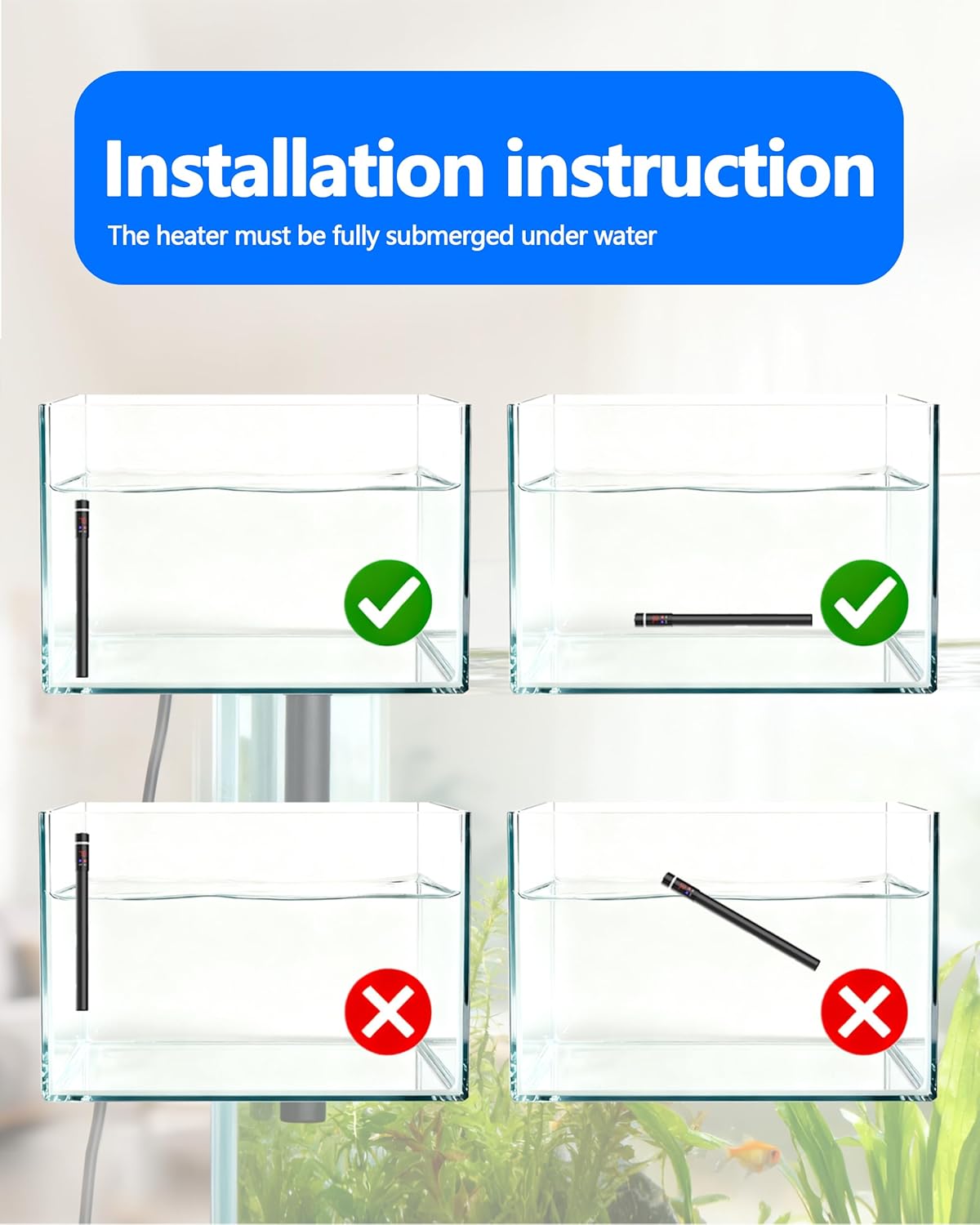 - Directions: IP68 Waterproof, The heater must be fully submerged in water during use., When changing the water in the fish tank, turn off the power 10 minutes in advance.