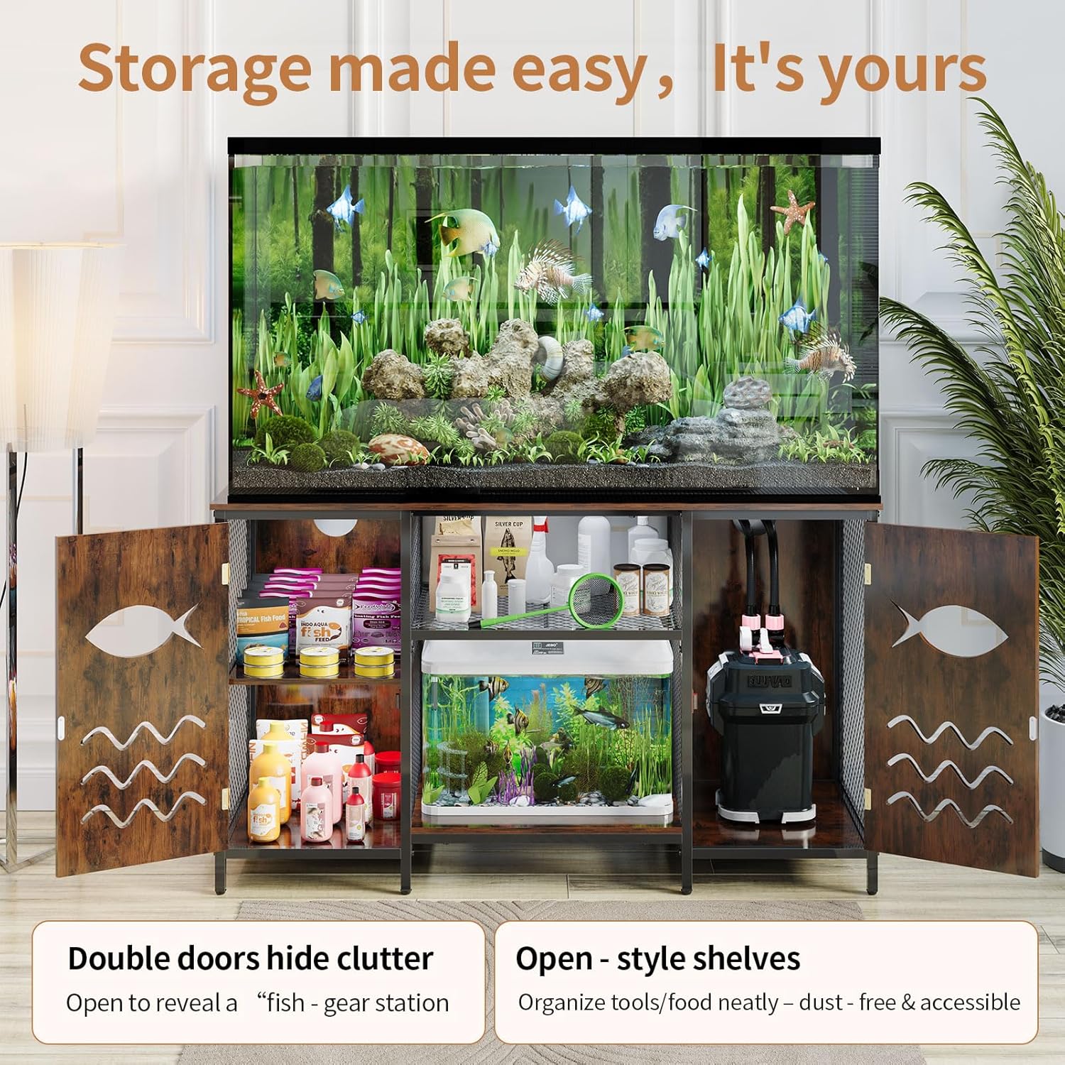 About this item Sturdy Construction: The 55-75 gallon fish tank stand with power outlet is crafted from durable particleboard and a robust heavy-duty metal frame, ensuring stability for your aquarium setup. With a top load capacity of 1000 lbs and a bottom capacity of 350 lbs, this stand can securely hold your aquatic habitats. Ample Storage Solutions: This Heavy duty metal rack for fish tank features generous storage options, including two open shelves for easy access to fish food and cleaning supplies, as well as side cabinets for hiding away accessories. Convenient back openings allow for neat management of canister filters and CO2 tubing. Integrated Charging Station: Experience convenience with our fish tank stand that includes power outlets with switches, providing 2 AC outlets and 2 USB ports. Ideal for powering aquarium heaters, filters, and lighting, this feature enhances functionality while keeping your setup organized. Versatile Aquarium Support: Designed to accommodate both a 55-75 gallon fish tank on top and an additional 10 gallon aquarium below, this rustic wood aquarium table maximizes your space while allowing you to showcase two tanks simultaneously – perfect for fish enthusiasts and reptile lovers alike! Stylish and Unique Design: This 55-75 gallon fish tank table not only serves a practical purpose but also adds elegance to your space. The combination of rustic wood paneling and a classic black metal frame complements any home décor, making it a stunning piece of furniture as well as a functional aquarium table. Easy to Assemble: The fish tank stand structure is designed to be simple and easy to assemble. The package includes instructions and all the tools needed for assembly and all parts and accessories are labeled. Please follow the instruction steps for assembly! Please feel free to contact us for any questions during the assembly process. › See more product details