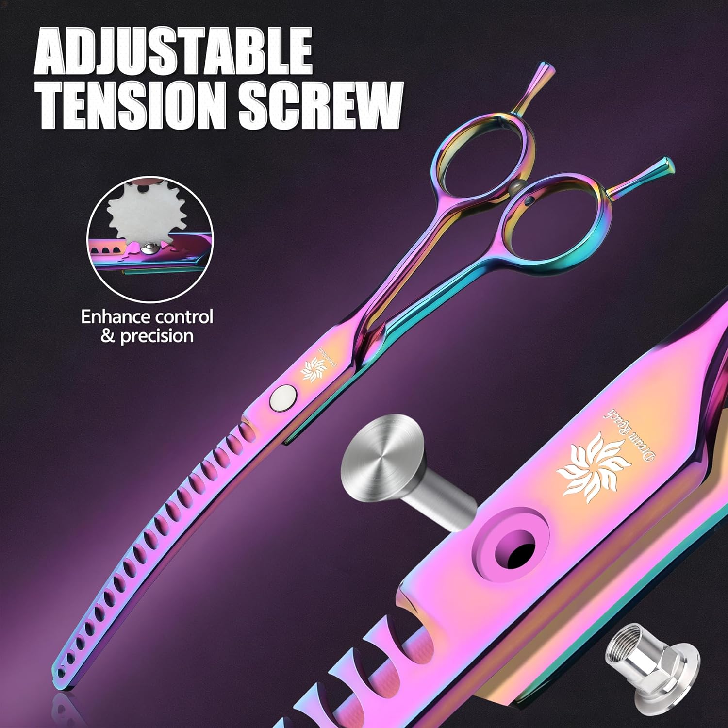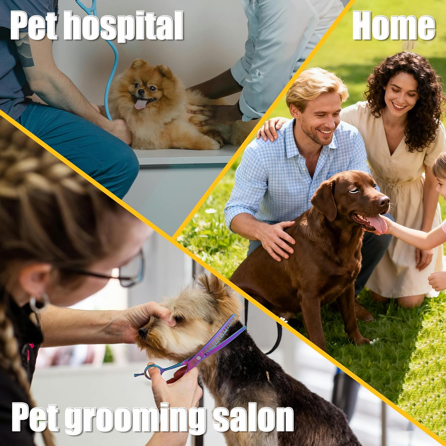 About this item 18 Tooth blender/thinner shears for Left and Right handed pet groomers, made from 440C Japanese stainless steel for strength and durability. Professional dog chunker shears is used for shortening, texturizing and blending.It helps to create a natural look for your pet at home. Thinning Rate: 40-50% Can be used for small, medium and large pets with thick coats or long&short hair. Especially effective around the face and the inside corners of the eyes. Finger hole design is moderate, both men and women's hand are suitable.custom design to best fit every individual.And no matter how long you use,the thinning scissors will be as sharp as ever. Our scissors are really cut it rather than bend your pet fur. Dog grooming shears designed for ergonomic comfort and precision control. The shears allow you to cut with your elbow in a downward position, reducing stress on your hand, wrist and body. › See more product details