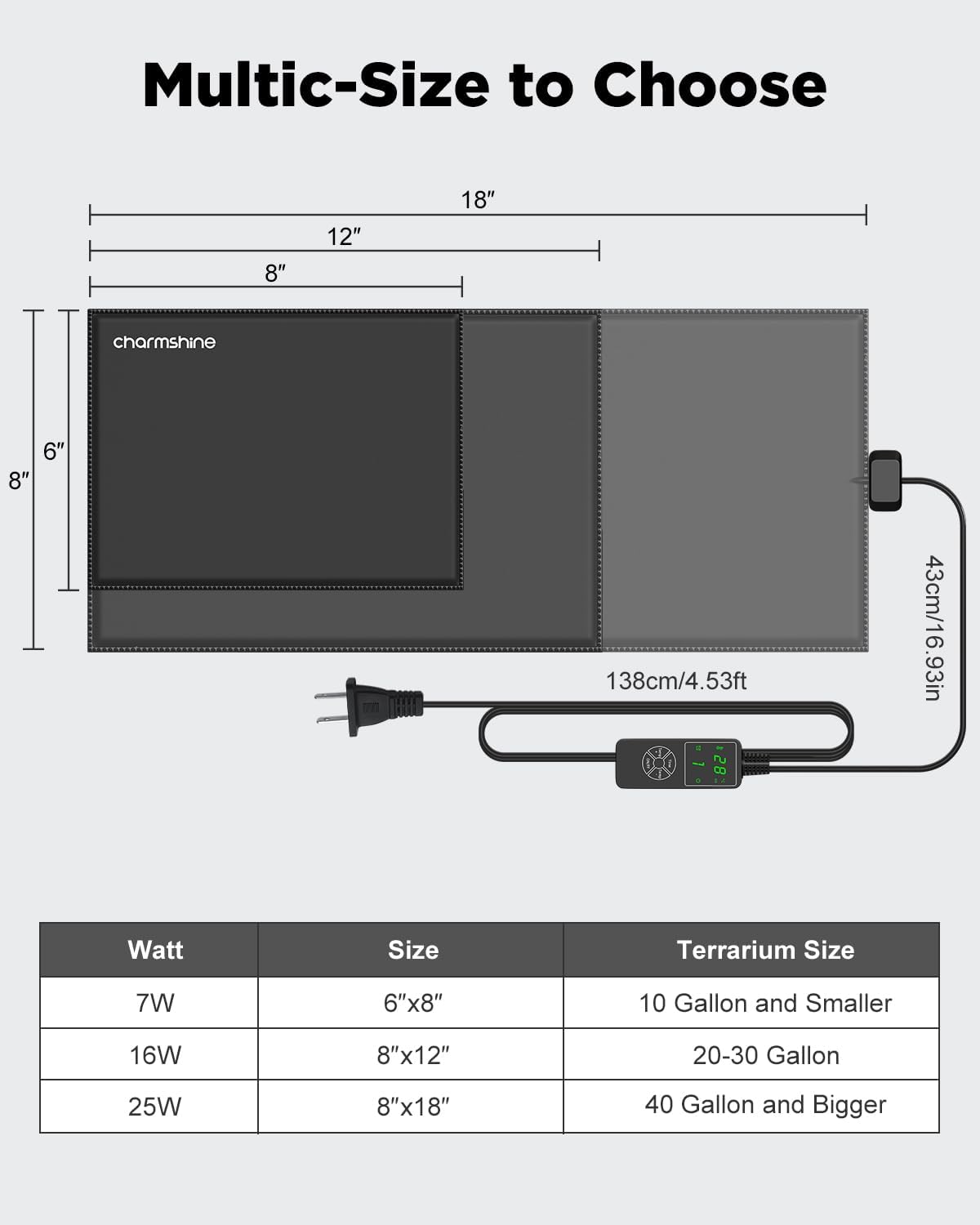 Reptile heating pad with accurate temperature controller, adjustable from 10-50°C (50-122°F), provides a stable and safe heating environment for reptiles, preventing health risks caused by temperature fluctuations Lizard heating pad made with graphene material, it delivers even and efficient heat distribution with deep infrared penetration, promoting reptile metabolism while saving energy. It provides 30% higher energy efficiency and a longer lifespan compared to ceramic or metal heaters Reptile heat mat equipped with 0-12 hour timer functionality to automatically maintain day/night temperature cycles. IPX5 water-resistant rating protects against accidental spills, making it safe and durable even in humid environments Snake reptile heat mat can be placed under the terrarium tank (for ground-dwelling species) or mounted on the side (for arboreal reptiles), offering flexibility for different habitat setups. (NOT INCLUDED ADHESIVE) Reptile heating pad comes in three size/wattage options. Please refer to the product images to select the appropriate size for your terrarium.It’s also great for amphibian, small animal, or plant terrariums › See more product details