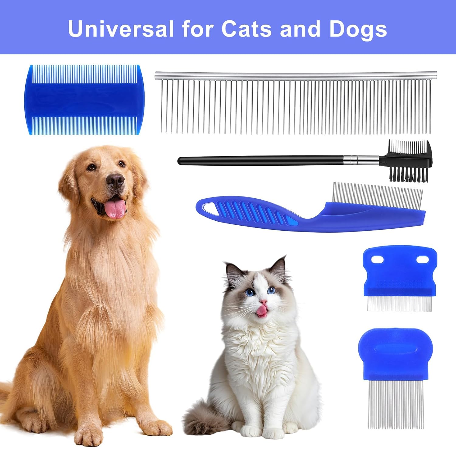 • Design Each pet comb for cats and dogs is sized for precision tear stain comb (6.3×1.2in), long-pin comb (3.1×2.2in), and compact flea and tick comb (3.5×2in) fits paws perfectly. The Pets Grooming Comb Kit comes in a portable blue case (9.45×4.72×0.75in) for travel-friendly care