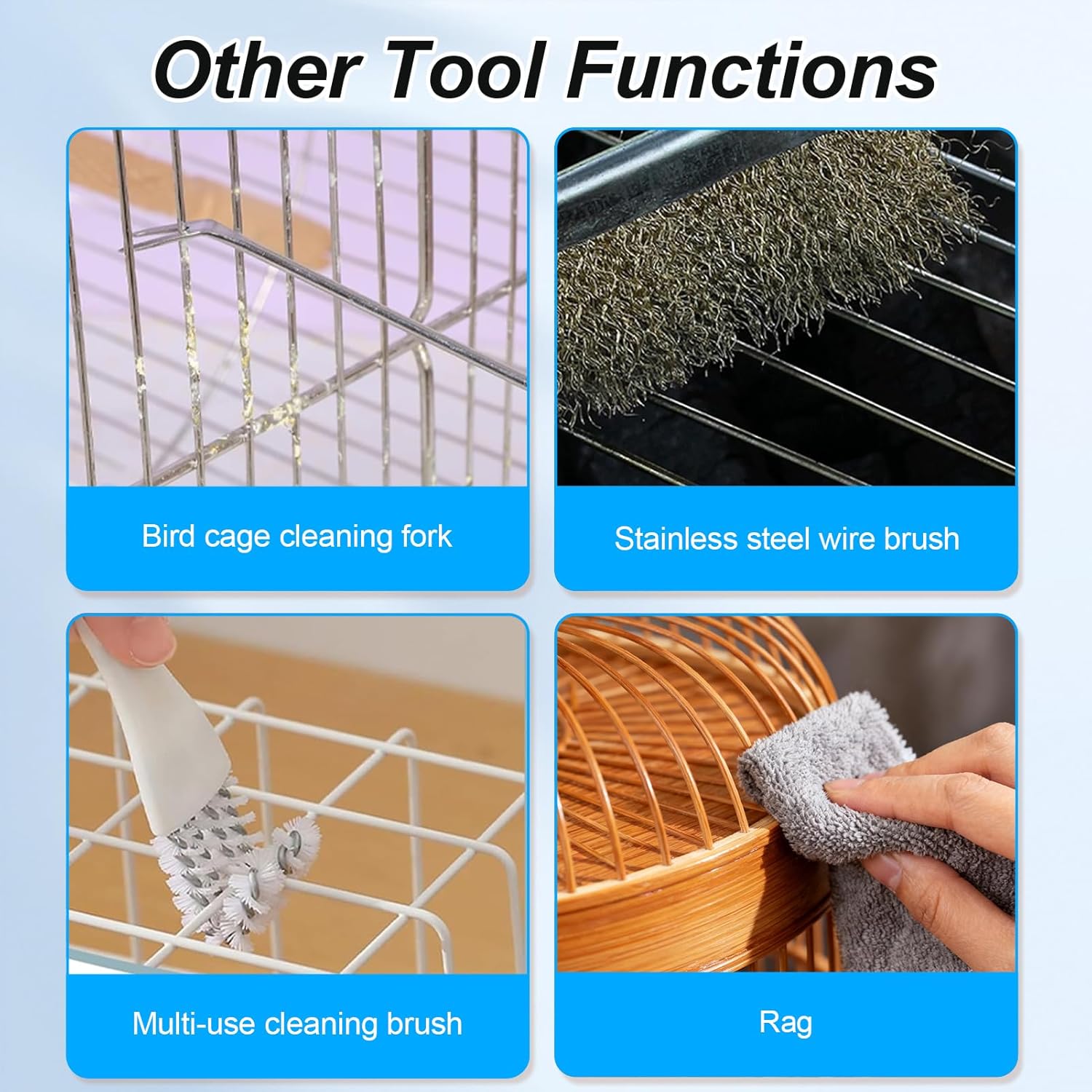 Elevate your bird cage cleaning routine with our 6 PCE Bird Cage Cleaning Set. It combines a Bird Cage Cleaner, reliable Cage Cleaning Brush Tools, a practical Bird Poop Remover, and a handy cleaning towel – all you need for a spotless parakeet or small animal cage.These tools are essential bird cage accessories. The Bird Cage Cleaner and Cage Cleaning Brush Tools get into tight spaces to remove grime. The stainless steel poop remover makes waste removal simple, and the cleaning towel is perfect for quick wipes. Whether you're caring for parakeets and using parakeet cage accessories or maintaining other small animal cages, this set is up to the task.Not only does this kit offer top - notch cleaning performance, but it's also built to last. Each component is durable, designed for repeated use. The inclusion of the cleaning towel adds extra convenience, ensuring you can keep cages and tools clean with ease. Choose this set to provide a clean, healthy home for your feathered or small animal companions.