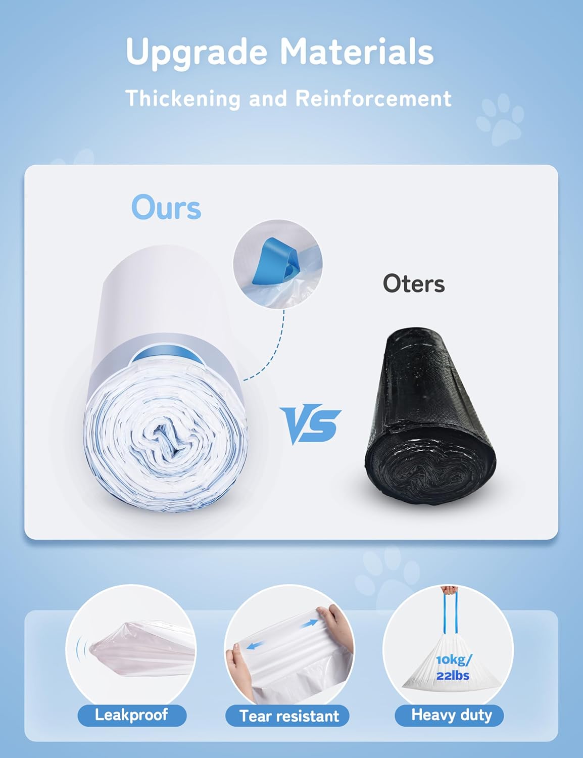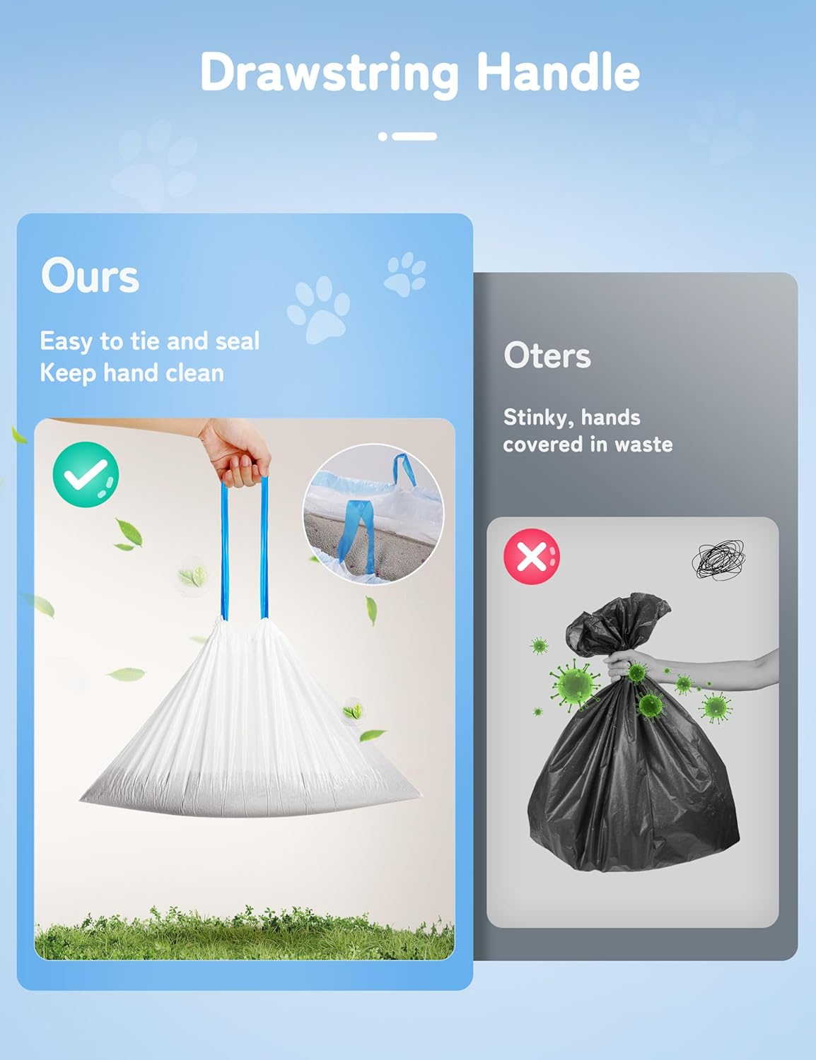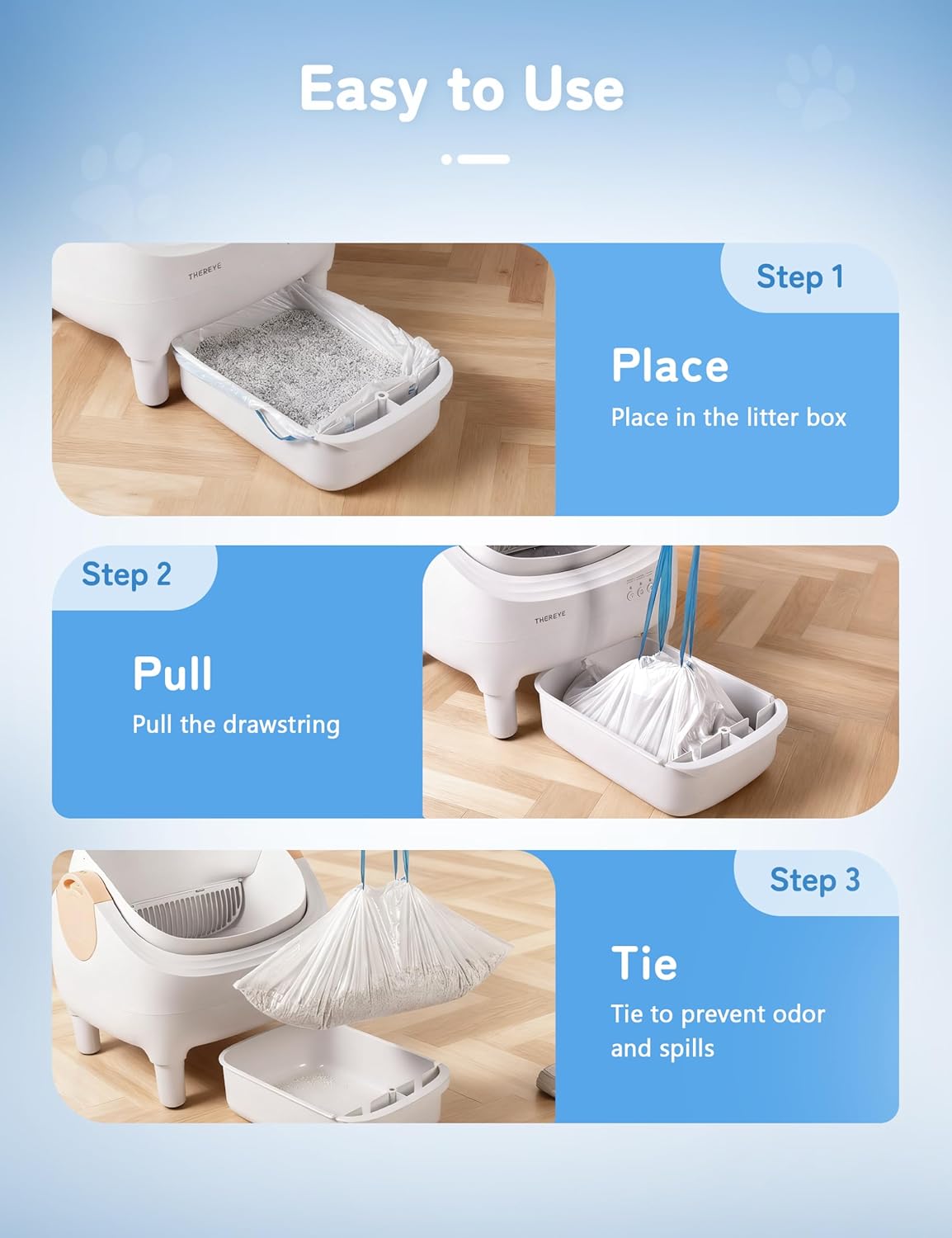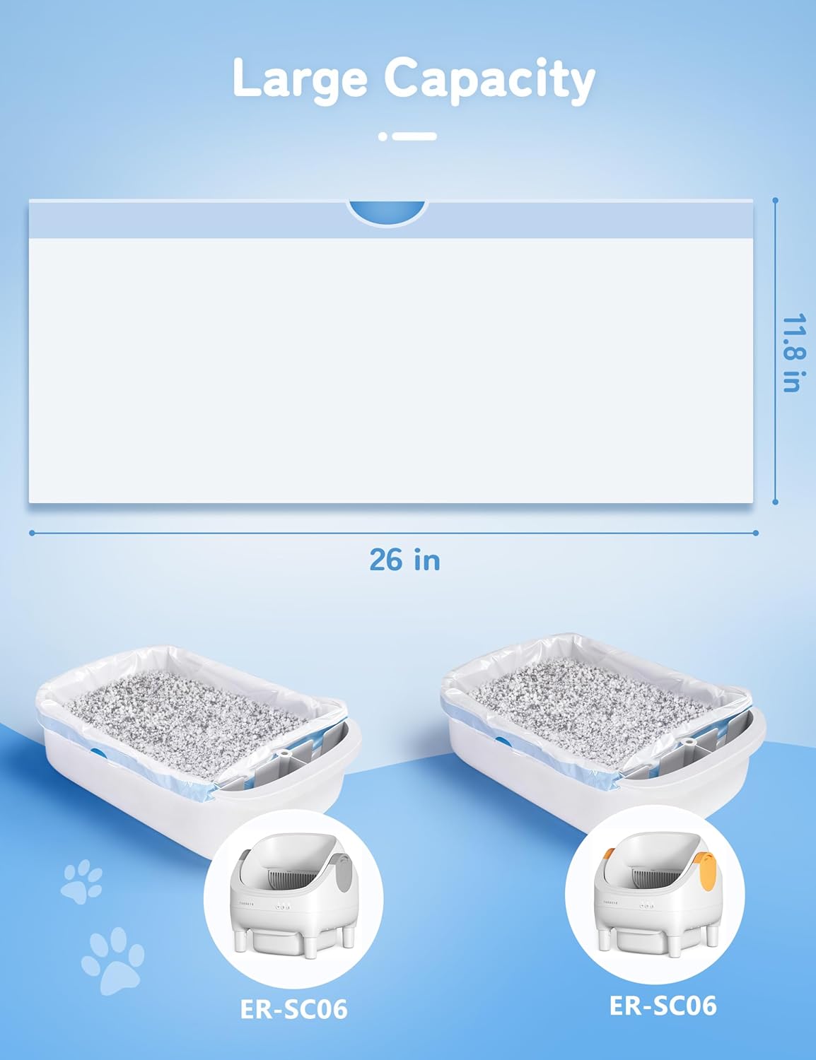 Upgrade your Thereye SC06 automatic litter box experience with these heavy-duty drawstring waste liners. Designed to fit the SC06 waste drawer perfectly, each liner stays flat and stable during the self-cleaning cycle, preventing slipping or shifting. Made from reinforced, leak-resistant material, these liners resist tearing and spills, even under frequent use or in multi-cat households. The dual-drawstring closure makes disposal fast, clean, and hands-free, helping contain odors and keeping your home tidy. With a spacious 26" × 11.8" size, each liner can hold up to 22 lbs of litter and waste, reducing the need for constant replacement. The package includes 60 liners (3 rolls of 20), providing long-term convenience for daily litter maintenance. Easy to replace, durable, and leak-proof—these liners simplify cat care while keeping your space fresh and clean. Perfect for: Thereye SC06 automatic litter box owners, multi-cat homes, and anyone looking for hassle-free, sanitary litter disposal.