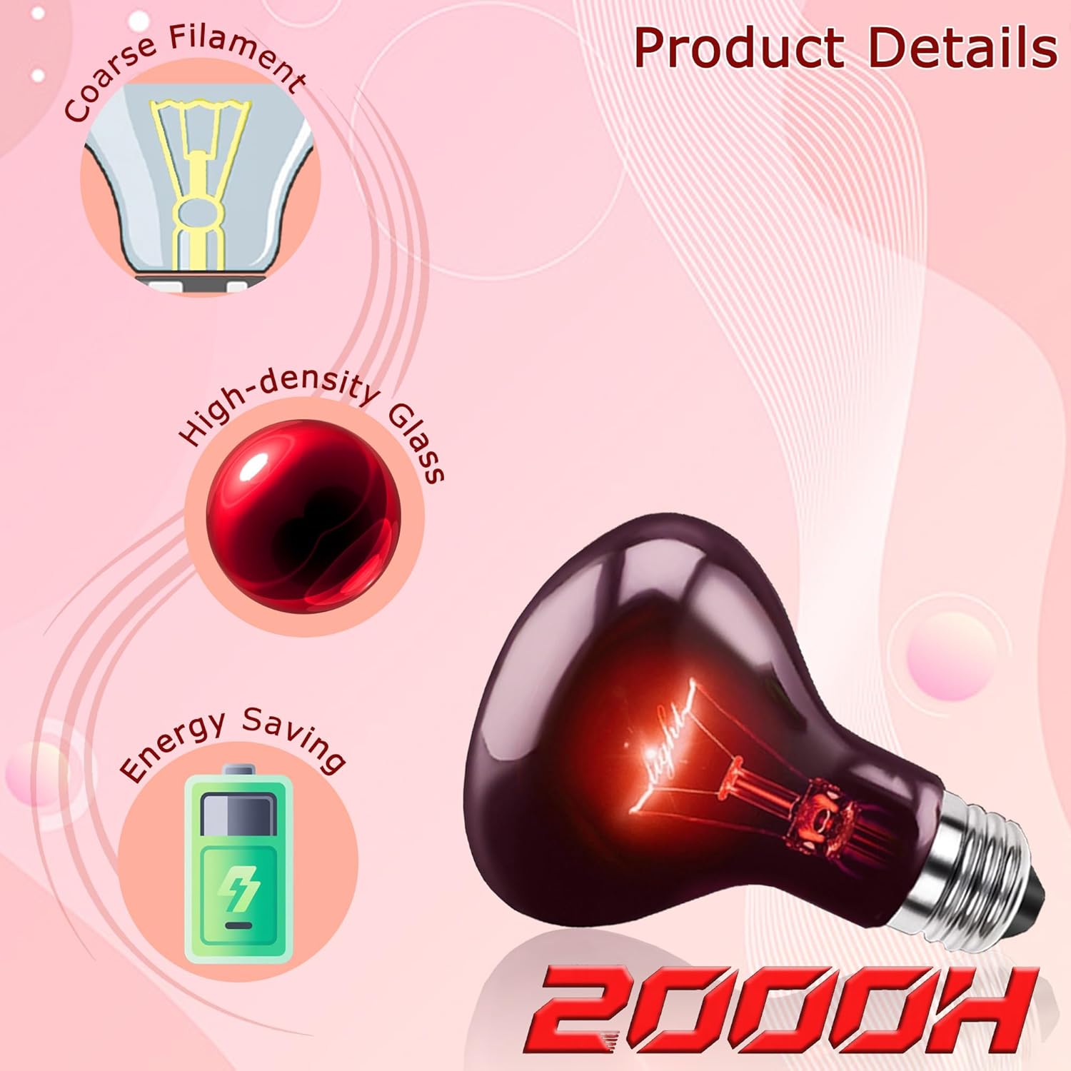 About this item Infrared Heating: Red infrared lamp delivers efficient heat to maintain consistent terrarium temperature, supporting reptile metabolism, activity, and natural behaviors. All-Day Comfort: Gentle red light suitable for both day and night use, creating warm basking zones without disturbing reptiles’ normal day-night cycles. Extended Lifespan: Advanced vacuum aluminum coating and improved manufacturing provide longer-lasting performance, reducing frequent bulb replacements. Soft, Non-Intrusive Light: Emits low-glare red light for a safe and comfortable environment, allowing easy observation without stressing pets. Versatile Use: Perfect for reptiles, amphibians, and small pets including bearded dragons, geckos, turtles, snakes, chameleons, frogs, chicks, and other birds. Glass is fragile. For issues, contact Support. › See more product details