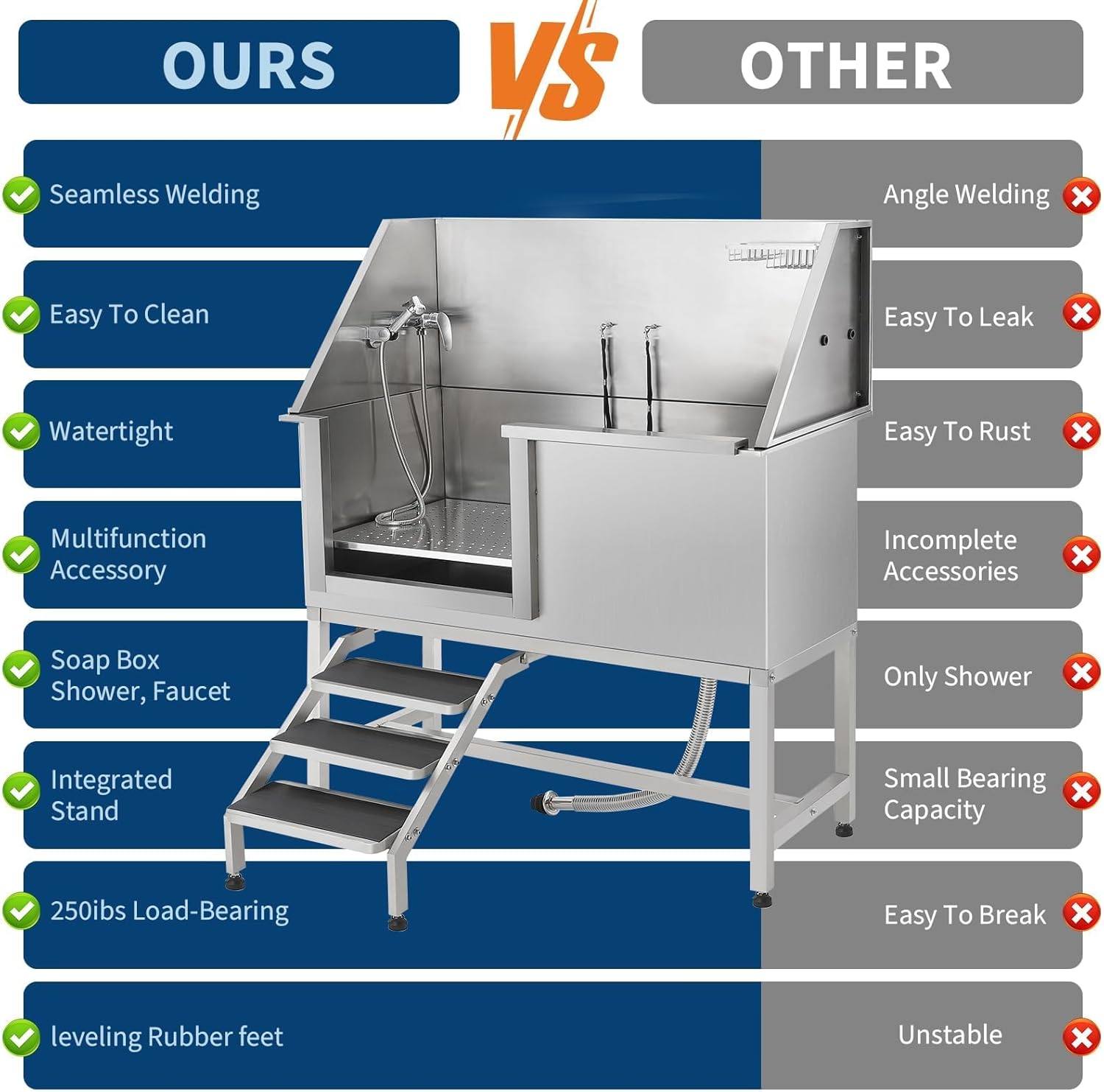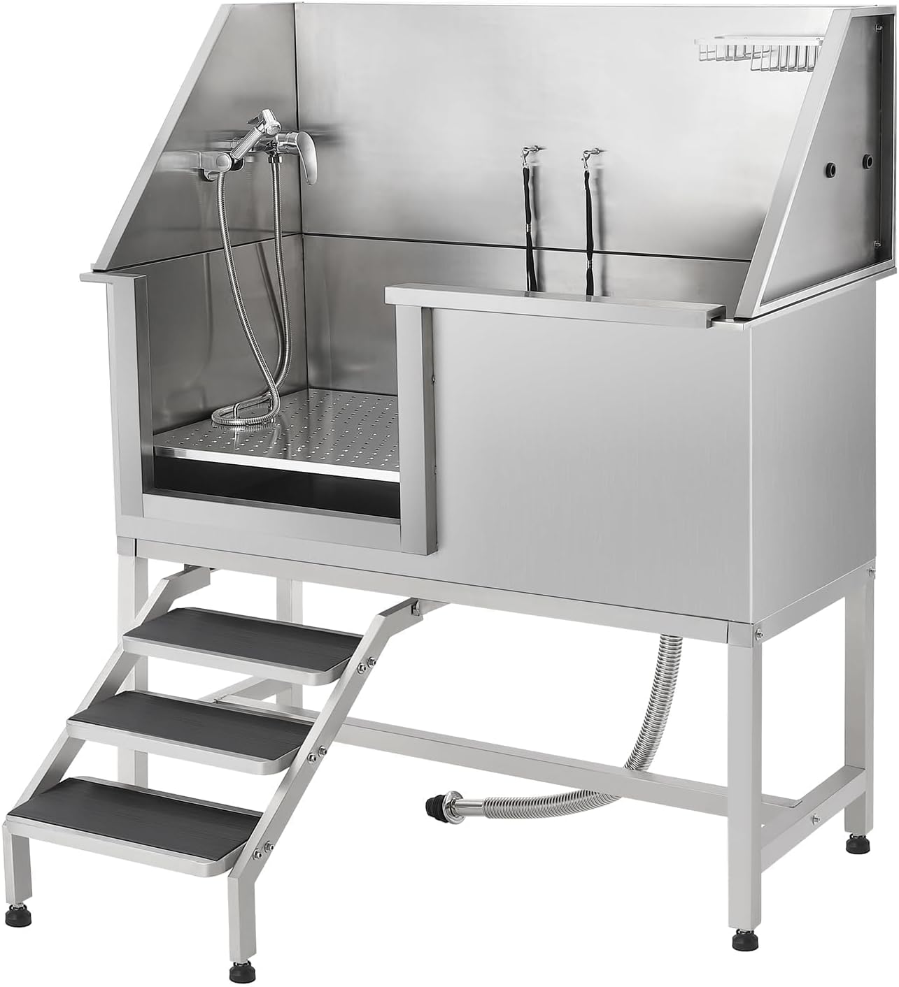 Professional-Grade Stainless Steel Build: Crafted from durable stainless steel, this 62 inch dog washing station ensures long-lasting performance and reliability for both professional groomers and pet owners. The integrated staircase enhances stability and access. Safety-Enhanced Washing System: Features sliding doors, a gentle entry ramp, and secure floor grilles designed to simplify bathing while prioritizing your pet's safety during every wash at the dog washing station. Adjustable for All Dog Sizes: Accommodate dogs of any breed with our height-adjustable dog washing station, available in large, medium, and small configurations. Provides a comfortable and efficient washing experience for every furry friend. Complete Grooming Accessories Included: This versatile dog washing station comes equipped with a professional faucet, dog leash anchor point, and a practical drying rack, offering a comprehensive grooming solution right at home. Space-Saving & Portable Design: The folding up construction of this dog washing station (including the staircase) makes storage and transport easy, ideal for homes, mobile groomers, or outdoor use while saving valuable space. › See more product details