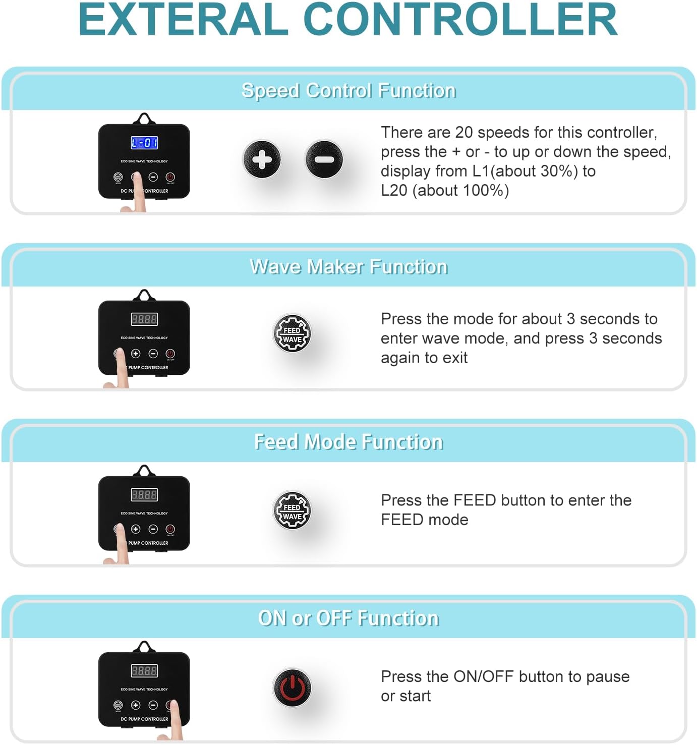 About this item JEREPOND Nano 660GPH Max flow aquarium return pump, ECO 25W DC24V return pump with 20 speeds controller, 10 feet max lift;pump dimension (L*Wx*H):5.4*2.6*3.6 inches.3 working modes; DC24V Controllable Aquarium water pump:20 speed adjustable,LCD display the speed and working status,can adjust the flow from 30% to 100% of max flow,with 10 minutes feeding mode and wave maker mode Ultra quiet operation long durability aquarium water pump:with seal impeller and ceramic shaft, high efficient and quiet operation, nosie level lower than 25 dba; Lower Water intake Screen Cover DC return pump: comes with 2 kinds of intake screen cover, can be used in lower water level suction, Wide applicaion and Safty pump: can be used as salt water or fresh water aquarium sump pump, fountain pump,hydroponics pump and waterfall pump;can be used as sumbersible pump and inline pump;the pump comes with smart contoller and DC24V power supply adapter,pump will automatically shut off when the pump run dry or blocked;safty for you and your fish. › See more product details