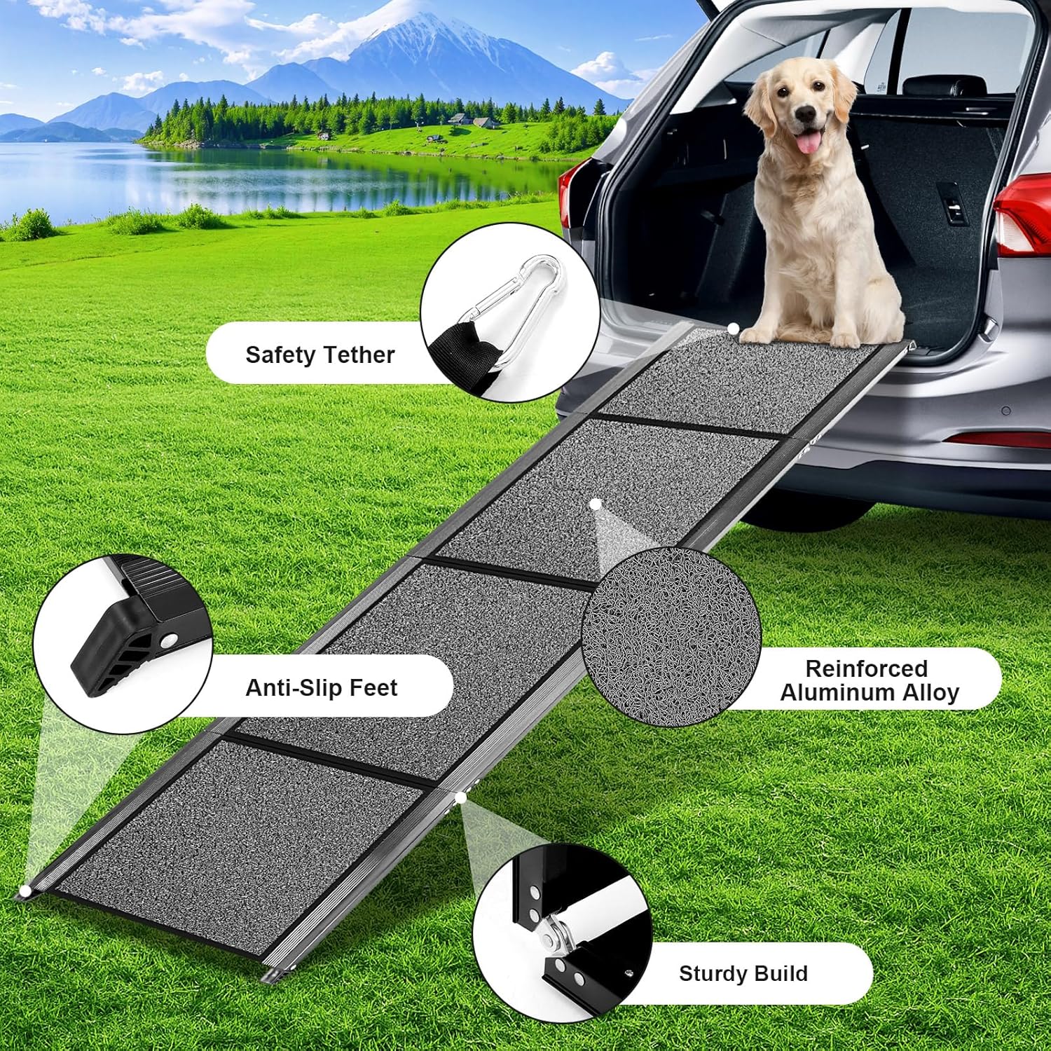 About this item 【Upgraded Anti-Slip Safety】 Pet ramp features a rugged, non-slip wire loop fabric and anti-skid base mats crafted from PVC looped fibres. Dog stairs offers superior grip, reduces impact on paws and joints, and ensures confident steps for your pet. Complete with a safety rope and stainless steel buckles, this ramp offers extra security 【Size Selection Tips】 Please measure the height of the car trunk before purchase to choose the right size. Please choose 67 inches length if the car trunk height is under 28 inches, and 71 inches length if the car trunk height is 28-33 inches 【250LB Capacity】 Built with reinforced thickened aluminum alloy frame, this dog steps for truck offers exceptional stability and supports up to 250 lbs. Dog car ramp includes a safety rope and stainless steel buckles for added security and peace of mind 【4-Fold Compact & Portable】 Folds neatly into a compact 17” x 17” x 5.6” size for effortless storage in car trunks, under furniture, or tight spaces. Weighs only 18 lbs and includes a carrying handle and safety strap for easy transport 【Versatile for Indoor & Outdoor Use】 Ramp for dogs to get in car perfect for helping dogs enter vehicles, climb onto couches, beds, or navigate indoor steps. Suitable for small, medium, and large breeds—wherever elevation is a challenge › See more product details