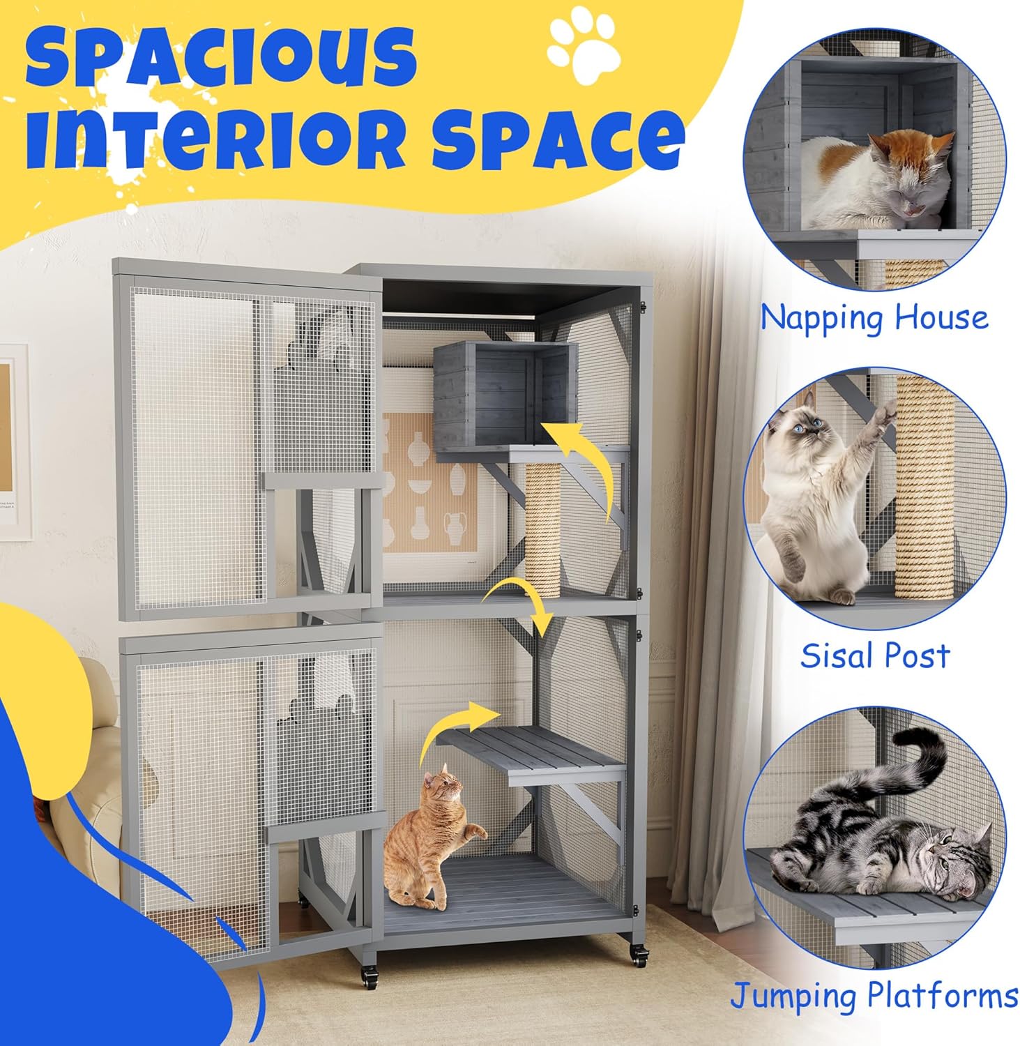 Create the perfect playground for your cats with our spacious 4-tier catio, featuring a cozy napping house, easy mobility, and a durable design that connects indoor and outdoor adventures!Highlights at a Glance:Includes four luxury locks for enhanced security and peace of mindSpacious 68 Inch catio design for 2-3 catsConvenient outdoor cat enclosure with wheels for easy mobilityDurable wood construction with weather-resistant roofVersatile configuration with 180° rotation and dual sliding doors.Specification:Material: Wood+MetalDimension: 67.99x32.28x31.1 inchesPacking List:1xOutdoor Catio1xInstruction Manual1xAssembly KitNote:Before purchasing, please measure your available outdoor space to ensure the catio fits comfortably. Consider nearby structures and any potential obstructions to maximize the area for your cats.Please refer to the installation instructions provided. Make sure you have the necessary tools and assistance if needed, and allow enough time for setup.