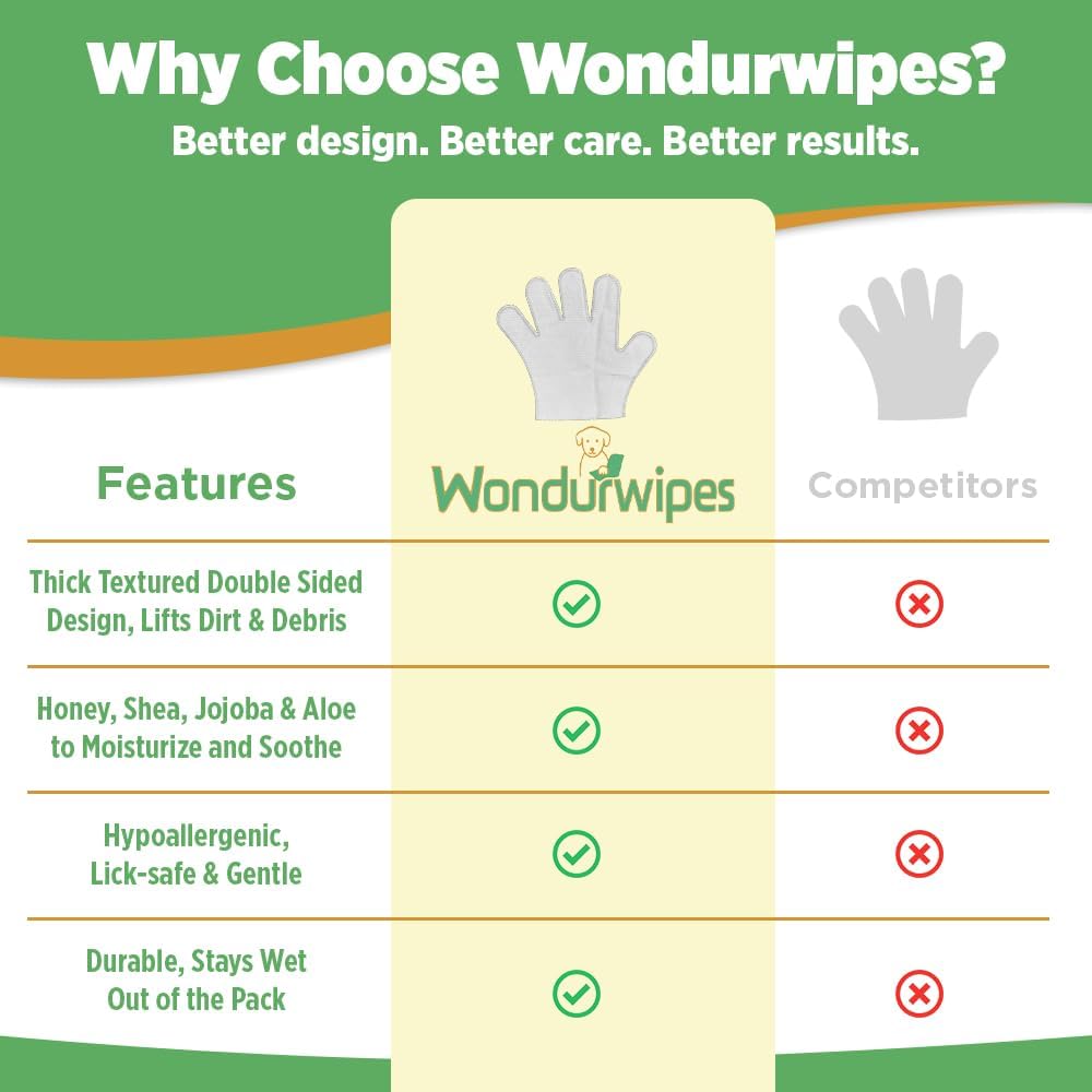 GLOVE DESIGN: Unique slip-on wipes provide flexible cleaning of paws, face, and coat while giving pets a gentle massage that removes dirt, odors, and dander - a great alternative to standard pet wipes. NOURISHING FORMULA: Enriched with aloe vera, honey, shea butter, and jojoba oil, these hypoallergenic wipes clean and nourish sensitive skin on dogs and cats of all sizes. NO-RINSE SOLUTION: Free from harsh chemicals and dyes, these pet wipes are safe if licked, making them perfect for waterless cleaning of pets who don't enjoy traditional baths. DURABLE CONSTRUCTION: 25% thicker than standard wipes with textured design that resists tearing, can be used on both sides, and effectively removes dirt and debris from your pet. VERSATILE USE: Perfect for everyday grooming of dogs, cats, and even horses, these wipes keep all your animals clean, fresh, and comfortable whether at home or on-the-go. › See more product details