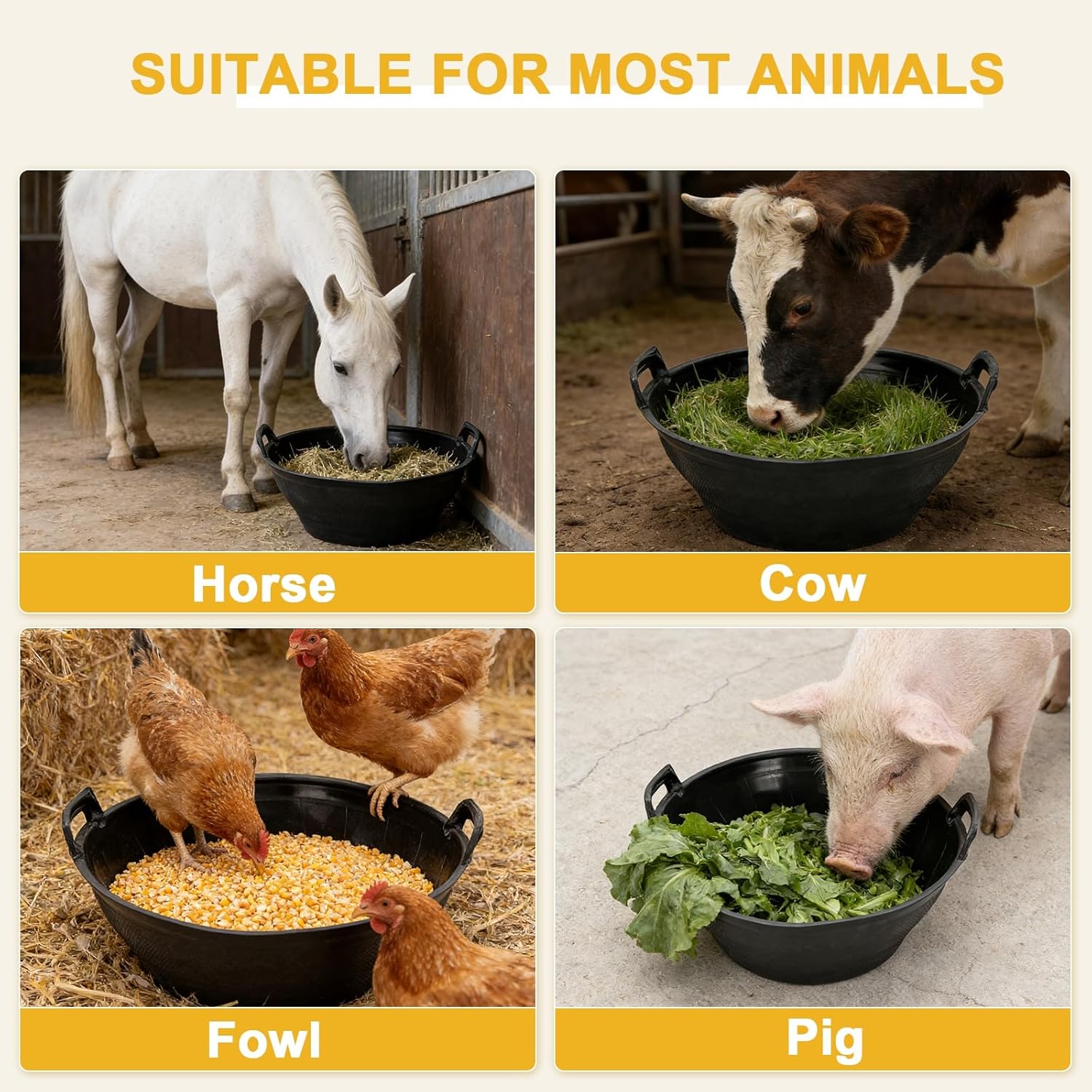 About this item Appropriate size: Each rubber bucket has an bottom diameter of approx. 9.8 inches and a height of approximately 5.8inches, providing enough space to accommodate a large amount of feed and prevent food spillage; Each rubber dog bowl weighs 2 LB and is not easily overturned or kicked over. Heavy and Thick: Our feed pan is made of high-quality rubber material, with a thickened barrel wall design that is durable and will not break even under prolonged exposure to the sun; In addition, there may be an odor when you receive the horse feed bucket. Please store it in a well-ventilated place for a few days after receiving it. Value Pack: You will receive 6 rubber tup with a capacity of approximately 3 gallon, which have a wide range of applications and are suitable for small pets such as cat,chickens, ducks, goats, piglets, and puppies. The horse buckets for water provide a multifunctional feeding solution for your furry or feathered companions. Handle Design and stackability: They all come with handles, easy for moving.These horse feed buckets are flexible and can be subjected to compression; they can be stacked in multiples; their stackable design allows for easy storage and saves you space; and they can withstand low temperatures, ensuring that they can be used even when temperatures drop. Wide Application: The multifunctional design meets the needs of different animals, whether it is filling water or food for your pet, livestock water trough is a suitable feeding solution; This horse trough pot is an ideal choice for farms, zoos, or pet enthusiasts who need reliable and sturdy feed containers › See more product details