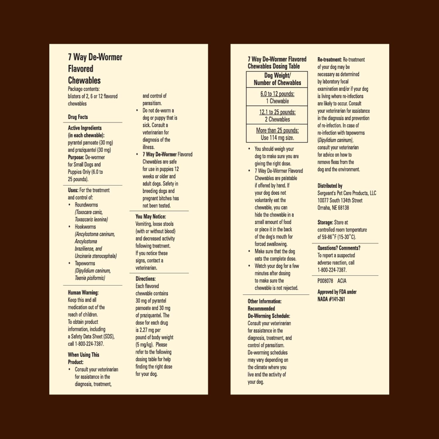 - Directions: SENTRY Worm X Plus 7 Way De-Wormer - Small Dogs (6 count) is for the removal of large roundworms, hookworms and tapeworms in small adult dogs or young dogs, weighing 6 to 25 lbs. This effective remedy comes in the form of chewable, flavored tablets to easily administer to your dog through food. Keep your dogs protected and eliminate those parasites! For puppies & small dogs from 6 lbs. to 25 lbs. Treats & controls 7 species of worms 2 tapeworms, 2 roundworms & 3 hookworms 4 flavored chewable tablets. Treat once a month. Contains Veterinary brand ingredients Pyrantel Pamoate and Praziquantel.