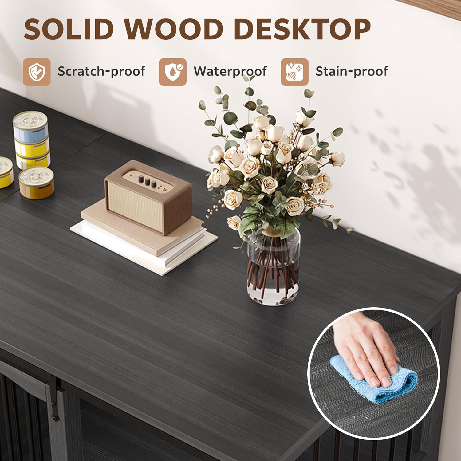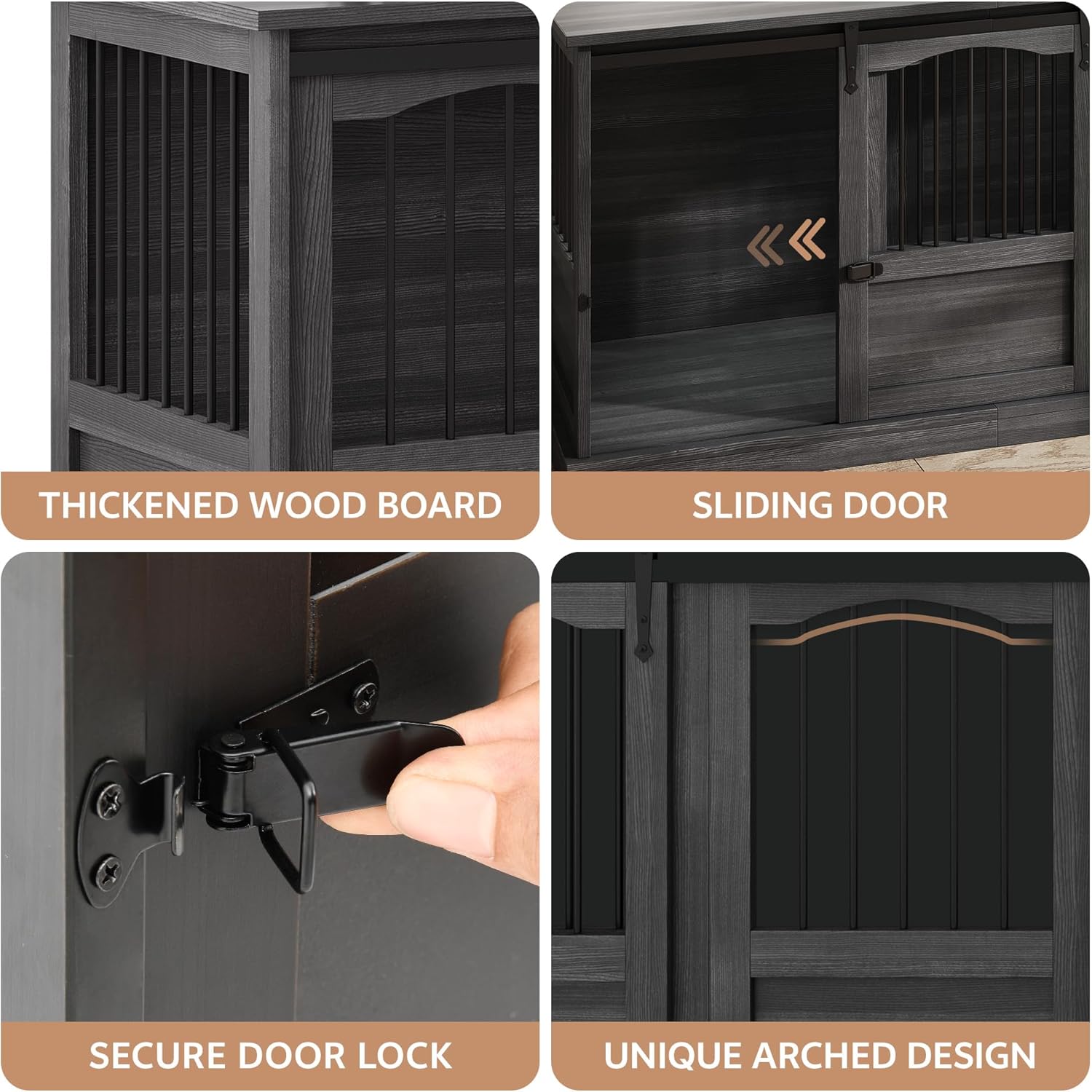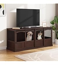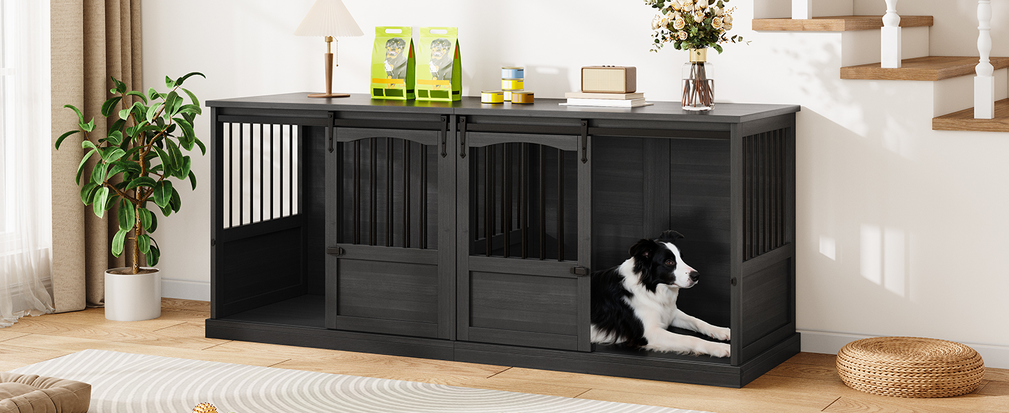 About this item This wood dog cage has 2 rooms, and the internal dimensions of each room are: 34.45" x 21.26" x 26.77". It is ideal for 2 large dogs. Your beloved pets can turn around freely, stretch their limbs, and lie down comfortably. Crafted with thickened metal tubing and solid heavy-duty wood, this dog kennel furniture withstands energetic chewers and daily wear. More than just a pet kennel, this dog kennel table also serves as a functional TV stand or end table with a spacious 70.86" x 23.62" wooden surface. Ideal for placing your TV, dog's food, or family photos, it seamlessly blends into living rooms, bedrooms, or home offices. It features 2 smooth sliding doors for effortless access, making it easy to let your dog in or out. The elegant arched door complements both modern and traditional decor. This extra large dog crate table comes with all necessary components, clearly labeled for easy setup. The smooth solid wood surface also makes cleaning a breeze. › See more product details