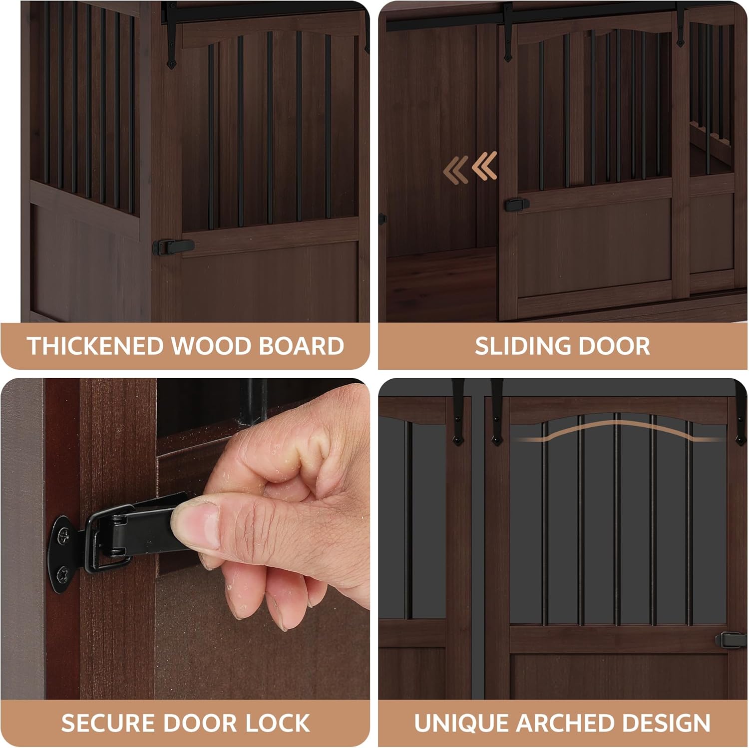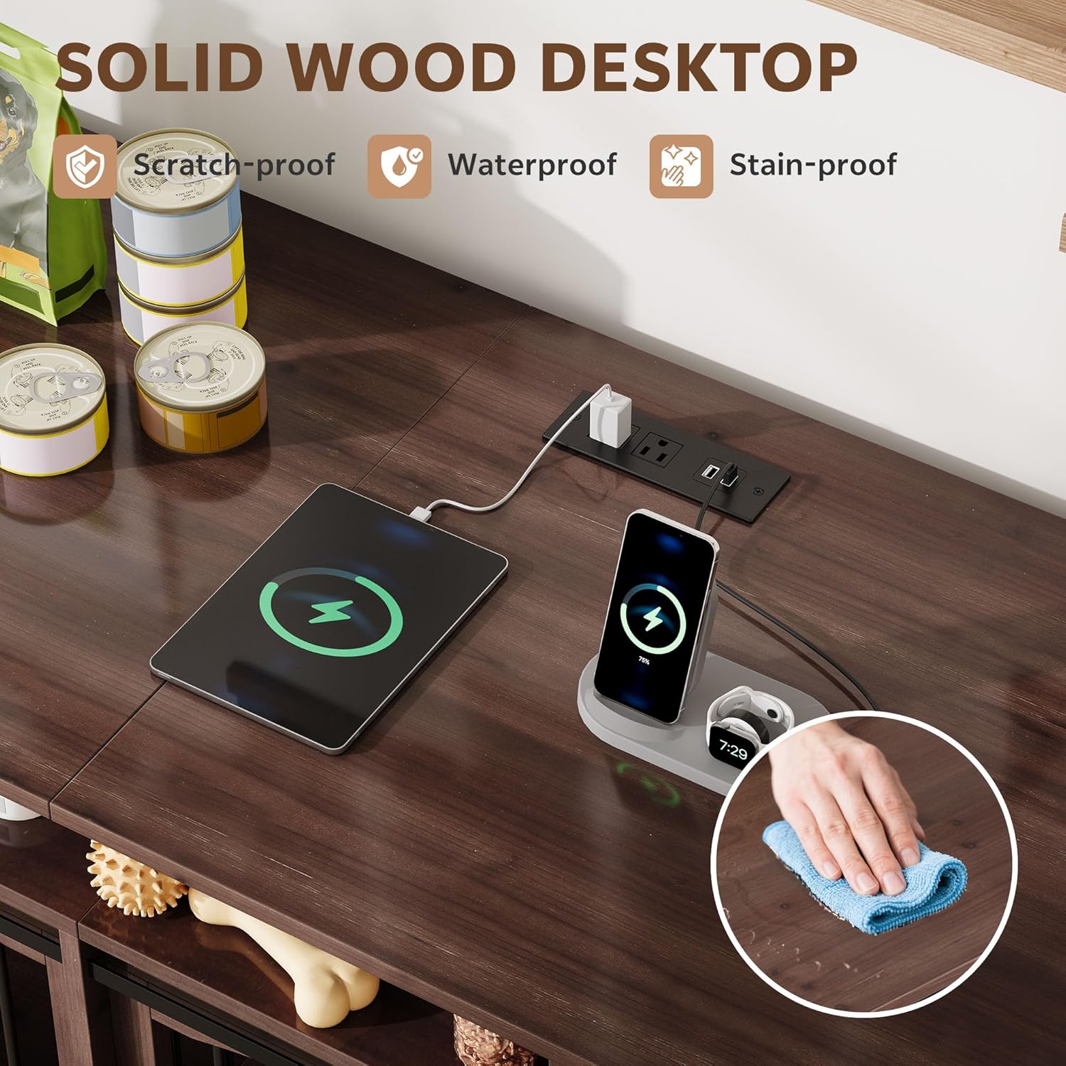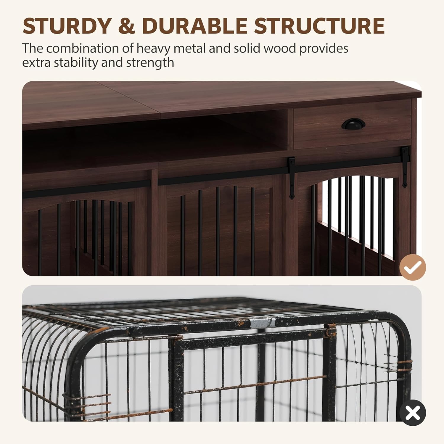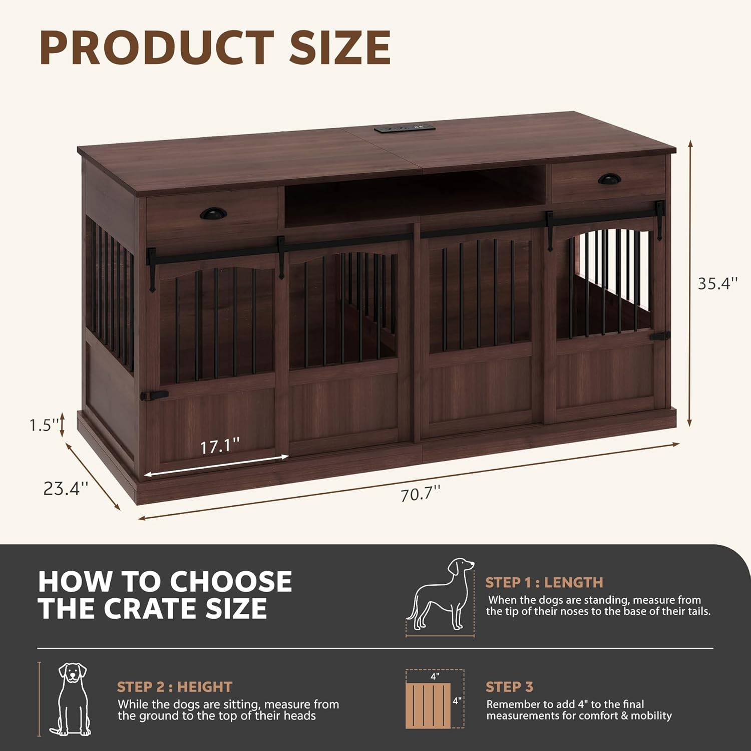 About this item This wood dog cage has 2 rooms, and the internal dimensions of each room are: 53.54" x 23.62" x 29.52". It is ideal for 2 large dogs. Your beloved pets can turn around freely, stretch their limbs, and lie down comfortably. The dog cage with storage features built-in power outlets, including 2 AC outlets and 2 USB ports, which can charge devices such as your TV, mobile phone etc. The wooden dog kennel indoor comes with two storage cabinets and two open shelves, which are ideal for storing dog treats, canned dog food, and other pet supplies, helping to keep them organized. Crafted with thickened metal tubing and heavy-duty solid wood, this dog kennel furniture withstands energetic chewers and daily wear. More than just a pet kennel, this dog kennel table also serves as a functional TV stand or end table with a spacious 70.86"x23.62" wooden surface. Ideal for placing your 80-inch TV, dog's food, or family photos, it seamlessly blends into living rooms, bedrooms, or home offices. This extra large dog crate table comes with all necessary components, clearly labeled for easy setup. The smooth solid wood surface also makes cleaning a breeze. › See more product details