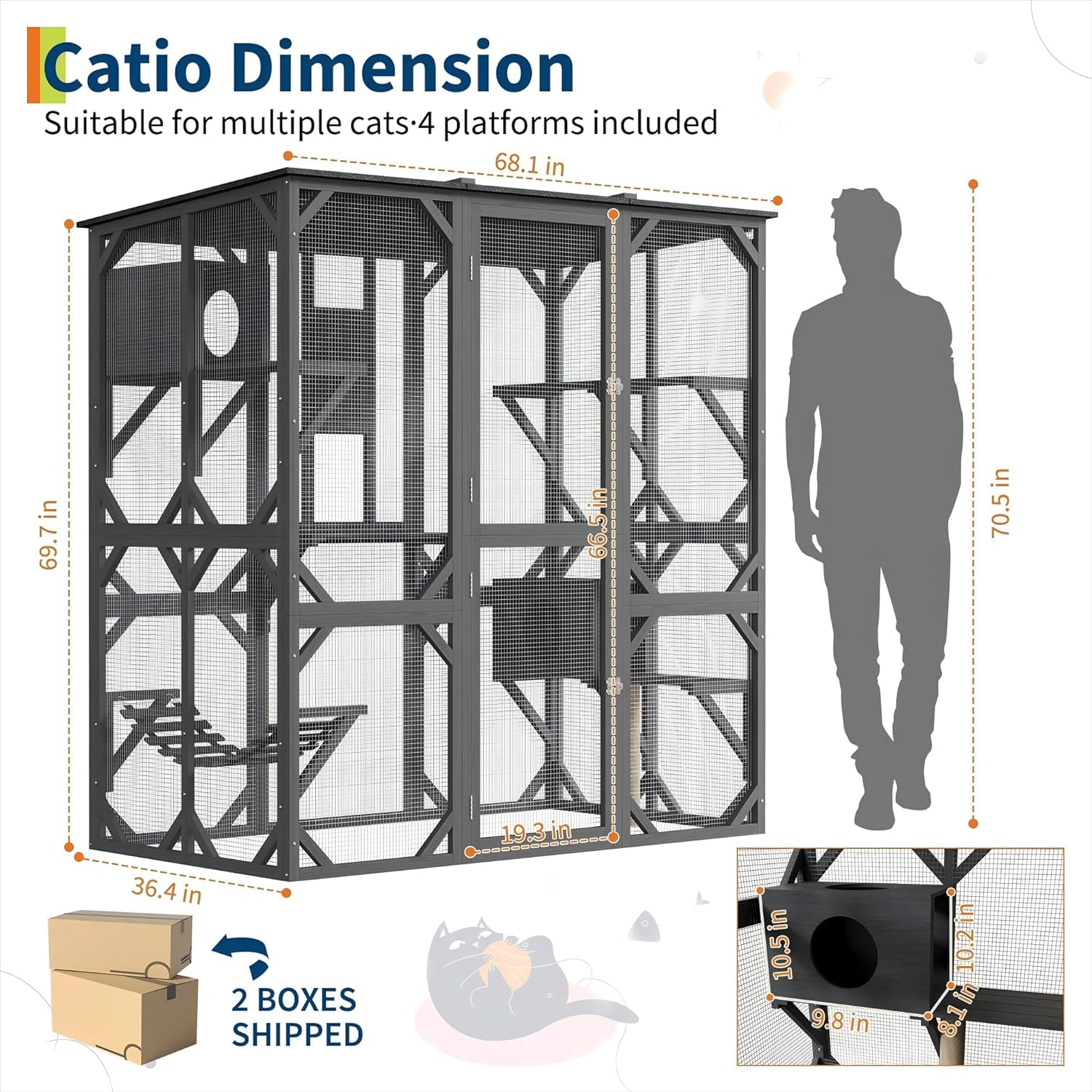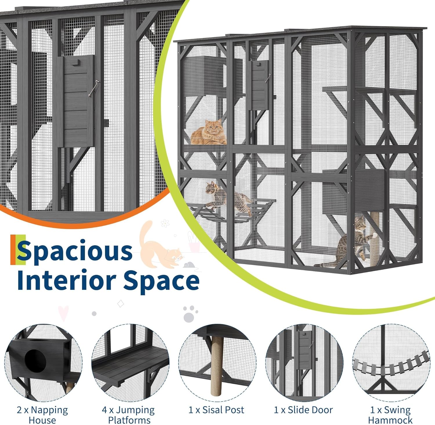 About this item Ample Space for Activity: This walk-in outdoor cattery features multiple jumping platforms, providing your cat with plenty of room to jump, climb and explore. These platforms are cleverly set at different heights to provide cats with natural climbing opportunities, encouraging them to be physically active and mentally stimulated. Multifunctional House for Cats: The wooden cat catio enclosure is equipped with a sturdy scratching post and hammock to satisfy your cat's natural instinct to scratch and explore. The cat cage includes two comfortable sleeping houses at different heights, providing your cat with a safe and private rest and sleep space. Premium Solid Wood Material: The cat cage adopts high-quality fir wood frame, and the anti-bite galvanized wire mesh has excellent performance, ensuring that your cat is safe in the cage. The wire mesh provides a transparent and unobstructed view, satisfying the curious and observant nature of cats. Weatherproof Roof: The large window catio roof adopts a black-gray asphalt roof, which provides cool shade on sunny days, is waterproof and rainproof, and can withstand all kinds of bad weather, providing a dry and comfortable space for your pet. Suitable for All Breeds and Ages: The outdoor patio cat enclosure platform adopts a stepped design, allowing cats to move up and down easily. The cat house with a sleeping house provides a soft and warm resting place.The small sliding door on the back can be connected to the window for your cat to enter and exit the home freely (Note: The catio is delivered in two packages, arrival times may differ. Please be patient). › See more product details