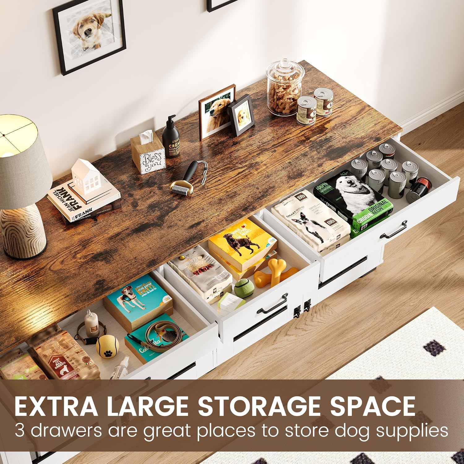 About this item 【Multi-Use Design】This 71'' dog crate furniture functions as both a spacious dog kennel indoor and a stylish TV stand or end table. Its farmhouse and modern design seamlessly complements your living space while maximizing the use of available room for both pets and home decor. 【Extra Large Space】Designed for large and medium dogs, this XXL dog crate offers a roomy interior for comfort and movement. Perfect for households with multiple pets, this large dog crate ensures enough space for sleeping, relaxing, and playing, making it ideal for dog crates for large dogs. 【Removable Divider】Featuring a removable center divider, this wooden dog kennel furniture meets versatile needs. Use as two separate areas for privacy or create a single spacious dog crate, increasing flexibility and making it suitable for various dog breeds or two dogs sharing one space. 【Ample Storage Drawers】Three integrated drawers in this dog crate furniture provide convenient storage for dog food, leashes, toys, and other essentials. The broad top is perfect for displaying plants, magazines, or electronics, delivering dog kennel indoor convenience with extra organization. 【Robust & Safe Build】Constructed with thick steel pipes and P2 grade MDF, this heavy-duty indoor dog crate offers excellent stability and chew resistance. The secure structure supports up to 200 lbs inside and 250 lbs on top, ensuring your large or medium dogs have a safe and reliable dog kennel. 【Easy Assembly Process】Enjoy hassle-free assembly with clear instructions, pre-numbered parts, and pre-drilled components. This double dog crate furniture is easy to set up, providing a sturdy dog kennel indoor for large or medium-sized dogs, and enhancing your space with both style and functionality. › See more product details